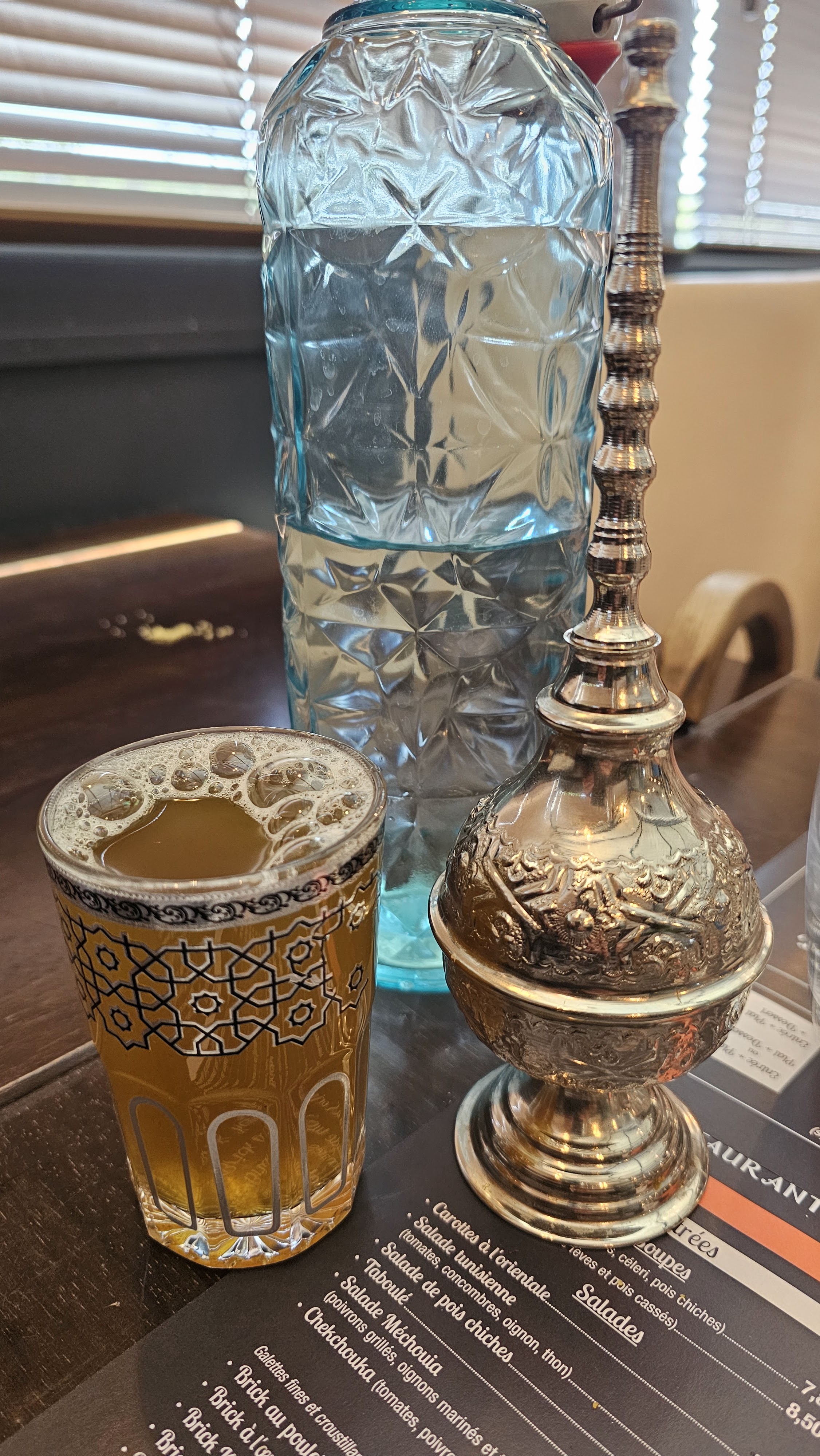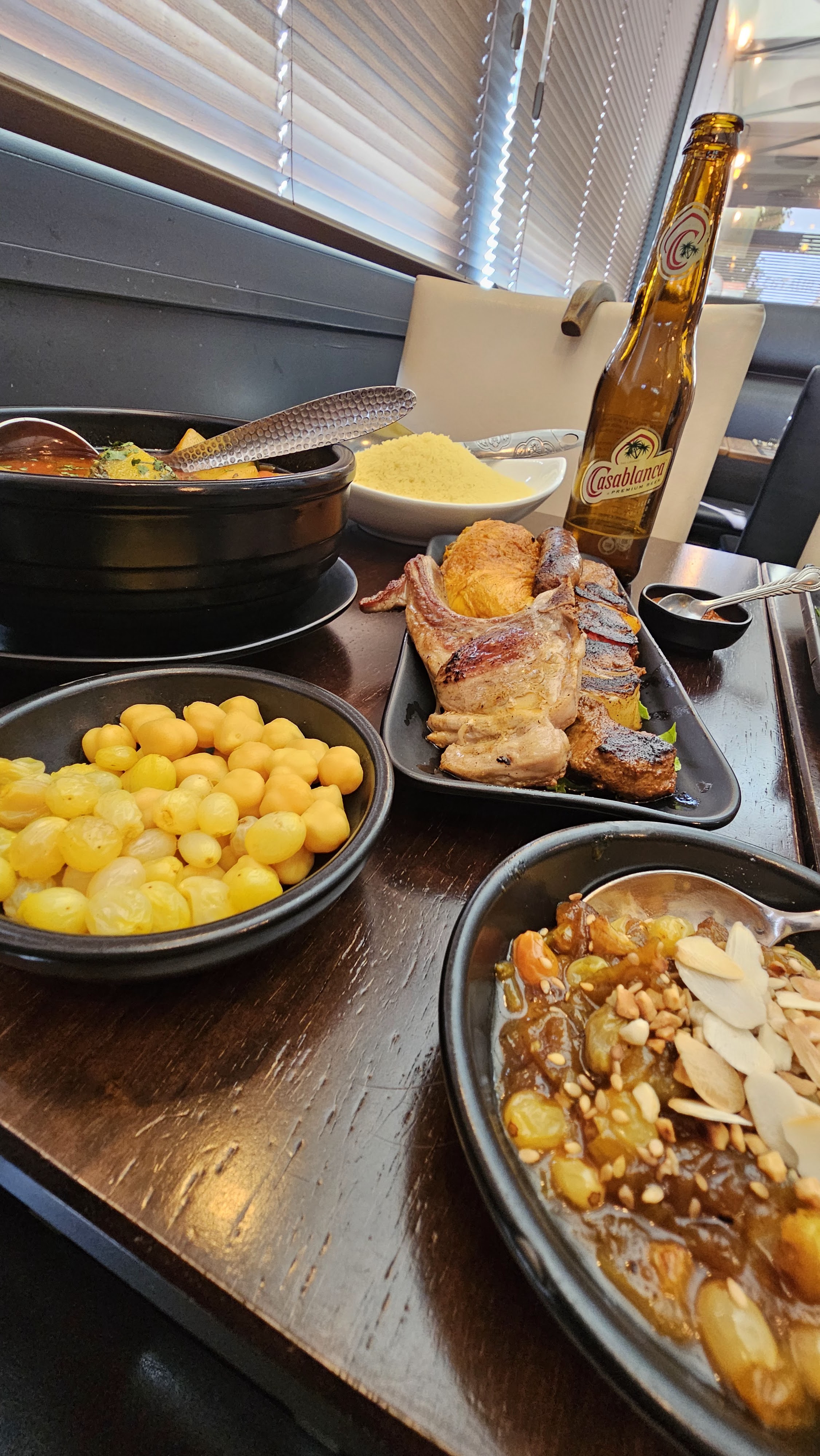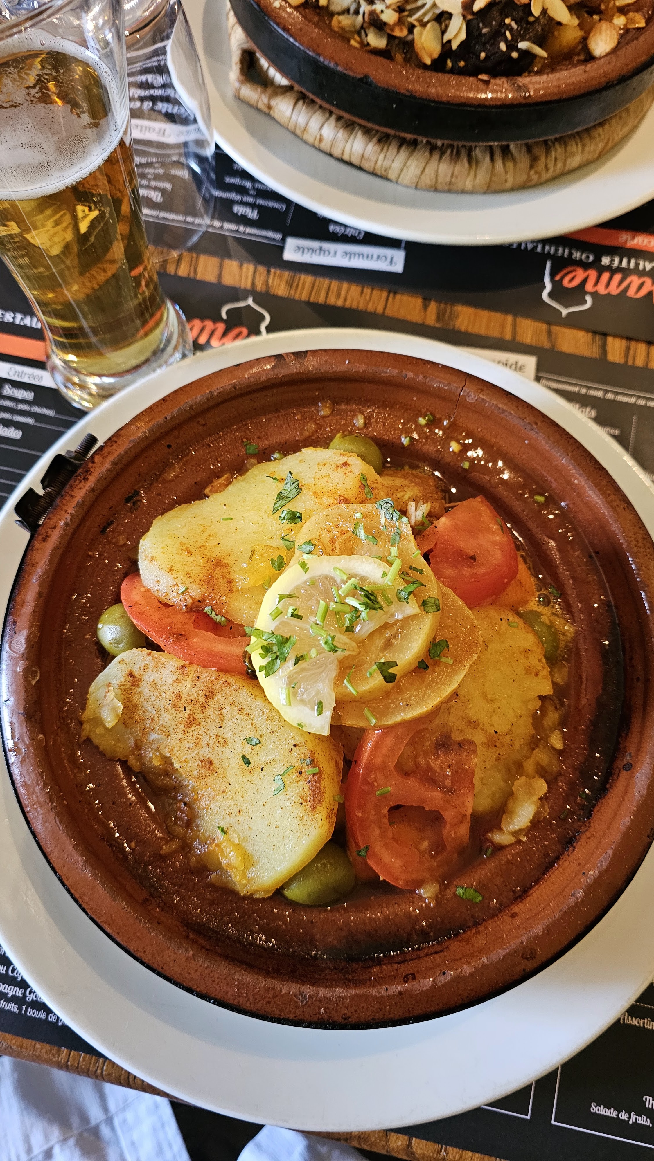 Première fois pour moi dans ce restaurant, l'ambiance est agréable, l'entrée impeccable (brick kefta) , mais par contre le plat pas trop fan étant d'origine marocaine c'est vrai qu'il y'a un décalage entre un vrai tajine agneau/pruneaux celui que j'ai l'habitude de manger avec celui proposé dans ce lieu mais après je dirais que chacun ses goûts !