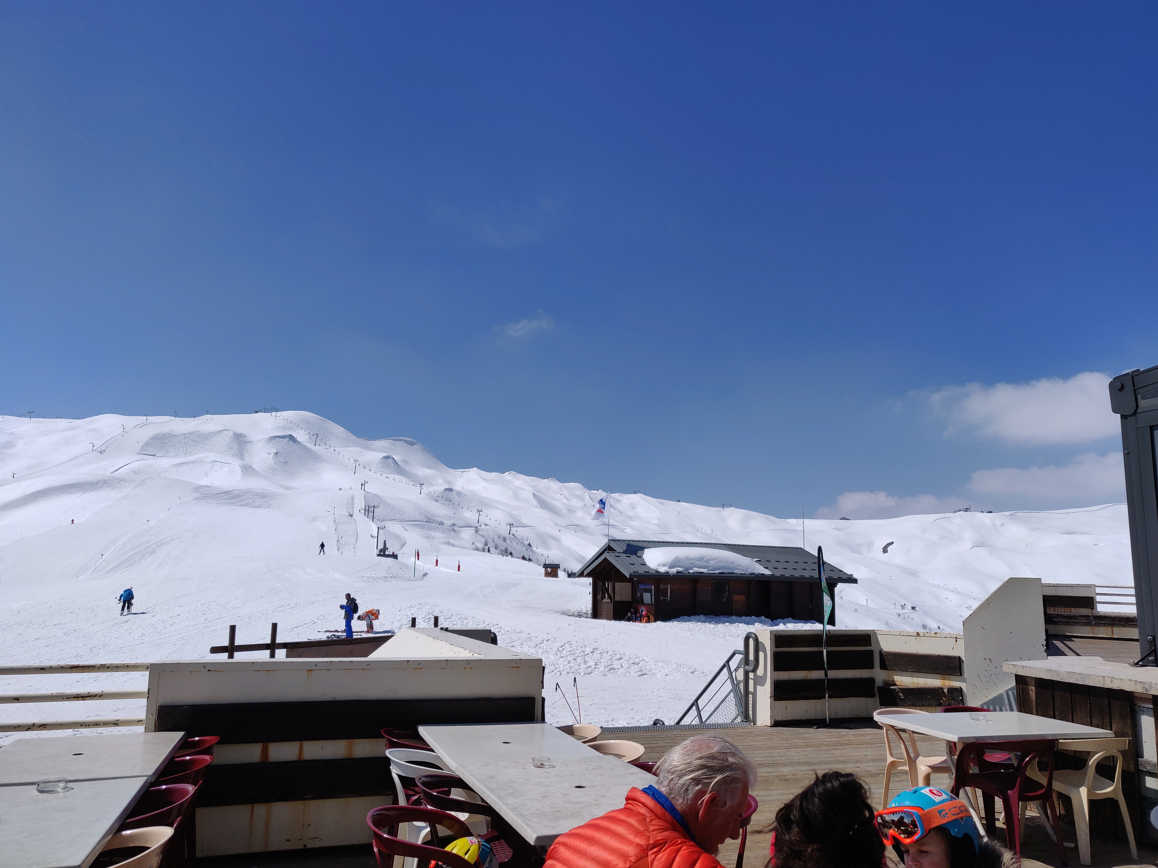 Belle terrasse avec une vue sur tout le domaine skiable. Pas de choix dans les bières pression servies.