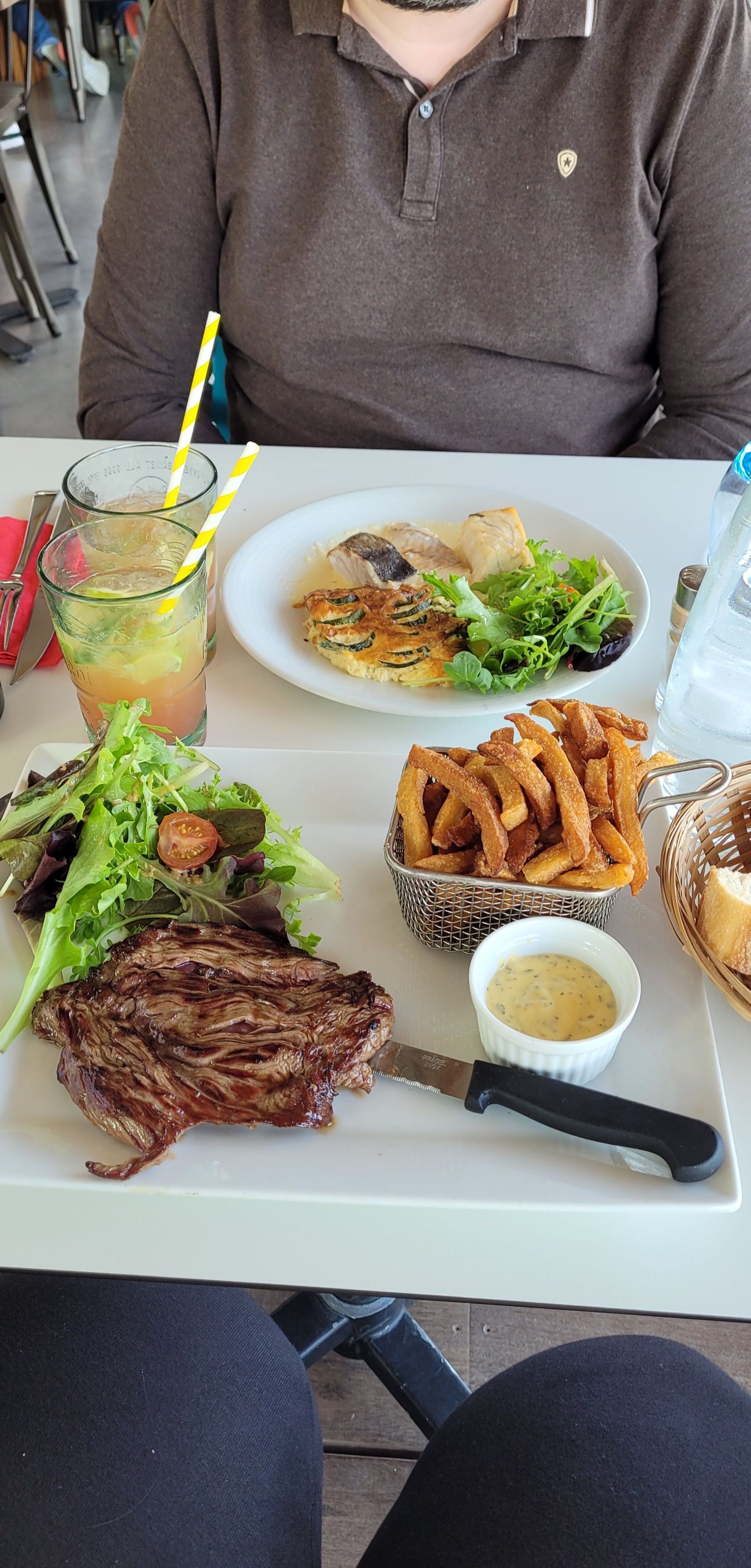 Plat, dessert, canette 16.50€ je trouve un peu cher, le dessert et les frites très bons la bavette bien cuite J’ai demandé à point