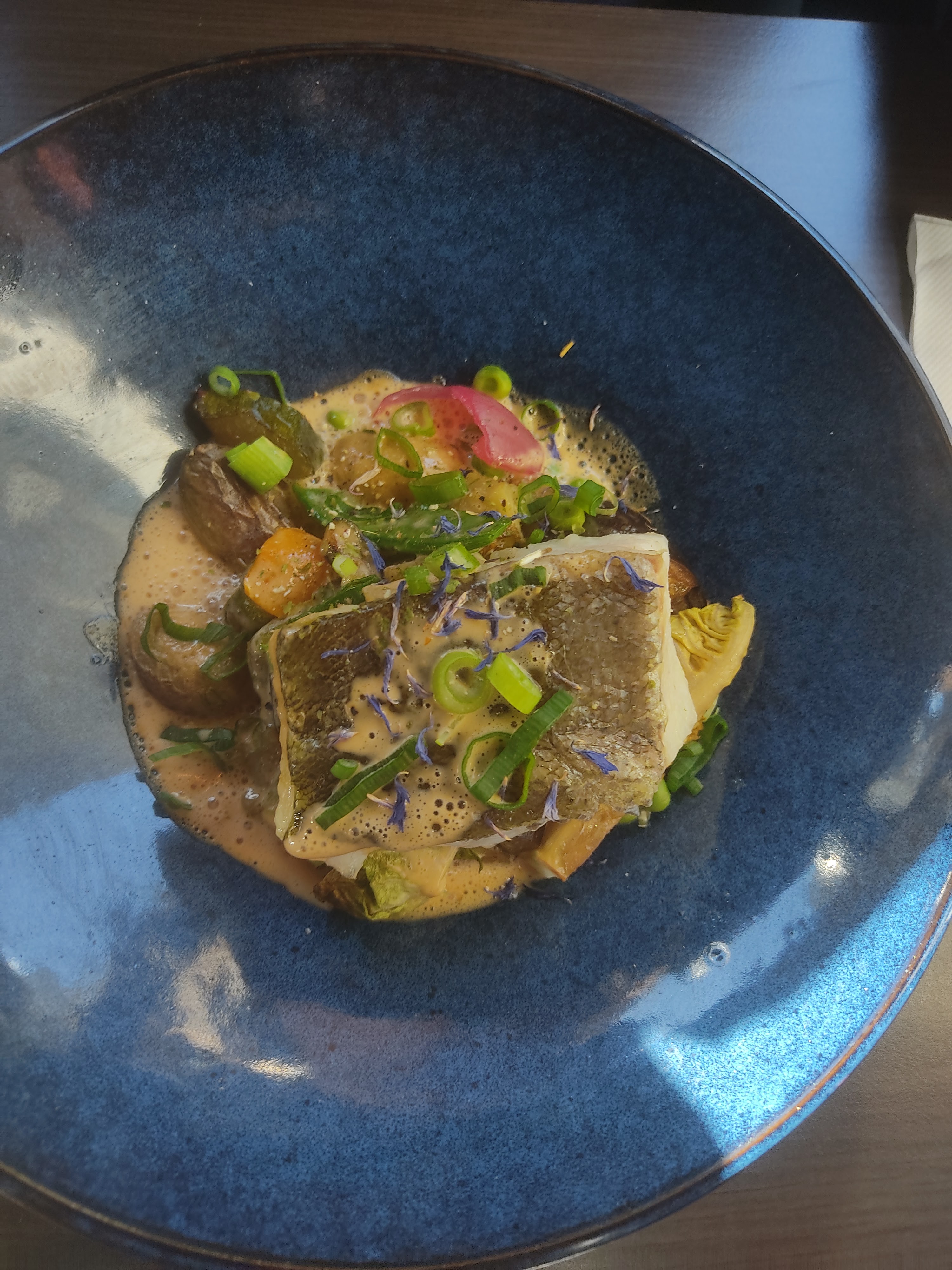Excellent ! Menu à 35 euros. C’est vraiment très bon, très travaillé avec plein de petits légumes, toujours une sauce excellente qui relie le tout.