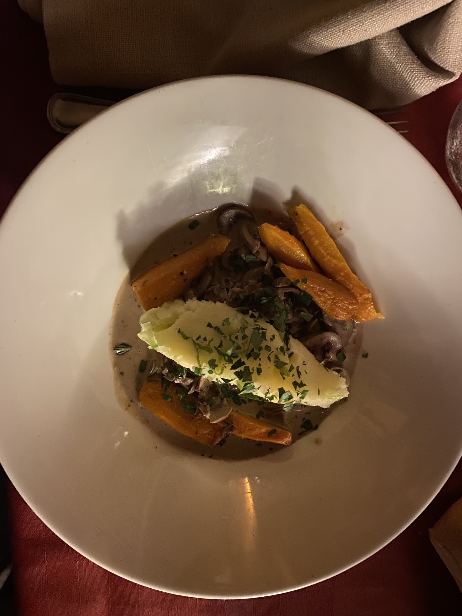 L'un des plats les plus chers et les plus mauvais, mon steak était absolument horrible. Beaucoup de poivre et de sel, brûlés à l'extérieur et crus à l'intérieur. Les pommes de terre et les légumes étaient cuits et secs comme s'ils sortaient du micro-ondes. Nourriture mal aimée. Le service était bien. Désolé.