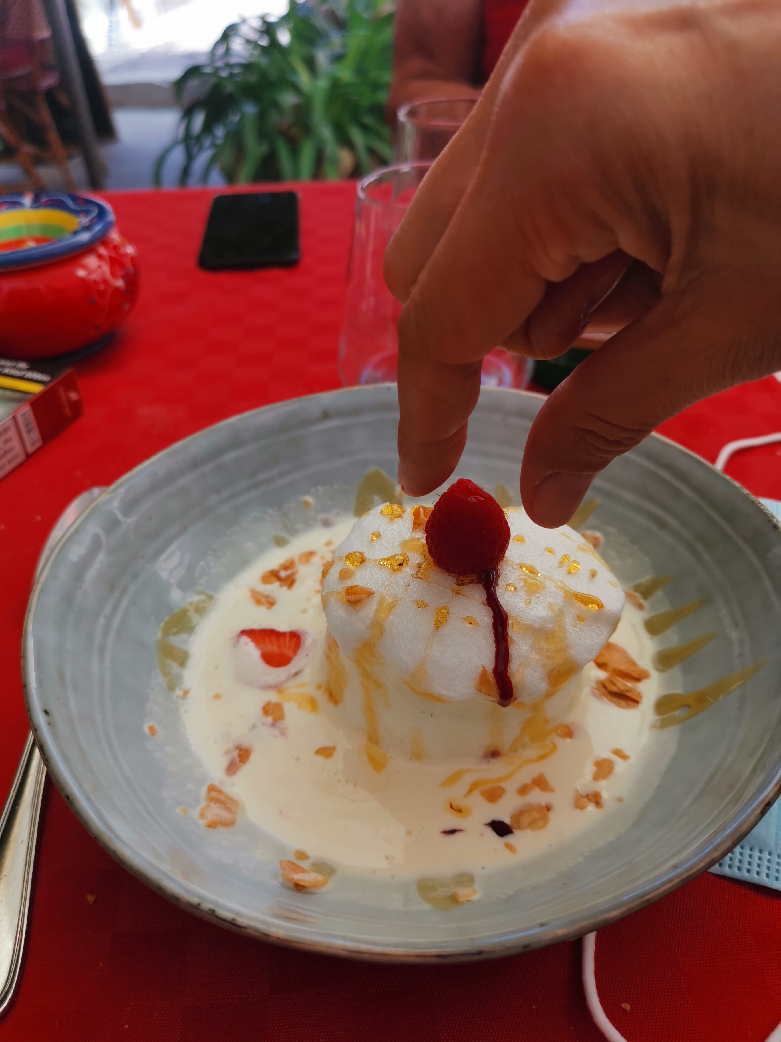 Détendez-vous dans une ambiance décontractée sur une belle terrasse couverte de plantes. Service super sympathique et la nourriture était parfaitement bonne et délicieuse d'une manière douce mais juteuse. La cerise sur le gâteau est la surprise Île flottante, qu'ils ne servent en fait que l'après-midi. Ce petit effort était la fin parfaite d’une agréable soirée.