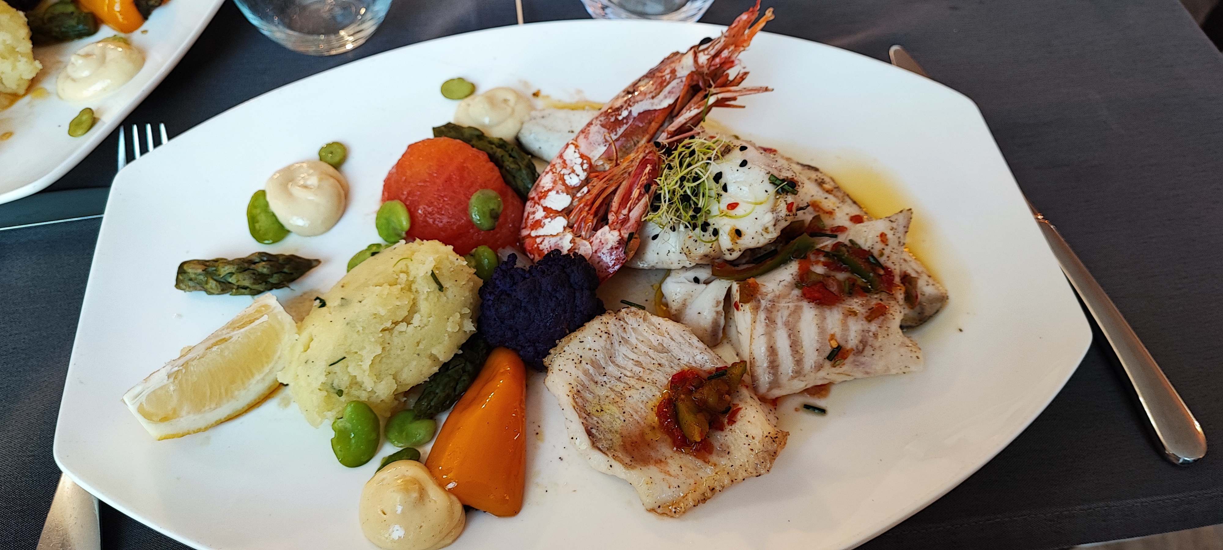 Repas formidable Ma femme a pris une langouste grillé, ma filles des gambas sauvages et moi un confit de canard grillé et ont c'est tous régalé. Le service très agreable