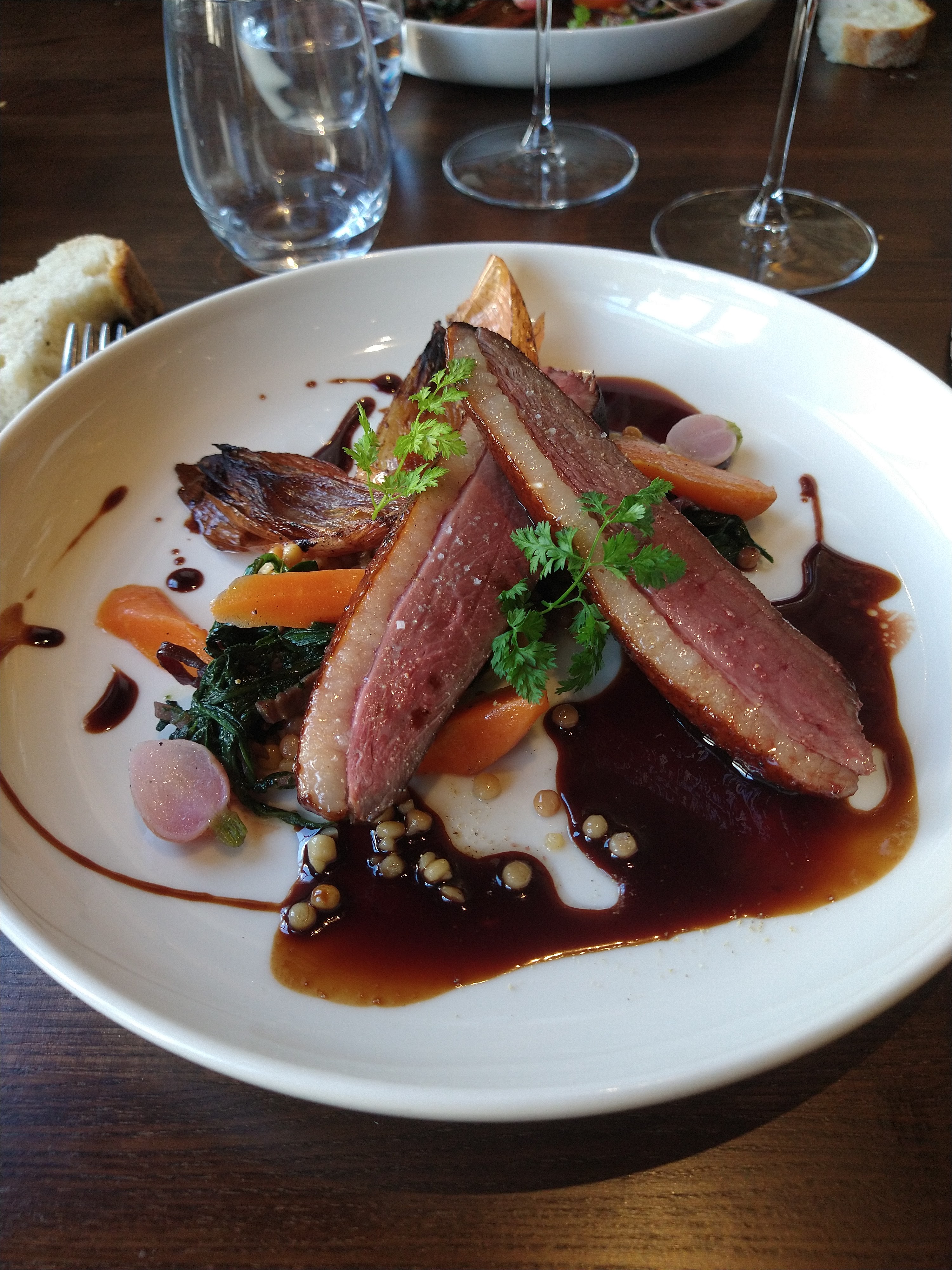 Excellent restaurant ! Le pressé de canard et fois gras aux fruits secs en entrée, le carré de veau poêlée, l’assiette de fromage secs et affinés de la région et enfin la ganache au chocolat blond « Ducley » de Valrhona !!!