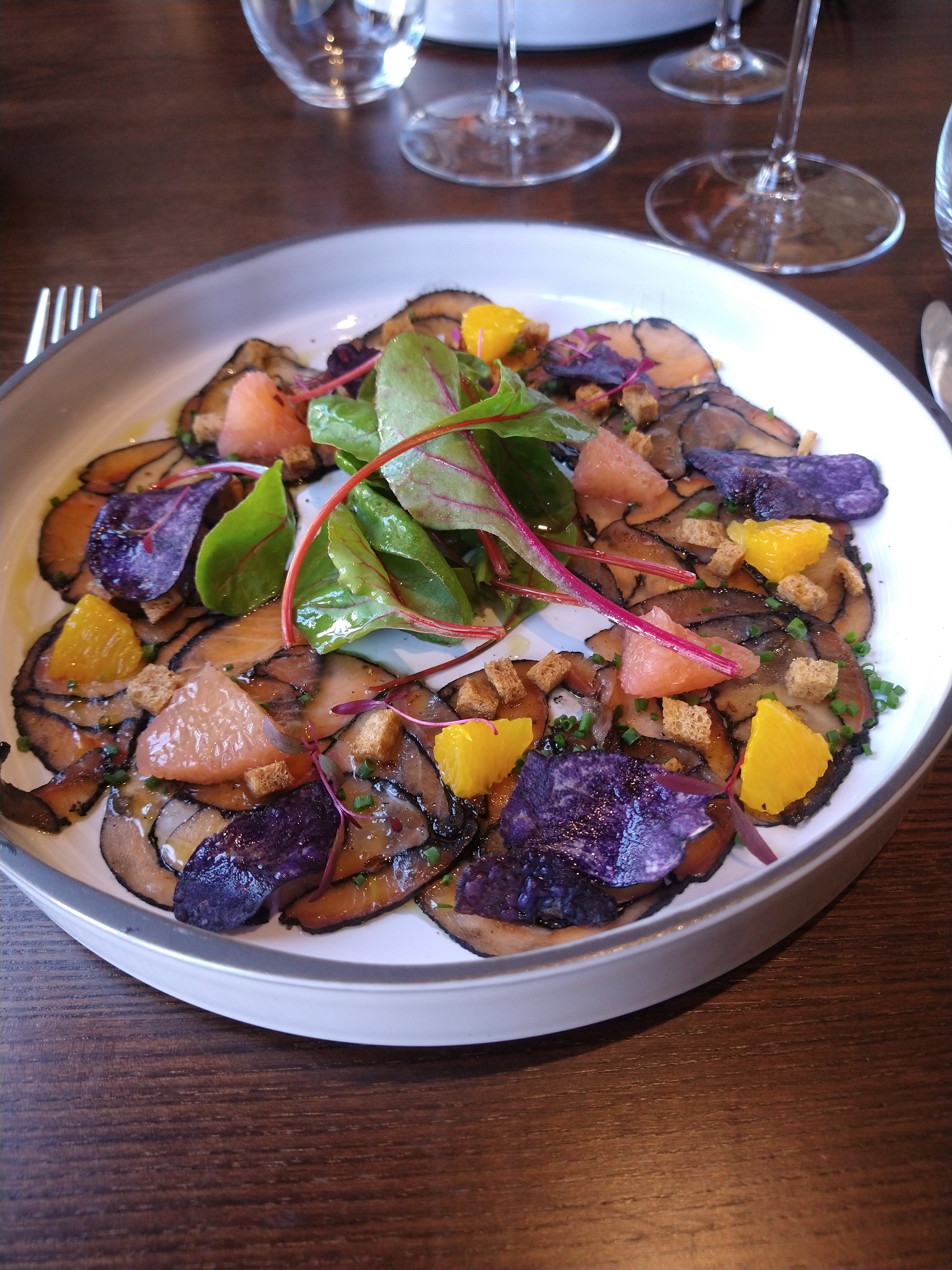 Au dîner c’est ambiance tapas bistronomiques à partager (ou pas). Nous avons adoré le croque monsieur à la truffe et le salmorejo de tomates (sorte de gaspacho). Le gravlax de cabillaud était très fin et fondait en bouche, et j’ai beaucoup aimé l’association avec la myrtille. Très bons équilibres de goûts pour le vitello tonnato grâce aux câpres et aux pickles qui apportent de l’acidité. En revanche un peu déçus de la burrata, manque d’assaisonnement ou d’un petit peps (en revanche belle idée d’avoir ajouté les noix de cajous !). La personne au service était au top, très agréable et souriante. Le restaurant dispose en plus d’une terrasse plutôt calme très sympa.