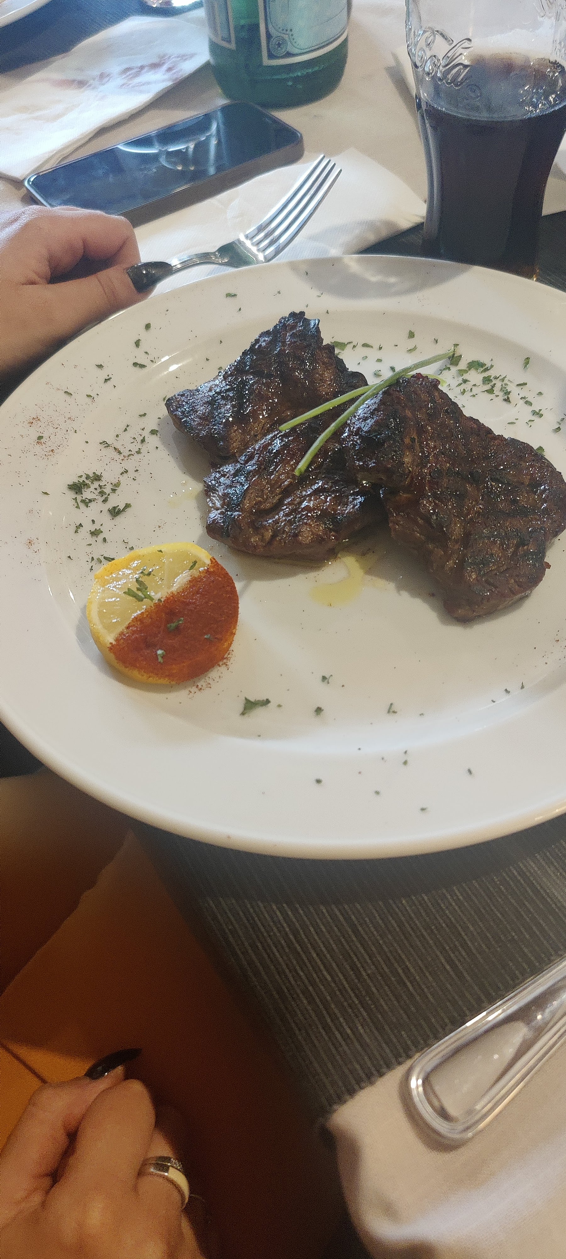 J'ai commandé un filet de bœuf et j'ai reçu un steak de bœuf qui n'avait pas bon goût Je l'ai commandé moyen et je l'ai reçu brûlé Quand j'ai dit que ça n'avait pas bon goût, la réponse a été que c'était moyen... vous pouvez le voir sur les photos En tout cas, la viande ne vaut pas la peine d'être recommandée En compensation du repas, nous avons reçu un dessert maison. Ok. Pour tous ceux qui s'y connaissent en viande, commandez le filet et vous remarquerez la différence car un filet coule sur la langue et quand vous coupez ce steak, vous savez que ce n'était pas un filet.