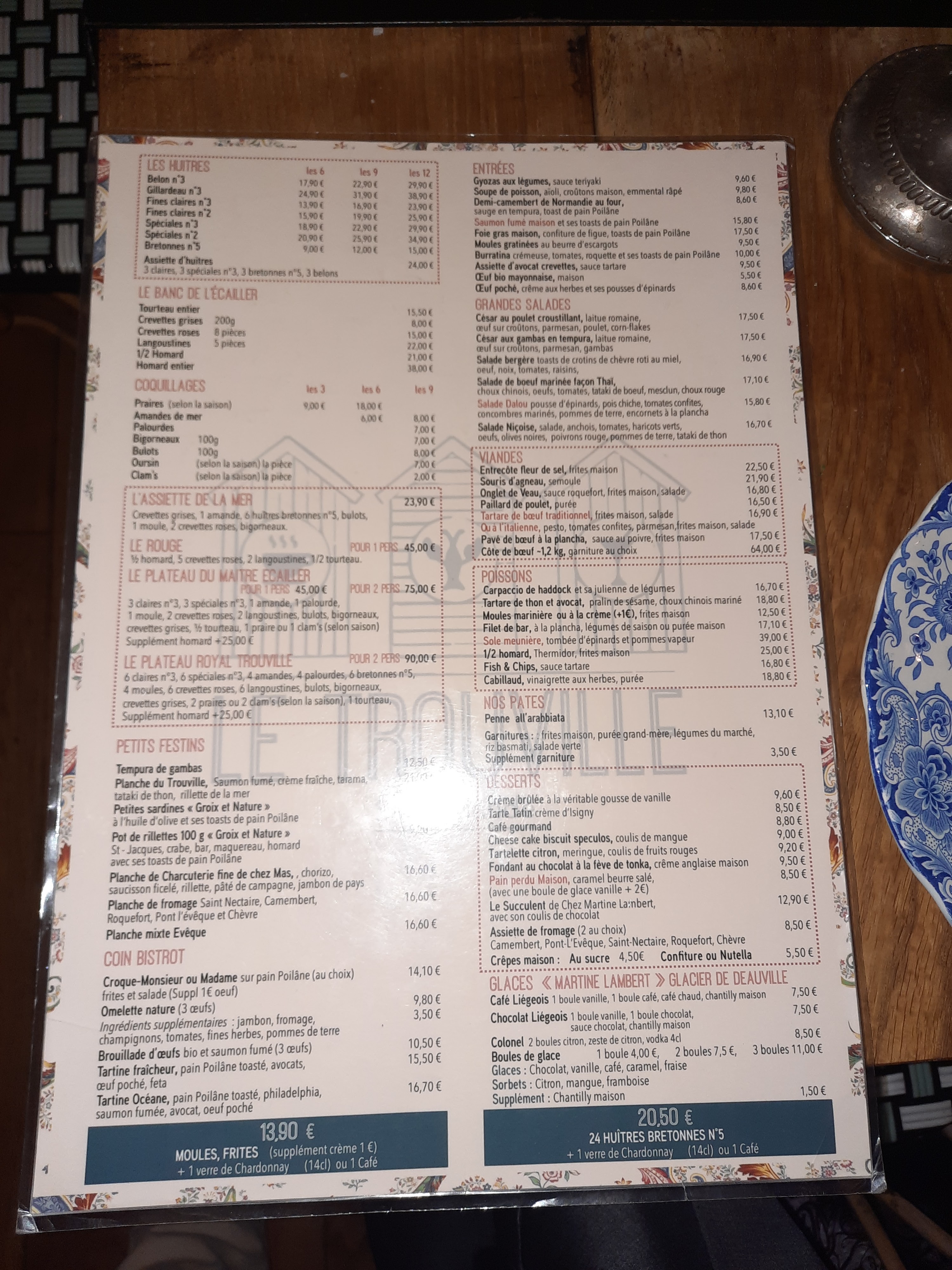 Très bonne surprise que le Trouville. Cela faisait plusieurs mois que je me tâtais car la deco extérieure est top mais les avis négatifs que je voyais sur google me refroidissaient un peu. J’y suis finalement allé la semaine dernière pour voir ce qu’il en était et très bonne surprise. Service rapide et sympathique, bon plats et bonnes alternatives aux fruits de mer disponibles, belle deco interieure, il y a même un babyfoot sur lequel les enfants ont pu s’amuser. Très bon moment au final et bon rapport qualité prix. merci. Je reviendrai.