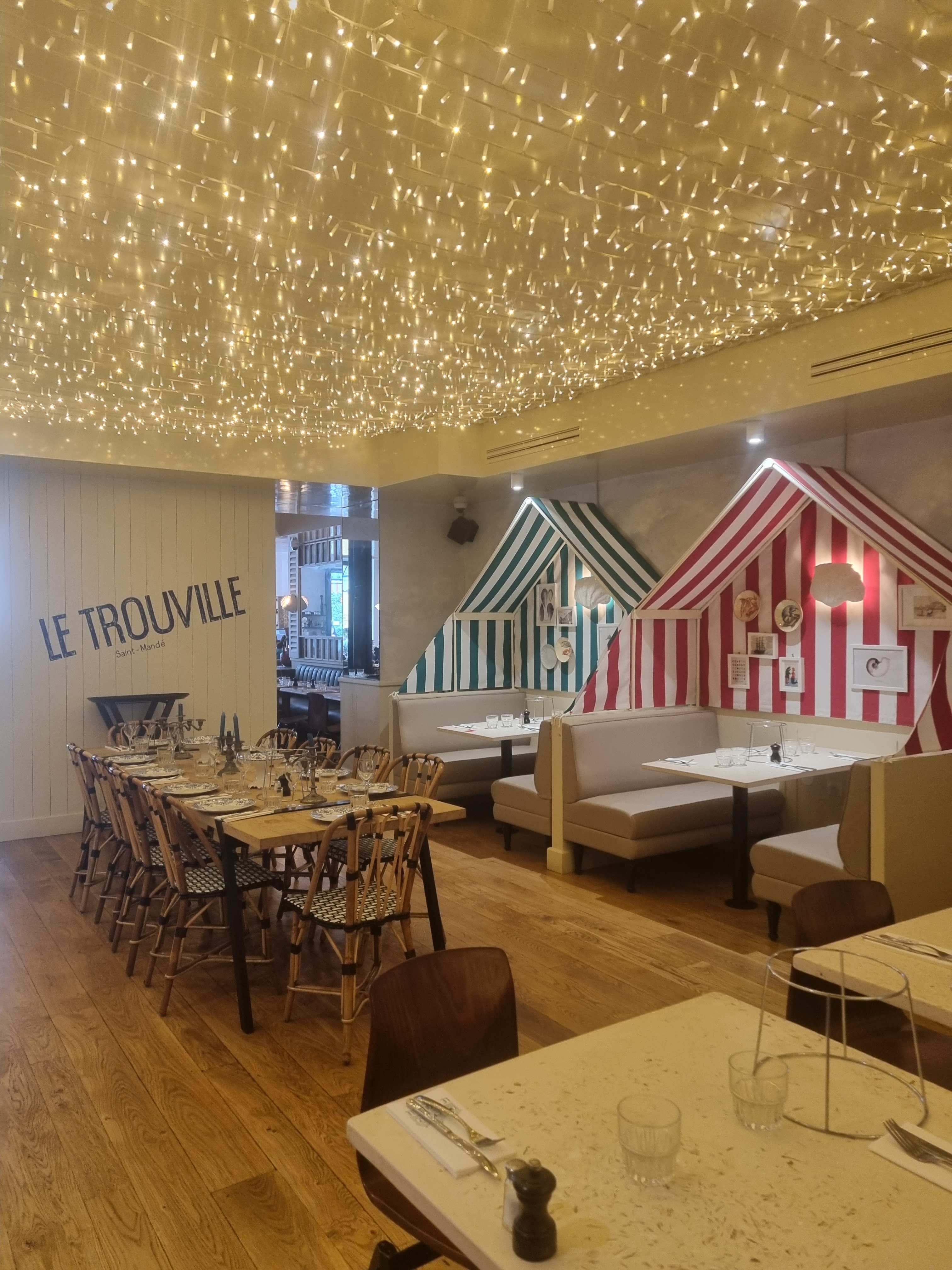 UPDATE mai 2022 : Depuis la réouverture du restaurant suite à l’incendie, la déco est encore meilleure, surtout dans la salle du fond. C’est devenu un peu ma cantine, j’avoue. J’adore car je me sens bien, c’est très lumineux et chaleureux comme endroit. On mange bien et il y a de la place pour les familles, enfants et poussettes. Petit bémol car il n’y a pas de table à langer de disponible dans les toilettes alors qu’il y a de la place, et parfois les serveurs peuvent être un petit peu désagréables… C’est peut-être plus une question de jours que d’habitude. Dans tous les cas, je suis ravie d’avoir le Trouville à St Mandé! 🧡 —————————— Oct 2020 : Emplacement de l’ancien indiana. Un restaurant des fruits de mer manquait à St Mandé. Bien sûr, ce n’est pas encore rodé et cela se sent que tous les serveurs ne sont pas tous du métier (un coup de prise en main encore attendu pour certains d’entre eux) mais dans l’ensemble je suis assez satisfaite pour un restaurant qui a ouvert ses portes vendredi 9 octobre. Il paraît aussi que le chef leur a fait faux bon pendant le week-end d’ouverture... difficile aussi d’assurer dans ces conditions. Belle décoration et réarrangement de l’espace. Je suis allée à midi un lundi pendant le rush du déjeuner, j’ai pris la formule moules + verre de fin à 12,90€. Les moules étaient fraîches et les frites bonnes aussi - c’est tout de même le PLUS important. J’ai apprécié le dessert qui était très bon. Je vais revenir et modifier ainsi ma note en fonction mais je laisse le temps de la prise en main (car un mauvais service peut tout gâcher). J’ai oublié de prendre quelques photos de l’intérieur et de l’extérieur de la terrasse