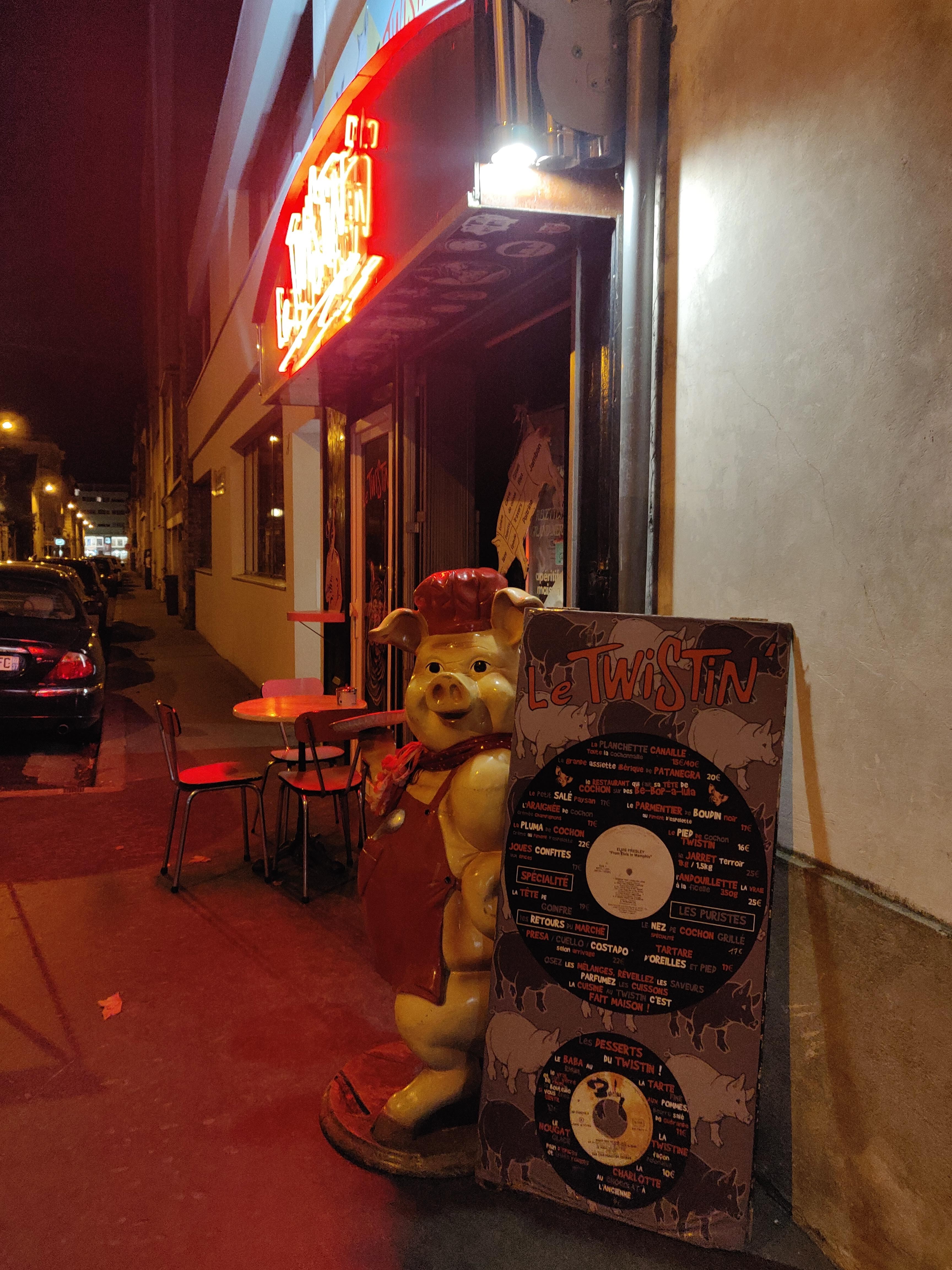 Le Twistin, à Tours Restaurant de cochon Le Twistin est une expérience paradoxale culinaire, un oxymore urbain qui redonne tout son sens au fondement du métier de restaurateur: faire plaisir à ceux que l’on reçoit. Kitch raffiné, Elégance vulgaire, Décoration anachronique empreinte de modernité vieillotte Une cuisine simple, d’une originalité époustouflante Le patron/cuistot/serveur qui nous a reçu était d’une efficacité redoutable tout en dégageant un flegme et une décontraction déconcertante. Des produits d’une qualité incroyable. Nous nous sommes tout simplement régalé. Dans la restauration on emploie souvent le terme de rapport qualité/prix, en le galvaudant quelque pas. Je dirais simplement que chez Twistin, on en a pour son argent. Les plats sont copieux, la « planchette » de charcuterie est plus que largement suffisante pour deux personnes si on la prend en entrée Les plats sont magnifiquement dressés car, comme nous a dit le patron: « je dresse vos assiettes comme si c’est moi qui allait les manger » En bref, nous vous l’avons déjà dit… vous avez trés certainement du entendre à maintes reprises ce genre de compliments en 25 d’existence à Tours… mais pour nous vous avez été une magnifique découverte qui restera gravée dans ma mémoire culinaire. Merci, tout simplement. Jérôme