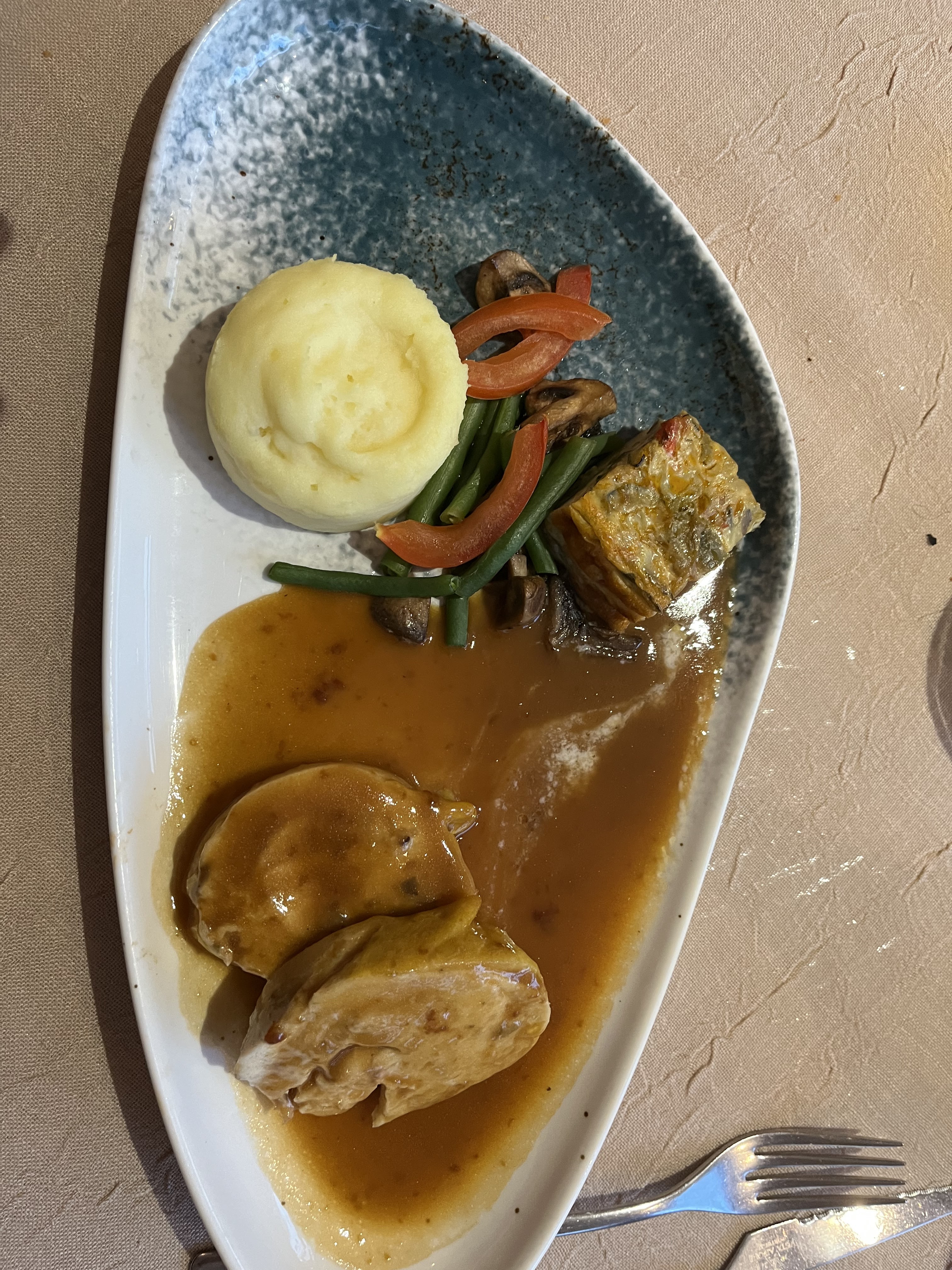 menu correct lors d'un repas familial. Portion correcte pour petit mangeur...le jus de fruits de l'apéro servi au verre et vin mis dans bouteille sans étiquette m'interrogent??? par contre, par pitié changez vos chaises noires scotchées et déchirées! c'est du plus mauvais effet!