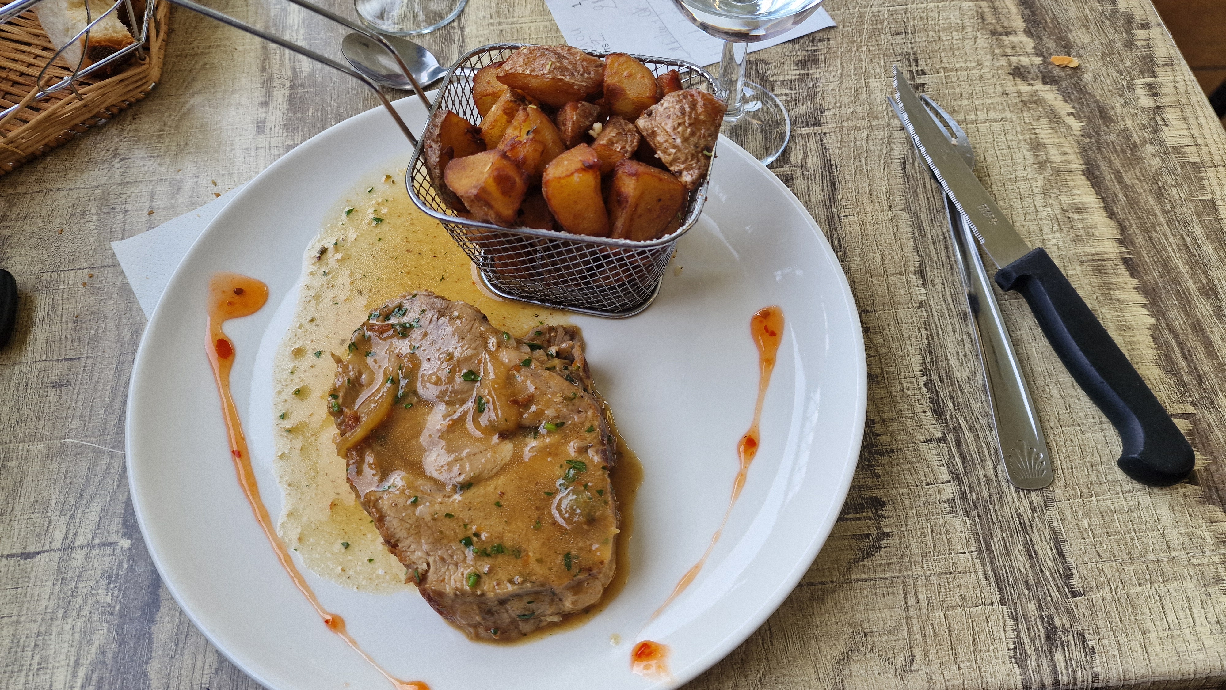 Accueil simple et chaleureux, les petites jeunes qui servent en salle sont efficaces, rapides et precises, souriantes et prévenantes, les commensaux ouverts sympathiques et curieux : et oui dans un routier on se parle d’une table à l’autre sans se connaître et c’est bien comme cela. Quant au repas, bon simple et copieux et la cote de veau sauce aux champignons… 👌🏻