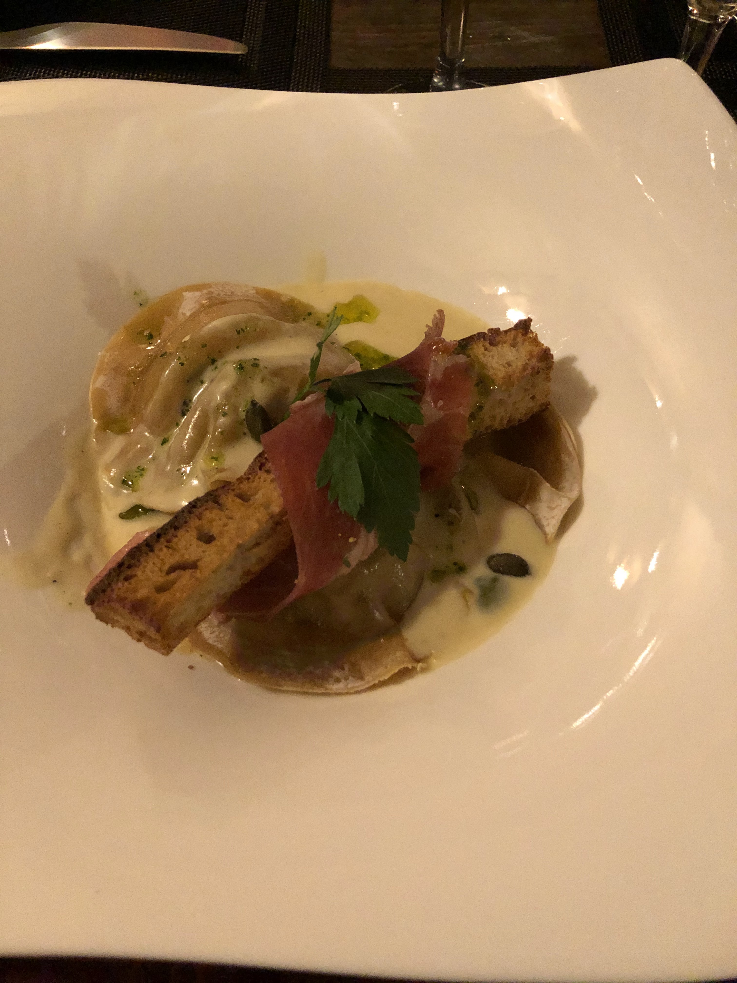 Très belle entrée de fruits de mer, cerf savoureux ; bon fromage (raclette), et bon « coin » végétarien, nous avons beaucoup aimé le vin Charteue de viens ; Ps. Nous avons demandé ce qui se passerait pour les restes de fromage de la raclette, la réponse a été qu'ils seraient utilisés pour la fondue. J'espère qu'ils couperont toute partie exposée et les jetteront ; mais je préfère qu'ils servent des portions assez bonnes et permettent des plats à emporter.