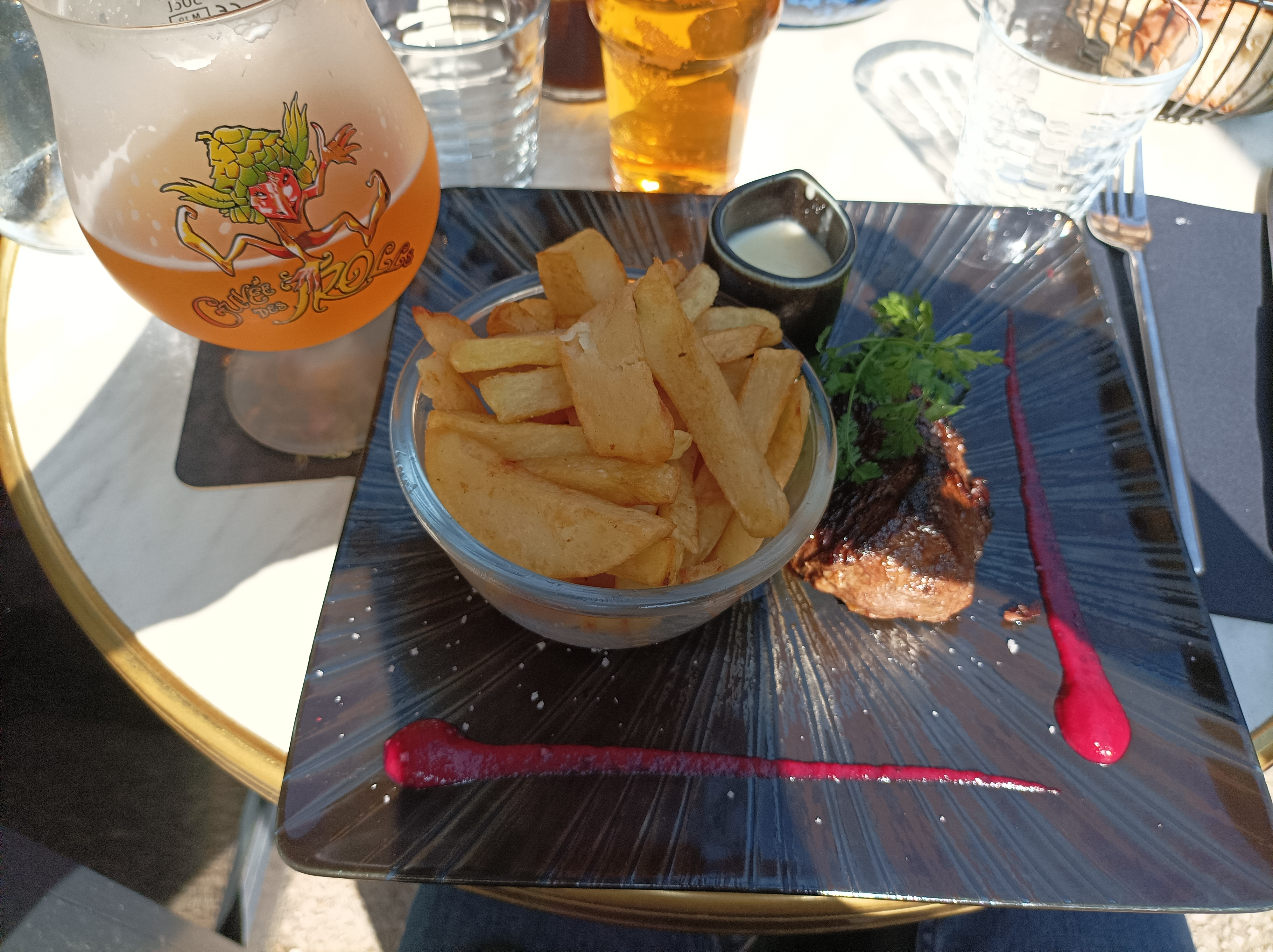 Les plats étaient bon mais pour le prix on pourrait s'attendre à mieux. La bavette est servie seule dans l'assiette avec un bol de frites a côté (une petite salade ou une sauce aurait été bien). Le burger était a peine chaud. Et idem pour le prix on pourrait attendre un service de qualité, nous avons été interrompu a de nombreuses reprises, nous avons dû demander deux fois pour une carafe d'eau. Les serveurs sont assez jeunes ceci explique peut être cela. Le dessert (thé gourmand) rien d exceptionnel.