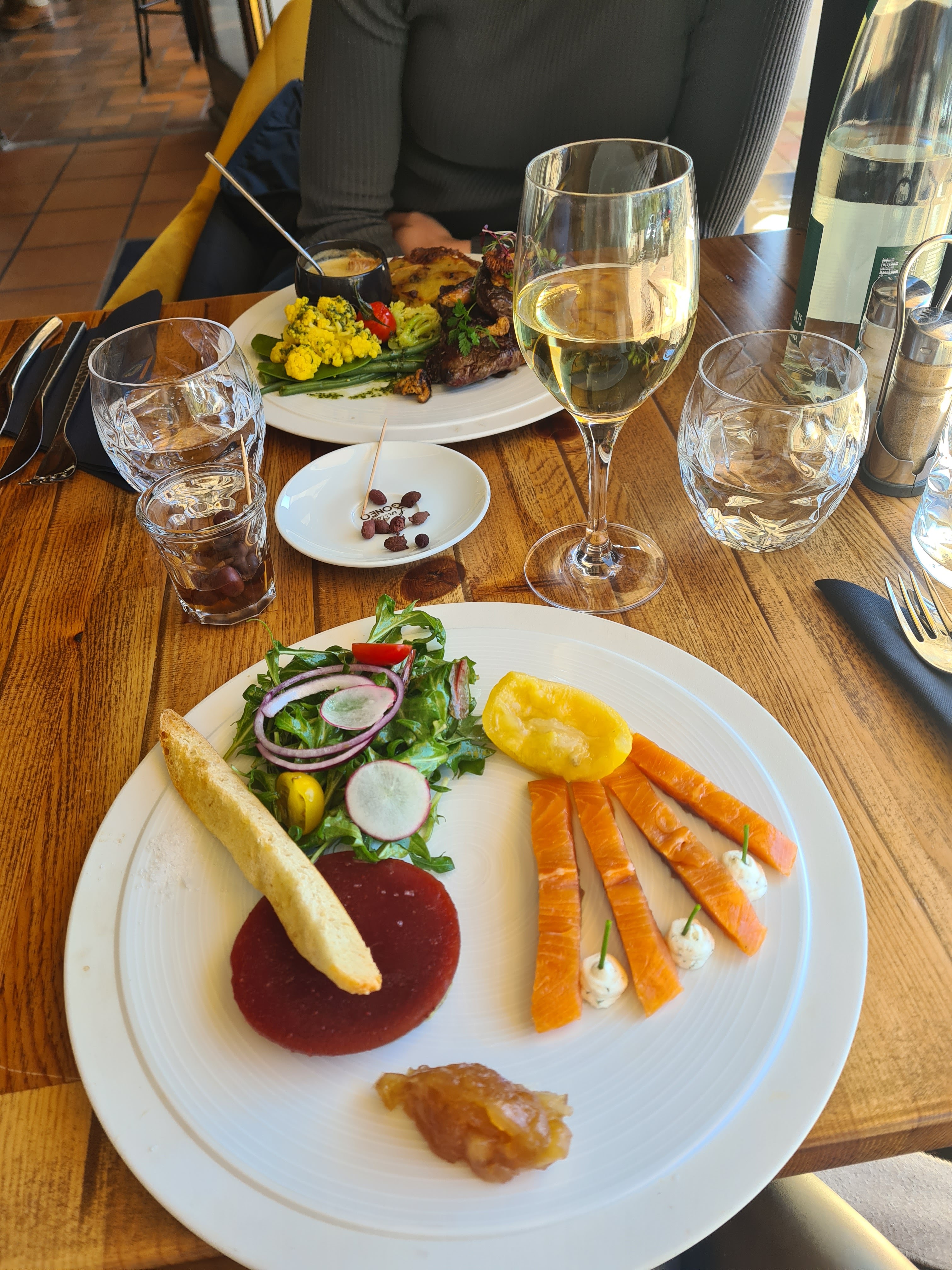 Après 2 ans de restrictions sanitaire absurdes, nous faisions de cette sortie un véritable événement. Un nouveau restaurant, un nouveau concept, chouette. 15 ans de métier dans la restauration pour voir ça ? Inacceptable. Un liteau absolument dégueulasse, ont-ils essuyés 10 fois le bar avant de nous apporter la bouteille de vin proposé par un serveur (le pauvre) sans la moindre formation perdu au milieu d'une bataille qui semble le dépasser... Bref passons. Un tartare de truite pour 21€, plein d'arrêtes, assaisonnement bâclé et dont la taille ne suffierait pas à rassasier une fourmi. Par dessus tout, pas frais et sans doute datant du service du midi. Bon joueurs, on averti le serveur, un simple verre offert. Sans être dans la critique injustifiée, la restauration est avant tout un métier passion qui visiblement ici, laisse place à une façade impeccable mais qui, lorsque l'on se laisse aller à l'observation de ce que doit être un moment exceptionnel se transforme en une scène digne du Grand restaurant avec DeFunes. A fuir...