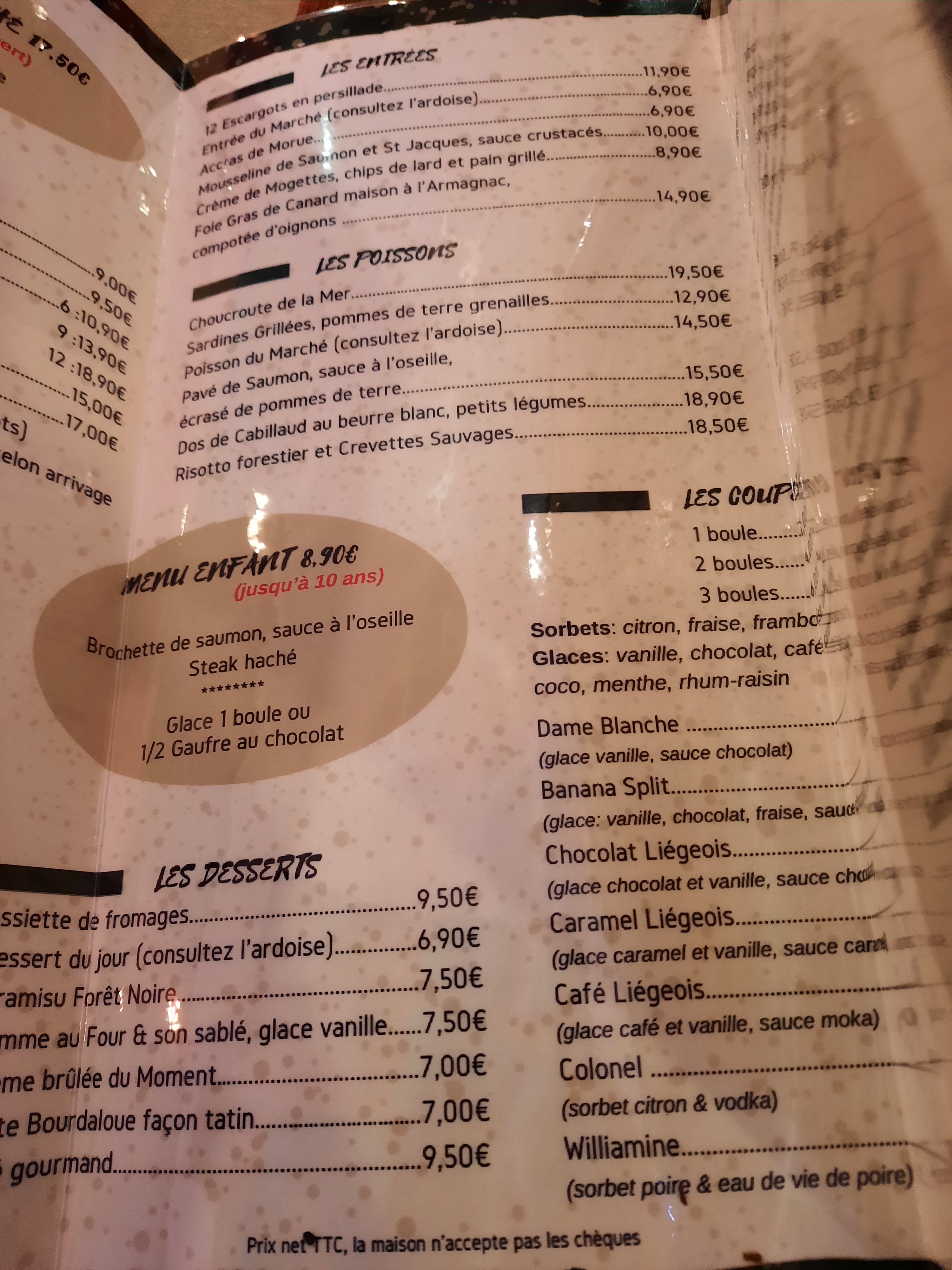 Nous avons pris le menu à 23.90 euros. Saumon fumé et son tartare fait maison. Puis la marmite du pêcheur et en dessert le sablé pomme au four glace vanille accompagné d une bouteille de blanc conseillé par le serveur. Nous n avons été déçu de nos choix . Excellent y compris le vin. La serveuse et le serveur sont très sympathiques et dynamiques. Nous reviendrons pour la choucroute de la mer.