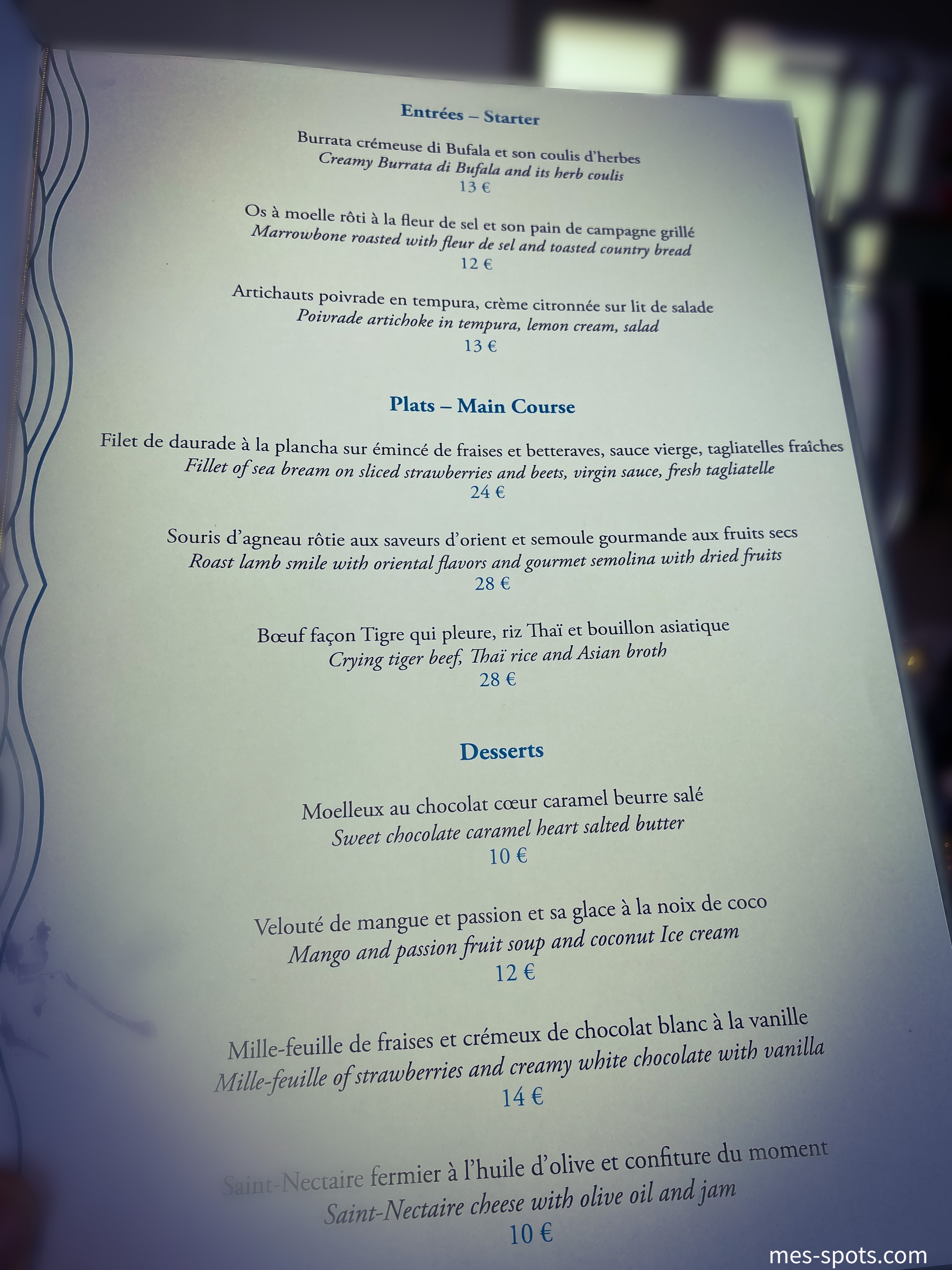 Nous choisissons de manger à l’intérieur car il faisait chaud. 3 Clim allumées le serveur laisse la porte ouverte. Je lui demande de la fermer ce qu’il fait puis ressort et recommence. Je vais fermer la porte et à nouveau il la laisse ouverte….question écologie on fait mieux. Le dessert était délicieux au démarrage mais sur les 4 feuilletés de banane 2 n’étaient quasiment pas cuits donc durs. Pas de coteaux d’Aix portant proposé à la carte. Résultat il faut prendre la gamme au-dessus Les plats étaient bons mais 25e ça fait cher car évidemment il n’y a pas de menu. Au final 110e pour 2 sachant qu’une seule personne a pris une entrée.