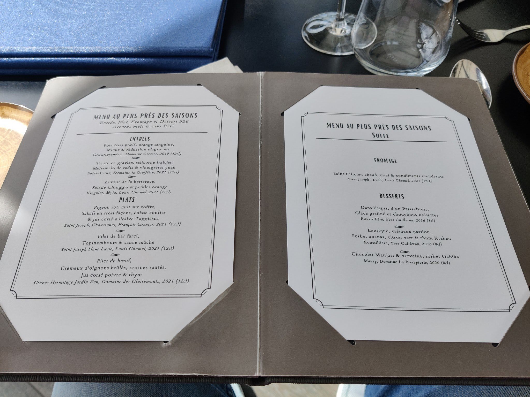 Le menu au plus près des saisons était très bon, les saveurs très raffinées, petit point négatif : la climatisation était très forte à côté de la baie vitrée.