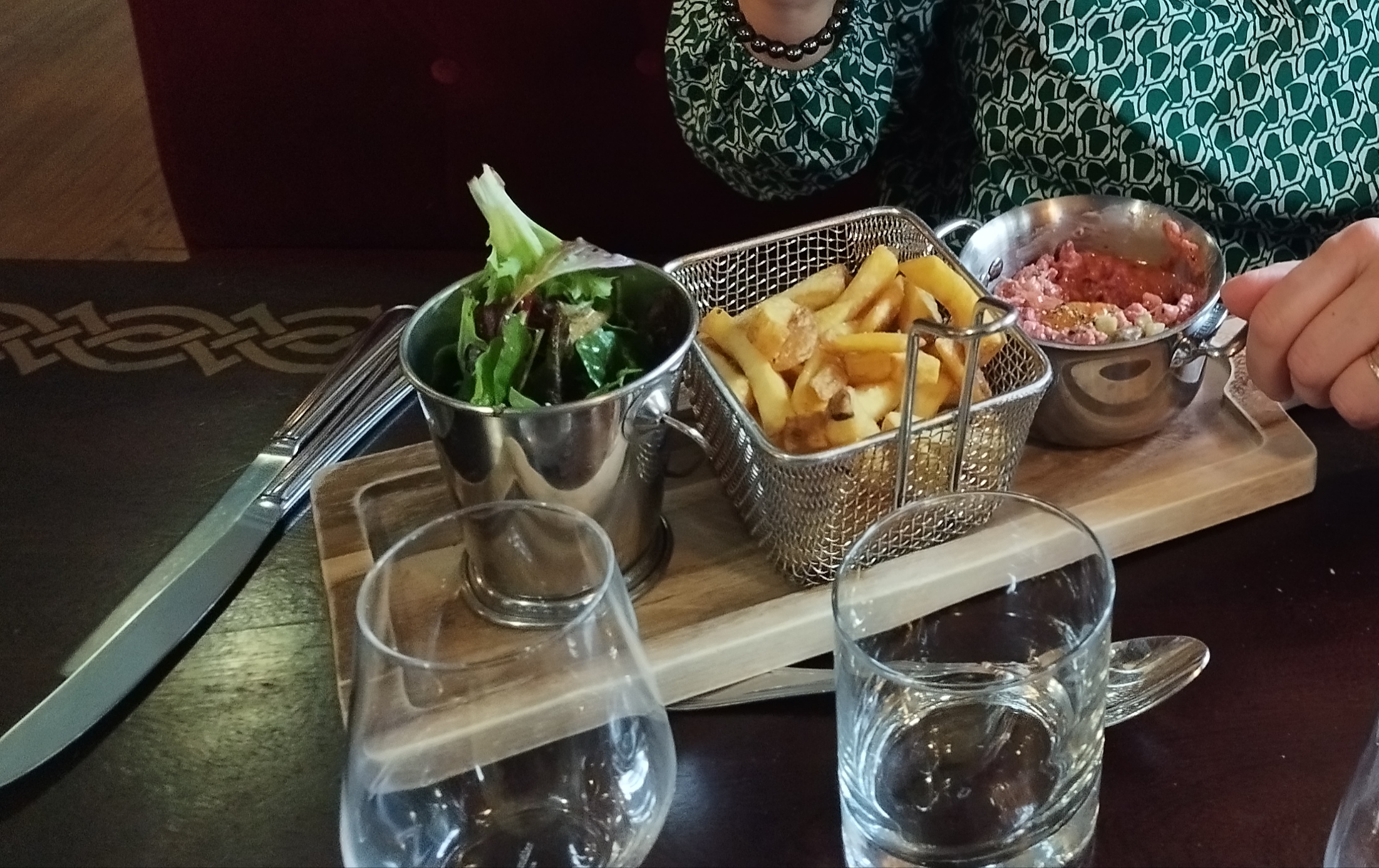 Pour une fois, je fus agréablement surpris. J'étais venu une première fois il y a trois ans. Une énorme déception. Cette fois-ci, nous sommes venus dîner à 2. Un menu à 21 euros par personne en trois services. Curieusement, c'était bon. Ce n'est pas de la grande cuisine. Mais en termes de saveur gustative, c'était meilleur que l'orangerie, le restaurant du grand hôtel, à 24 euros en trois services. Une entrée simple. Puis, de la bavette saignante de belle qualité. Une viande généreuse, une sauce claire, des frites dorées. Le gâteau au chocolat accomplit son épilogue, le tout accompagné d'une bière de saison. Le service n'était pas formidable, manquait de précision car dans les Vosges le personnel n'a aucun sens de l'accueil. Au lieu de détendre l'atmosphère, souvent les serveurs ont la fâcheuse habitude de donner des ordres aux clients. Une erreur à l'addition fut rectifiée sur ma demande. La cuisine vaut, cependant, le coup d'œil.