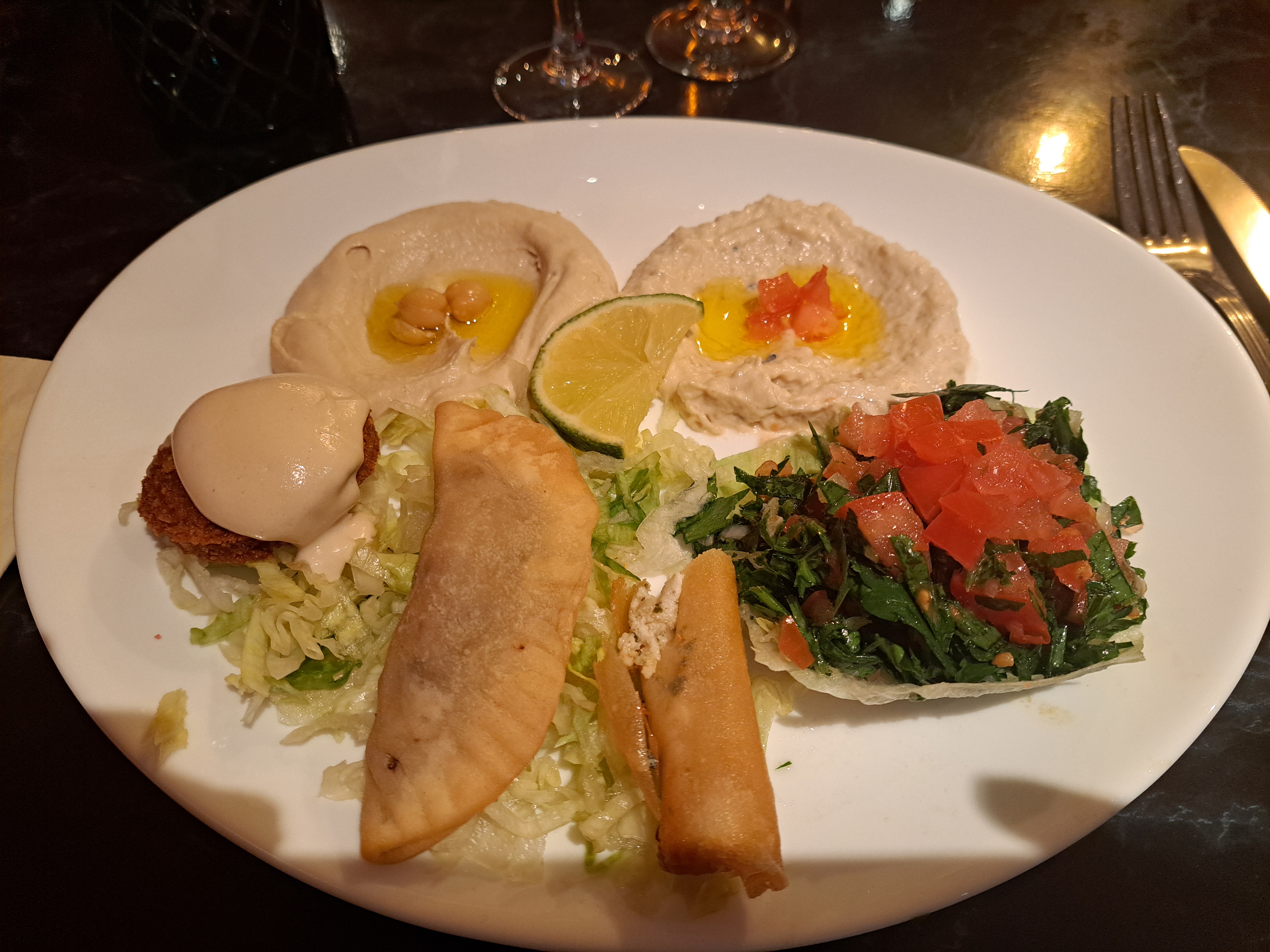 très agréable découverte de la cuisine libanaise sur les conseils du serveur...formule demi mezze pour 2. personnel très attentionné . je recommande.