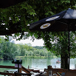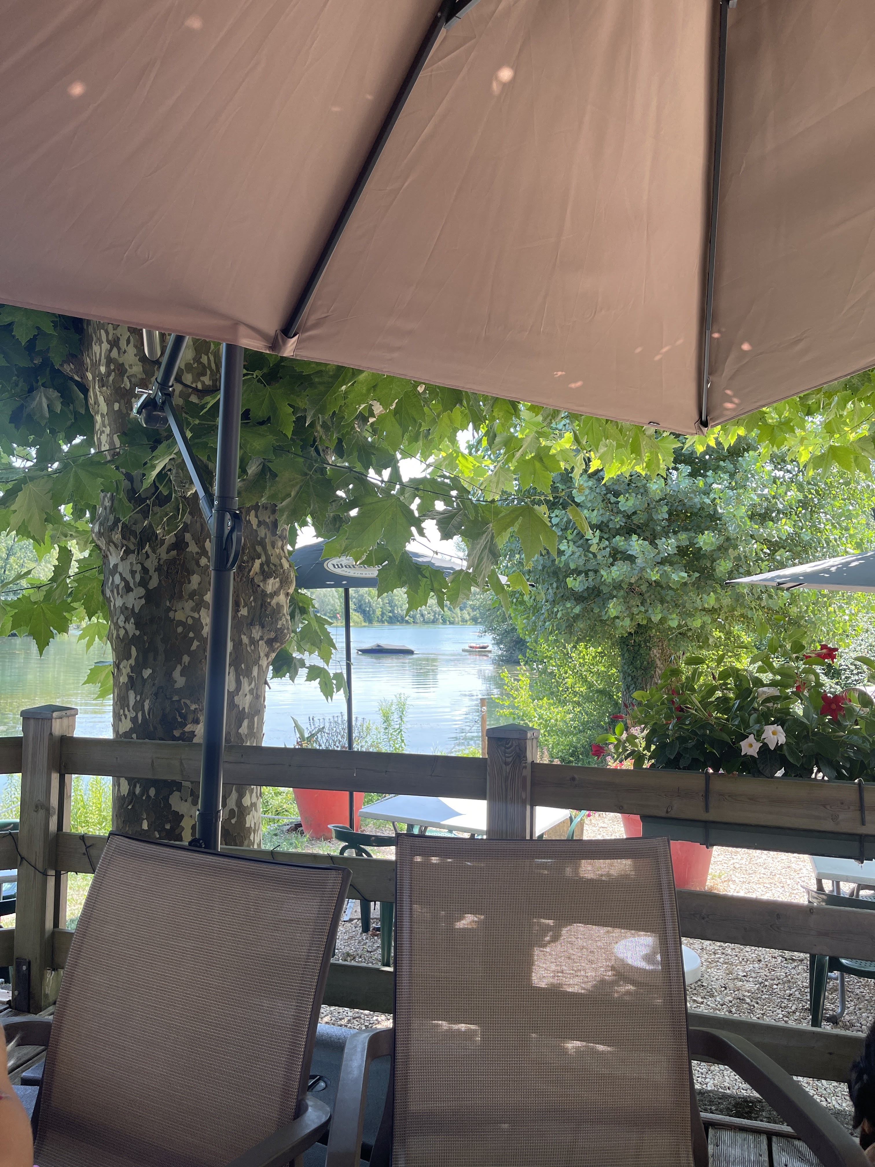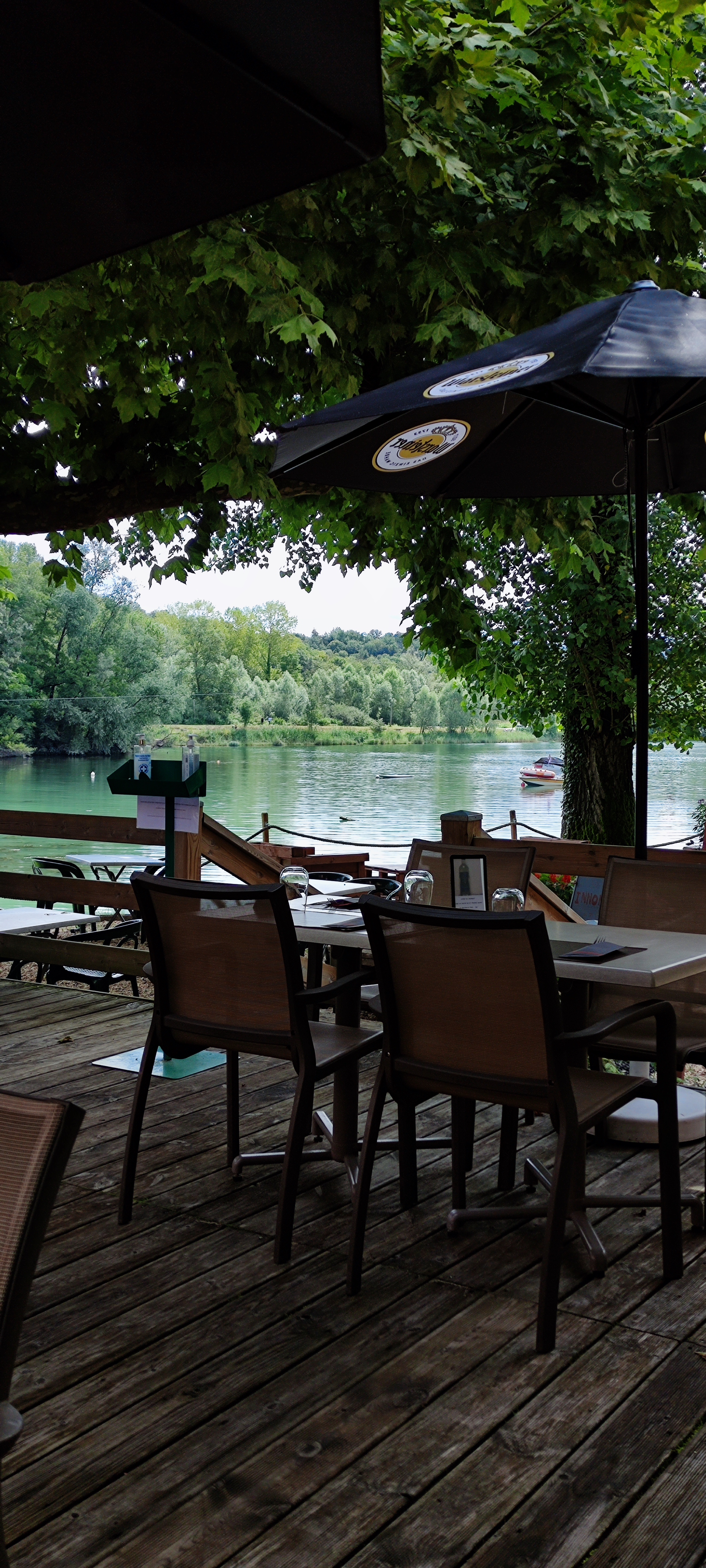 Sympathique terrasse ombragée au bord de l'eau. L'accueil est agréable, le personnel aux petits soins et le service rapide. Nous avons partagé à deux une énorme côté de porc rendue particulièrement tendre et gouteuse par une cuisson lente. Déjeuner agréable au calme et au frais.