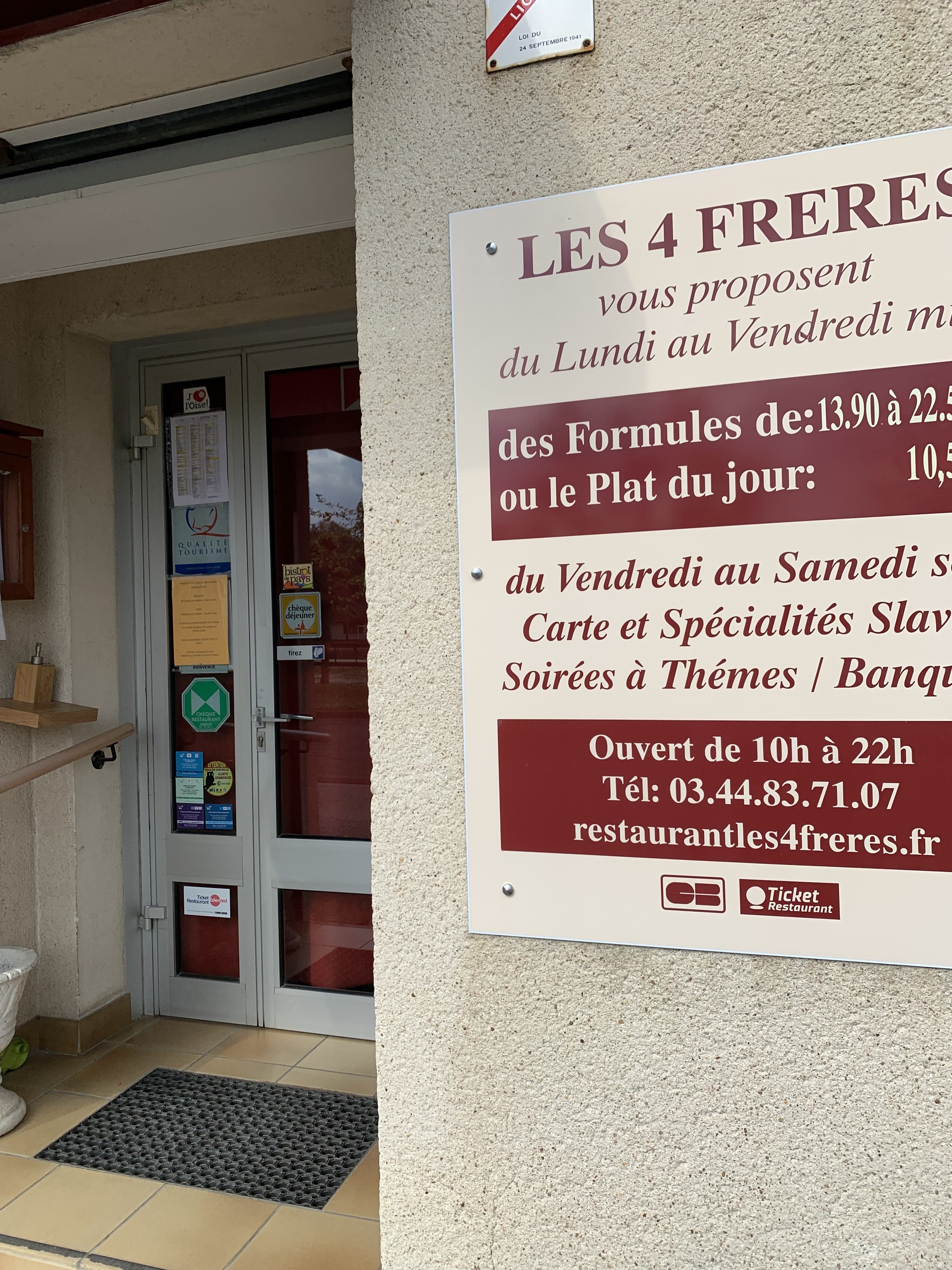 // Un de mes restaurants favoris dans le secteur du Compiègnois ! La cuisine est généreuse, l'ambiance est conviviale et on y découvre de bonnes spécialités. Mention spéciale pour la terrine des Balkans. Le titre de bistrot de pays est amplement justifié et mérité. Leur grande salle à une capacité d'accueil parfaite pour l'organisation d'évènements. Si vous n'avez pas encore découvert les 4 frères, qu'attendez-vous ?
