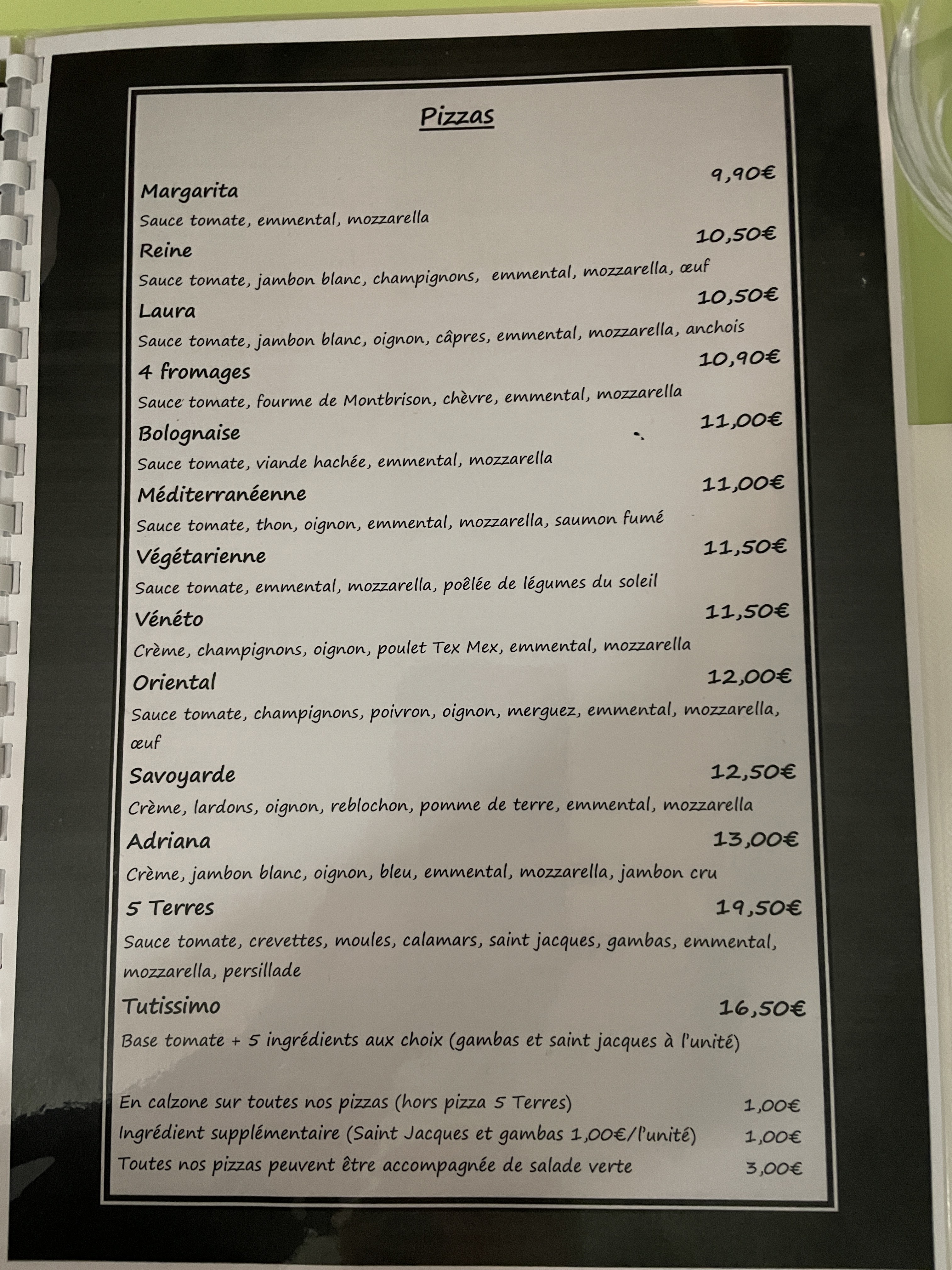 Pizza 5 terres excellente et très copieuse avec coquilles St Jacques et gambas 😏. Et en dessert profiteroles très généreuse. Un super accueil, je recommande sans hésitation.