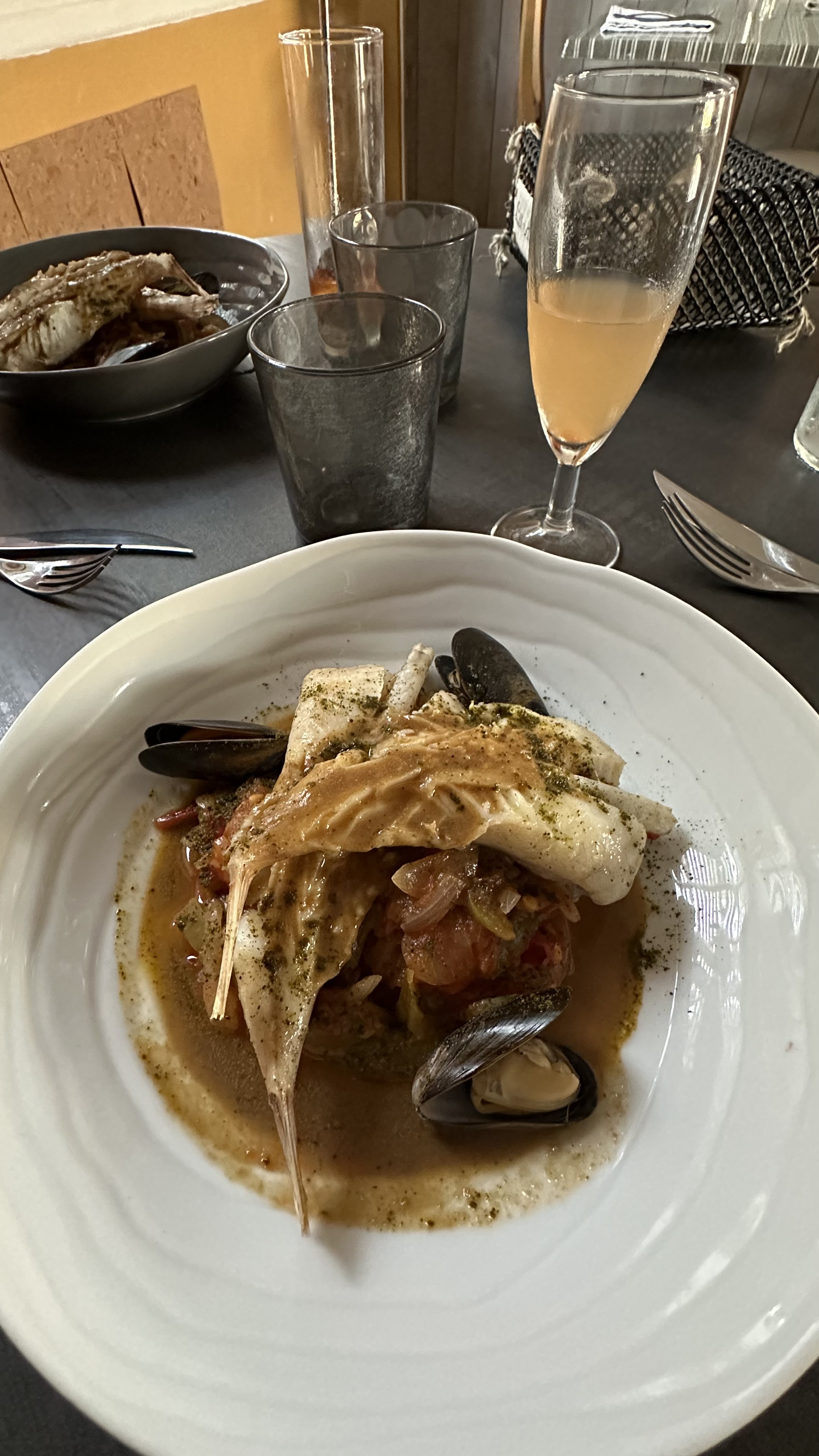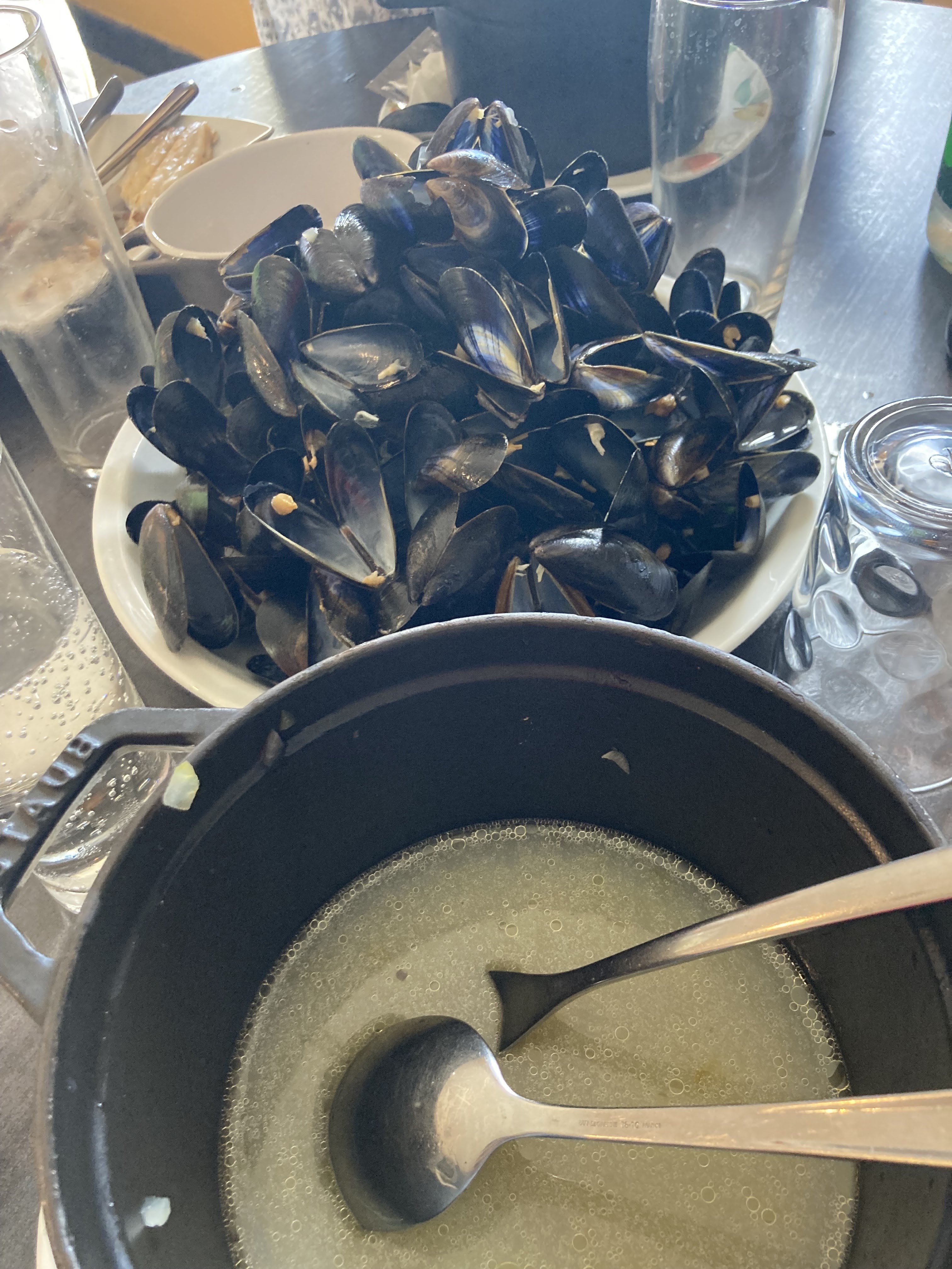 Gaspacho très bon. Moules petites mais très bonnes. Très bien