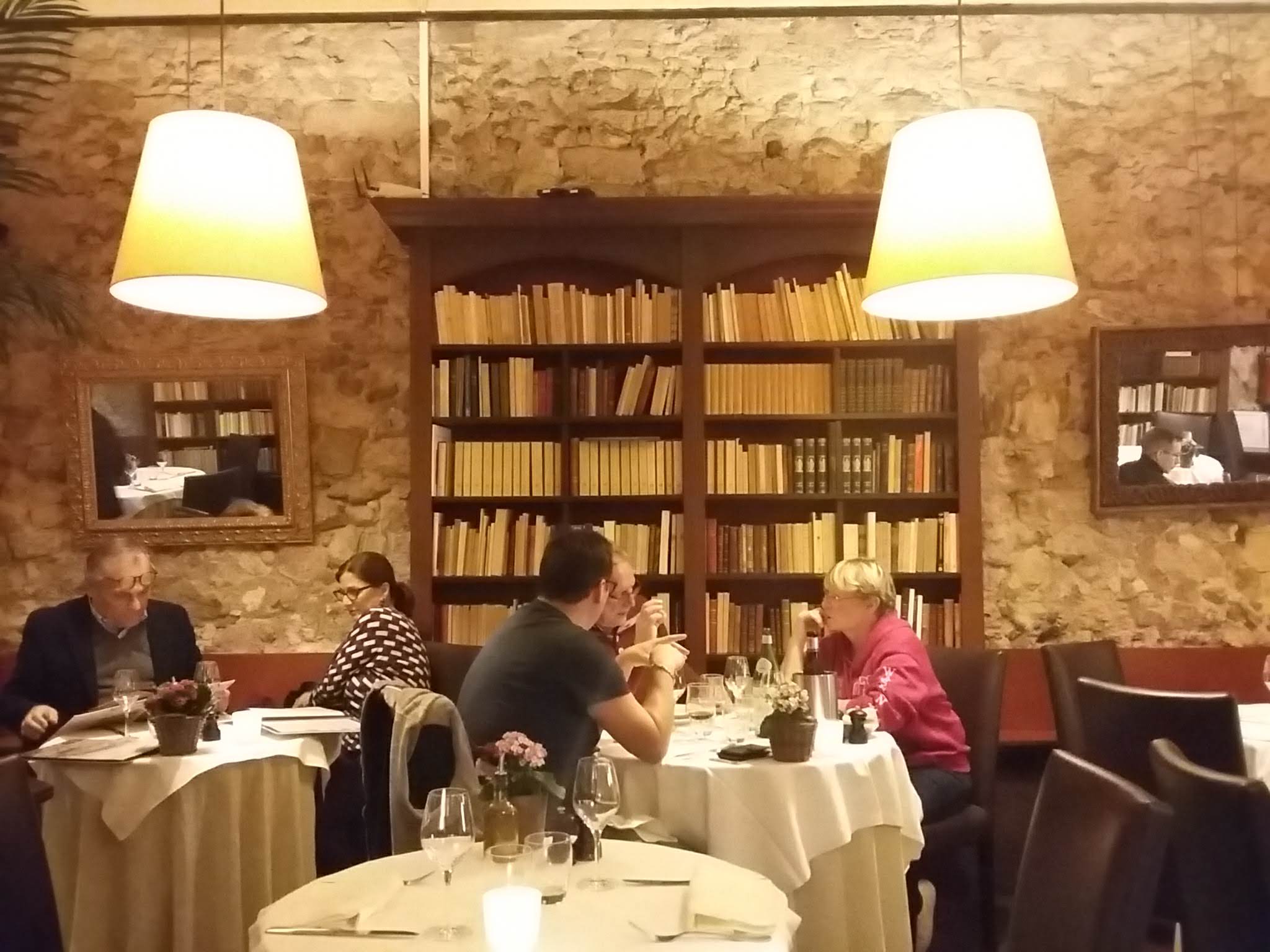 Un endroit très original, atypique. Ambiance très (trop pour moi) rustique, avec ses gros abats jours, mur en pierre et meubles en bois, ou plutôt bibliothèques en bois remplies de livres qui entourent les tables nappées rondes. Le service est impeccable, serveur très sympathique et qui ne manque pas d'humour. Le repas bon, des mets de qualité et raffinés.