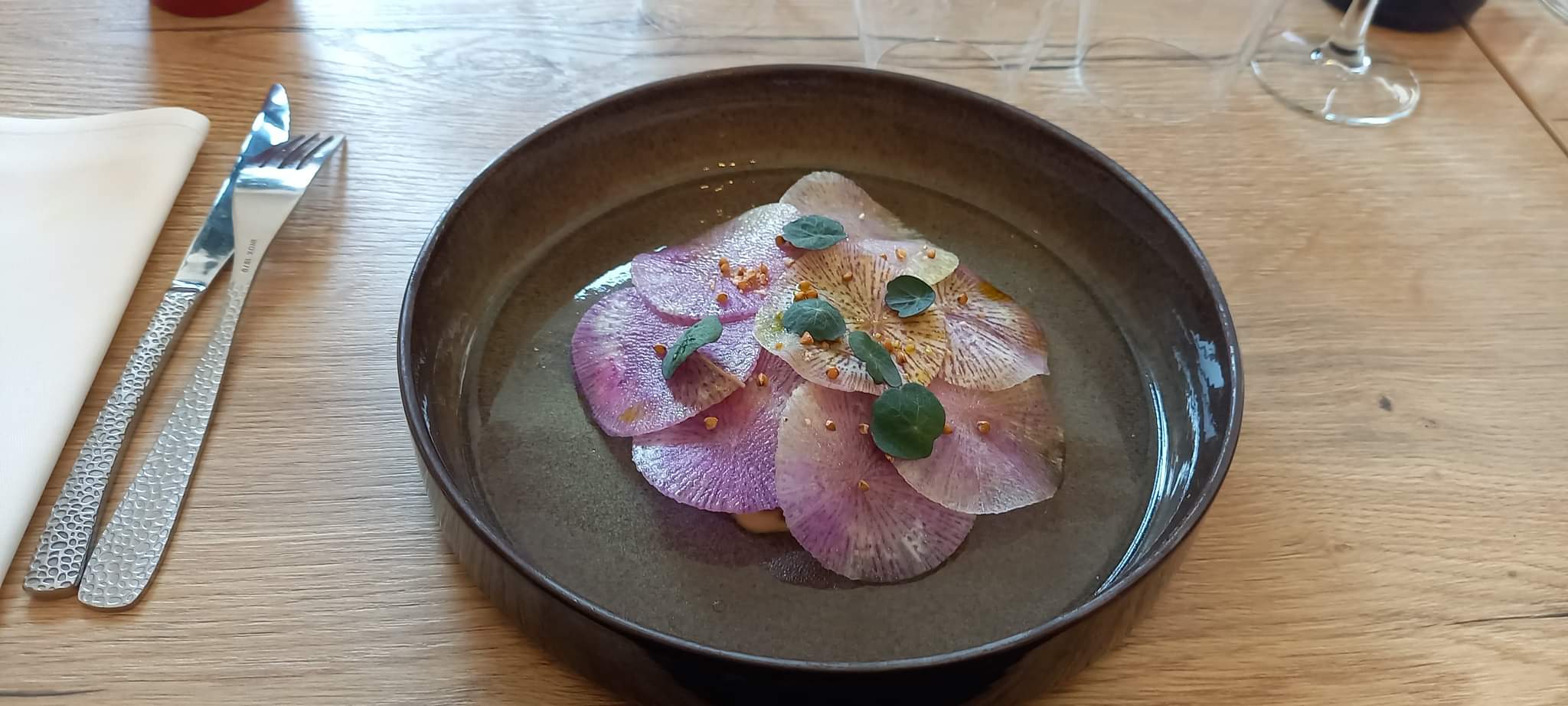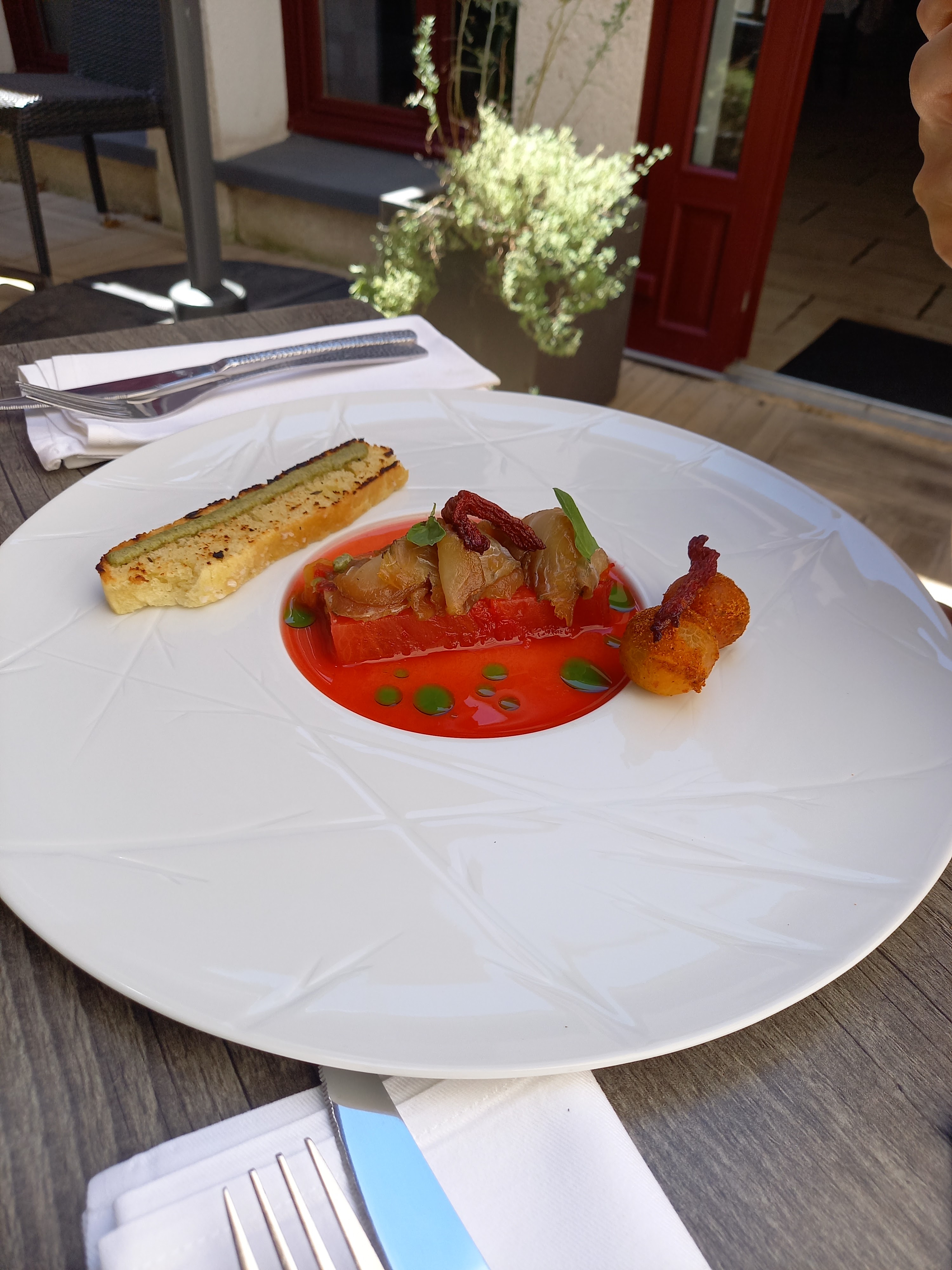 C’est une superbe découverte : une cuisine raffinée, inventive et sublimement bonne, un accueil chaleureux (malgré les difficultés actuelles (sous effectif) qui laisse des tables inoccupées). On a tout aimé….. et on a apprécié le changement de plat lorsque l’un de nous, allergique aux fruits rouges, n’a pas pu dégusté son dessert. On vous recommande de vous laisser tenter : c’est absolument délicieux