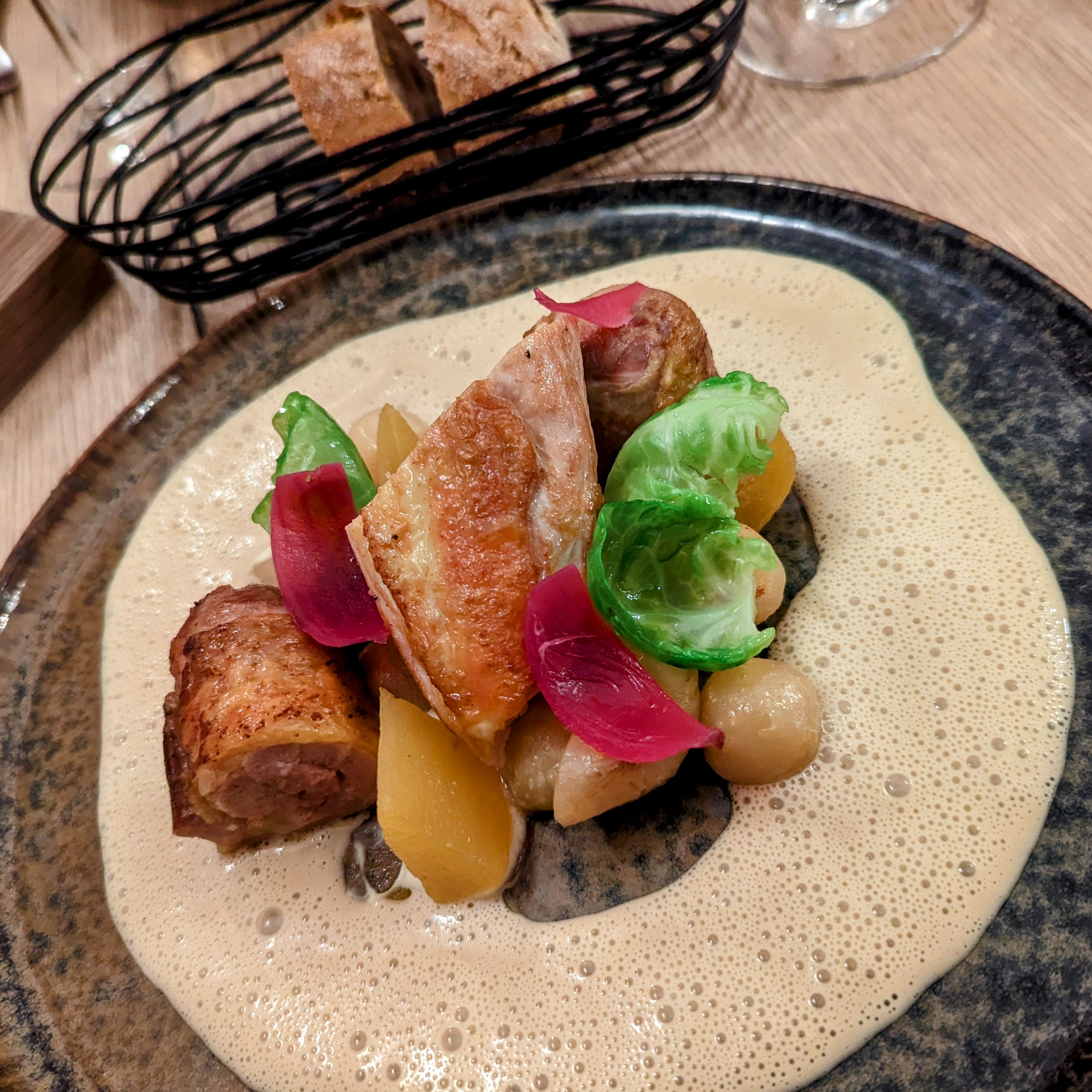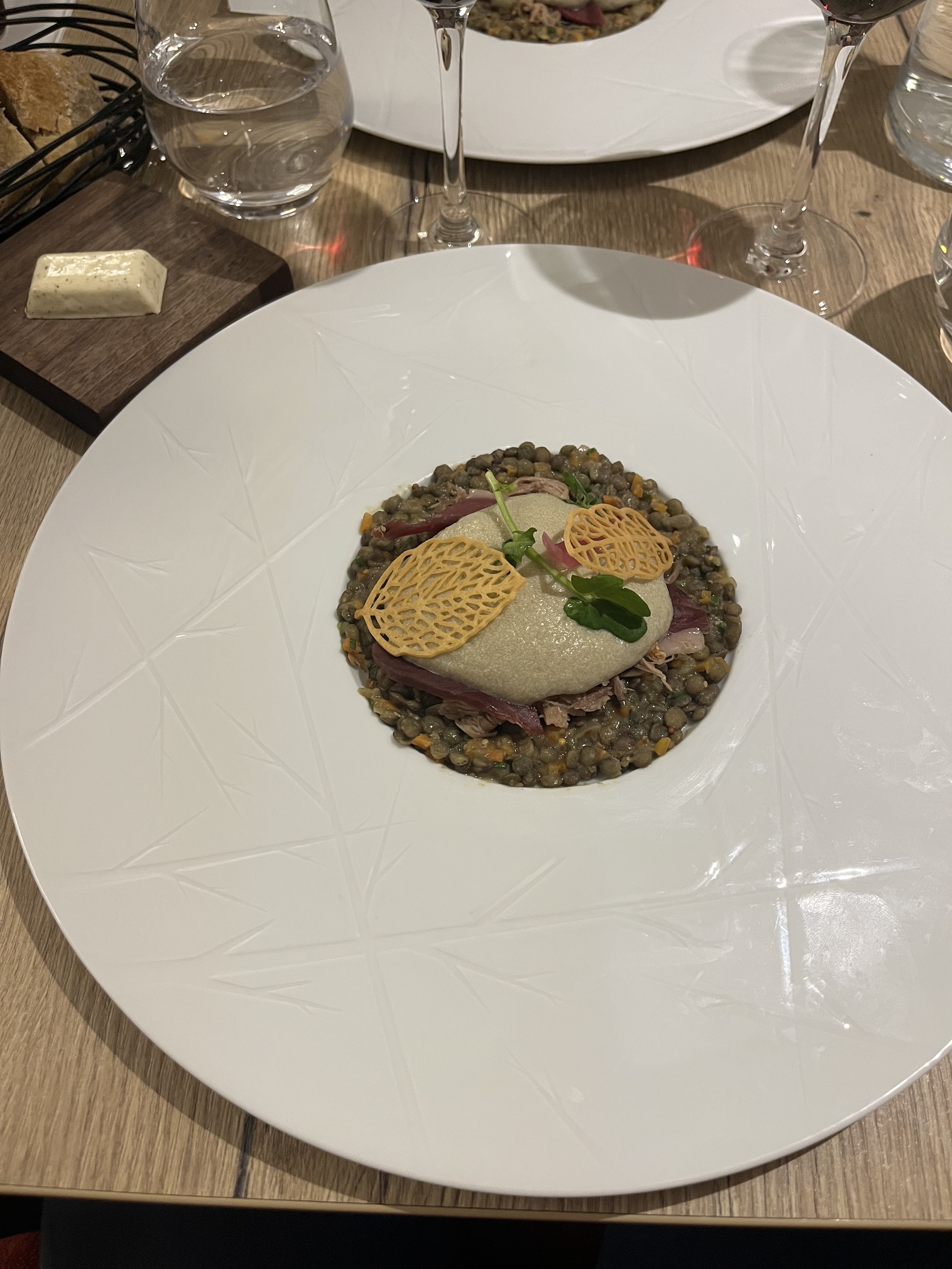 Ce soir, nous avons eu un délicieux dîner chez @les_arpents. Nous avons dégusté des repas remarquables en France, des dîners locaux rustiques à la haute cuisine. Pour moi, c'est celui-ci qui remporte le prix. Service chaleureux et convivial, ambiance détendue et un de ces menus courts mais durs parce que tout se lit si bien... Mon apéritif au kir royalle m'a aidé à calmer mes nerfs 😉. Laissez-moi vous expliquer mon repas : Après un apéritif (gratuit) et un amuse-bouche (chou rouge braisé et gravlax), mon entrée de langue de bœuf (ne soyez pas dégoûté, c'est super savoureux) et mes escargots aux légumes verts et mousse de moelle de bœuf ont donné un bon départ. Le plat principal de pintade rôtie (poitrine rôtie succulente et cuisse confite), légumes d'hiver et sauce poulet au vin jaune est un concurrent sérieux pour le repas de ma vie. Et j'en ai eu quelques-uns. Je crois sincèrement que c'était probablement la meilleure sauce que j'ai jamais mangée, si bonne que nous y retournons plus tard dans la semaine pour que Cathie puisse commander la même chose. Je ne vous rendrai probablement pas la faveur de manger la moitié du sien 😁. Tout s'est déroulé de manière sensationnelle avec le 1er Cru Chablis 2015. Un intermède fromage avant le dessert... Puis une délicieuse tarte au citron (Cathie a pris une poire au vin rouge avec une glace au yaourt). Terminé avec un digestif à l'Armagnac ! Un prix très raisonnable, pour la haute qualité. Très Bien.