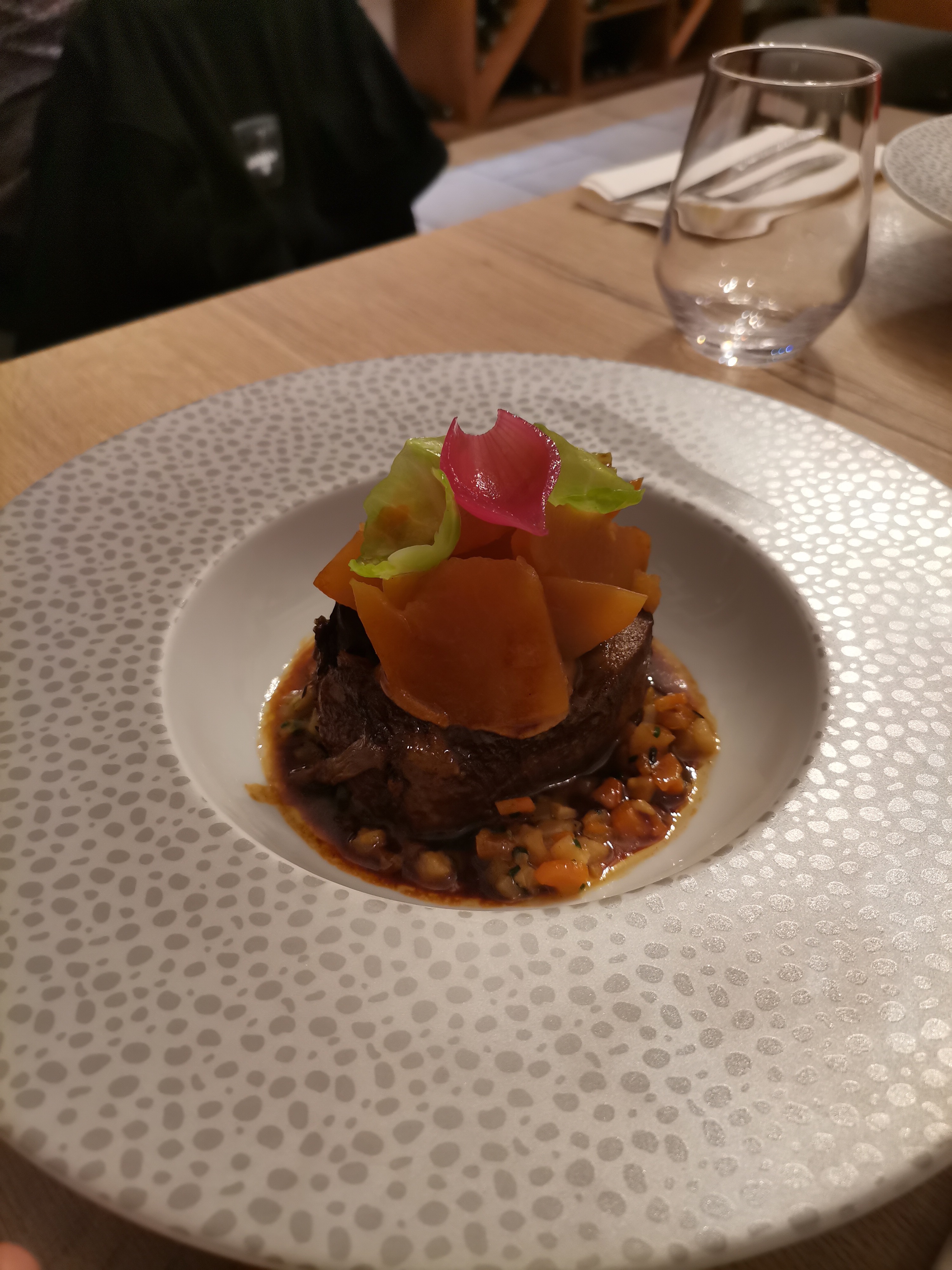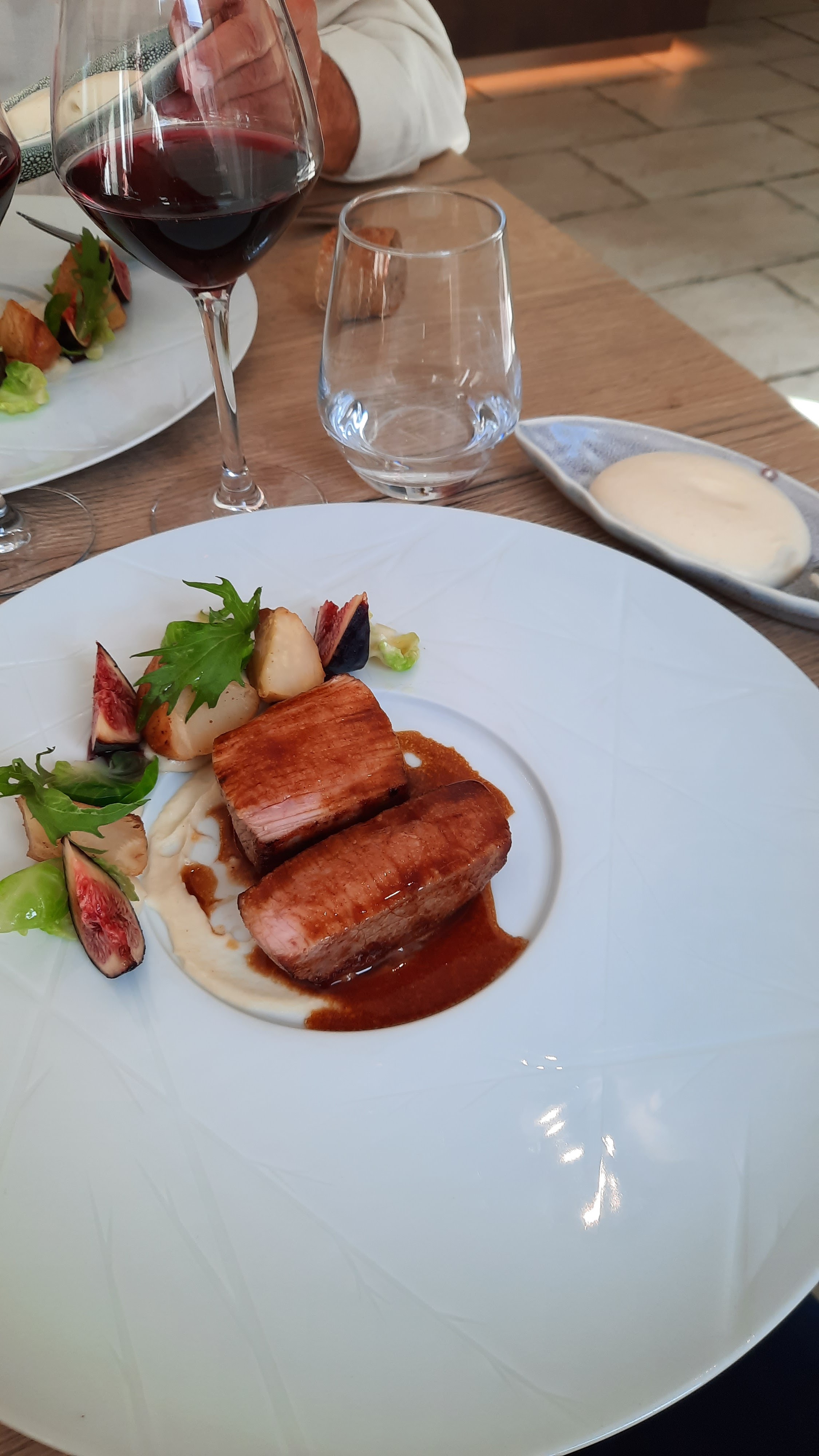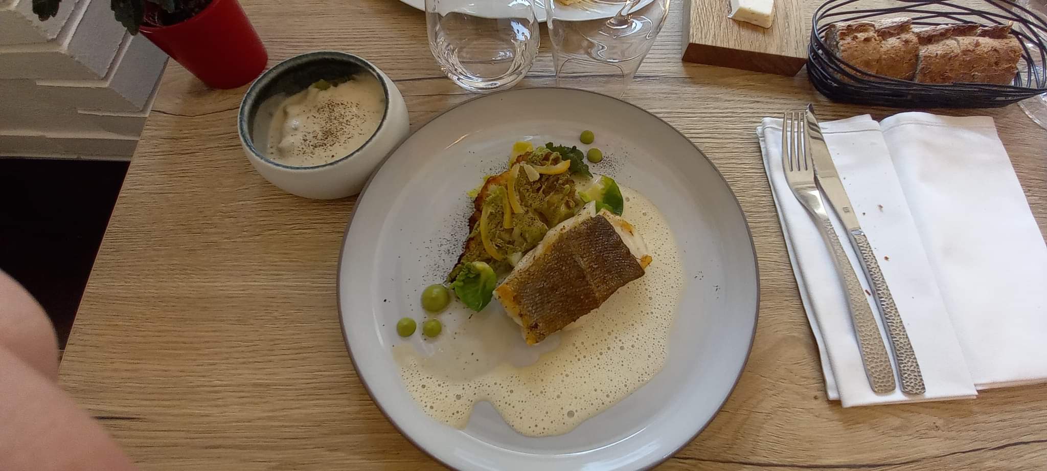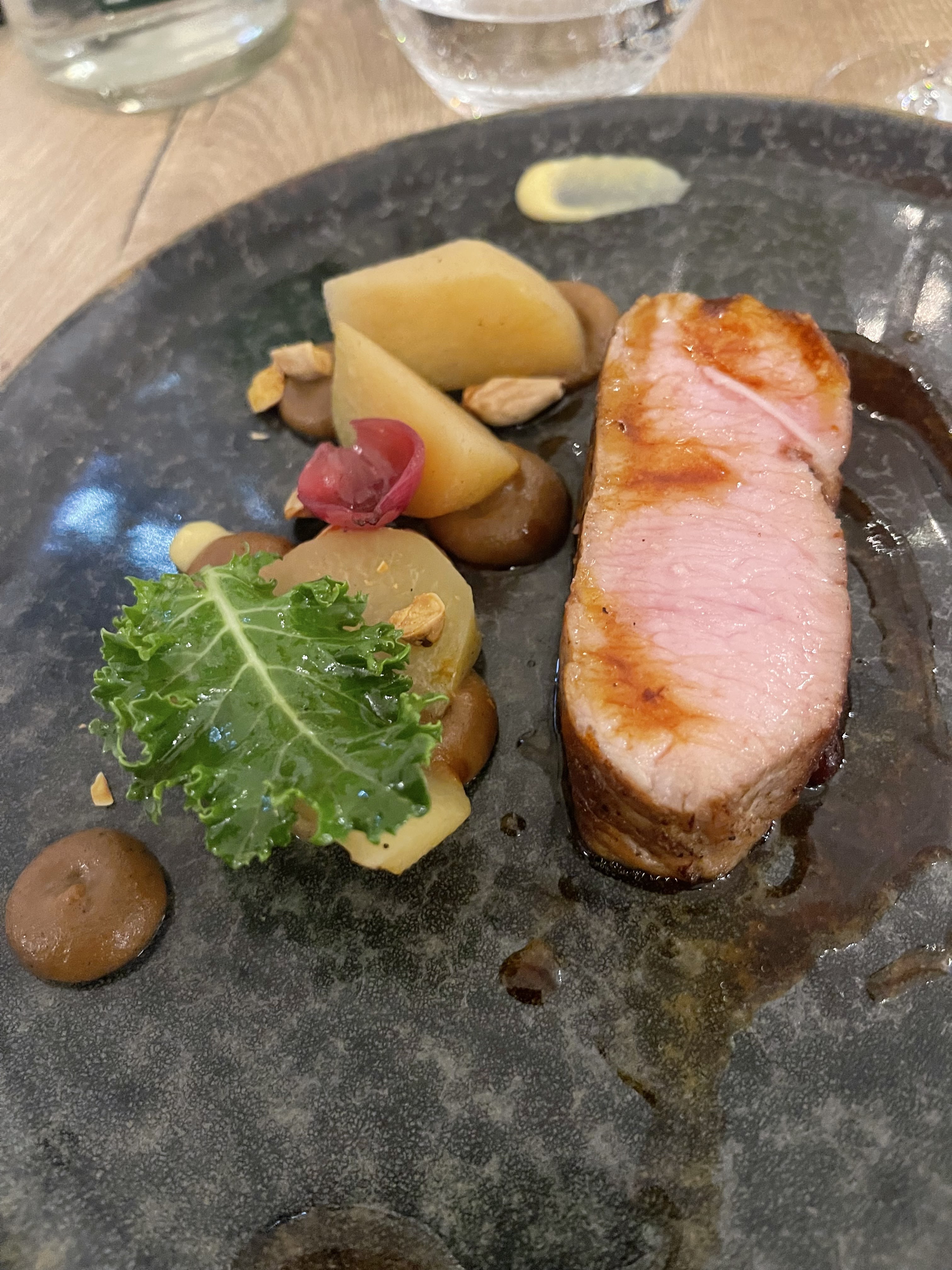 Un très bel accueil, de très belles assiettes, beaucoup d’attente et des plats qui n’ont pas émoustillés mes papilles. Accompagnent de la pièce de bœuf très salé et aucune explosion de saveurs en bouche. Le dos de cabillaud un peu trop cuit et ne se mariait pas forcément avec l’artichaut… Assez déçue pour un Michelin et Gault et Miault. Pas vraiment adapté aux jeunes enfants non plus… J’ai du échanger mon plat (pièce de bœuf) avec celui de ma fille (dos de cabillaud)