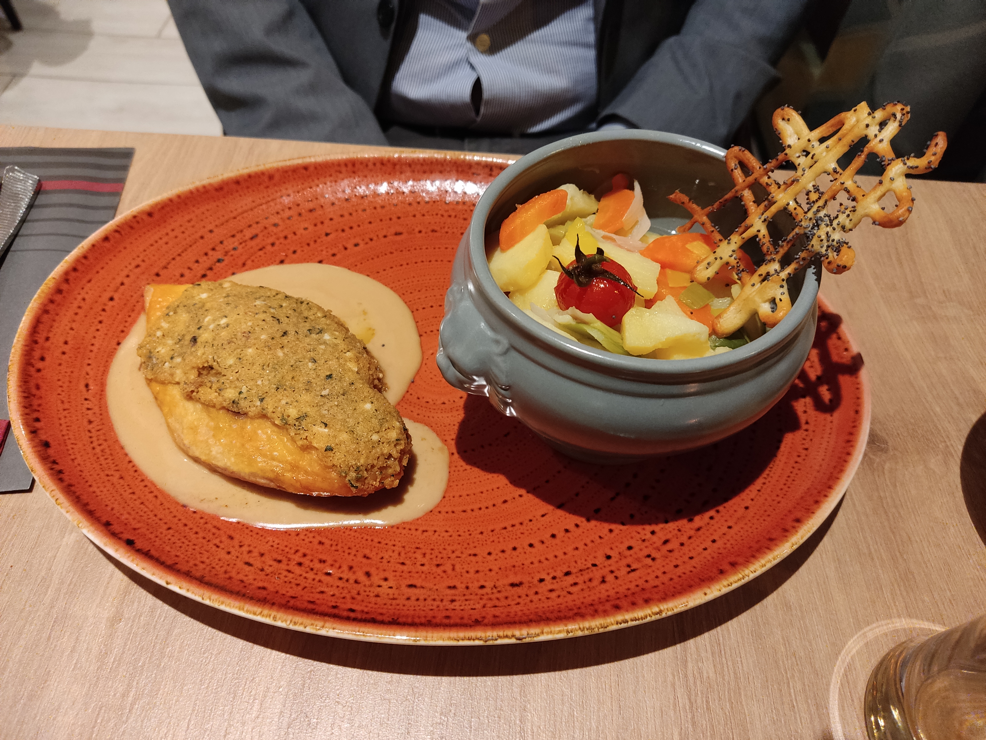 C'était un repas de travail et on a pas eu le choix dans le menu. Perso, j'aurais préféré entrée + plat et non pas plat + dessert. Sinon, très fin et très bon. Les portions sont trop petites... Pas une adresse pour des travailleurs manuels. Bon accueil et belle déco !