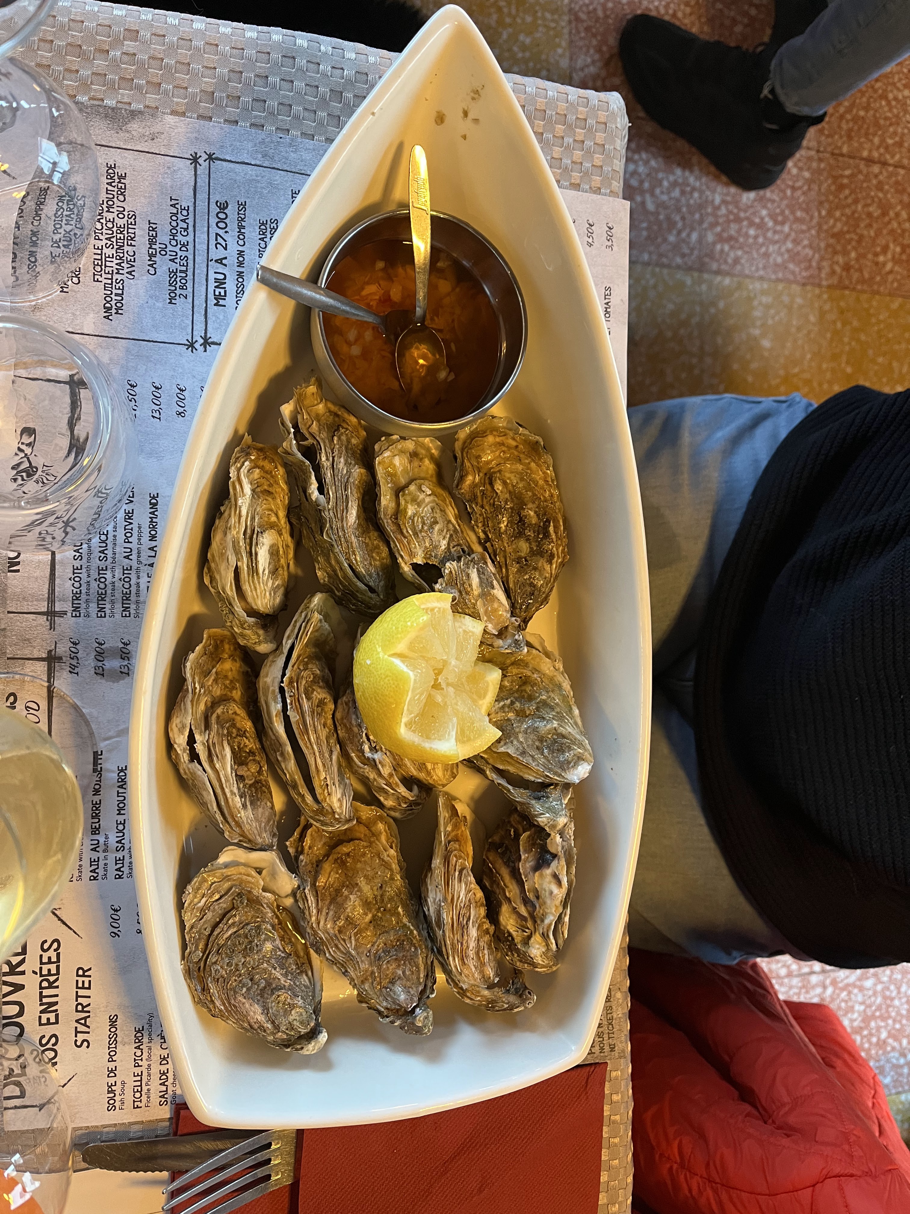 C est un peu long ..., mais c était bon ! Des huîtres petites mais très fraîches, de bonnes moules avec des frites un peu trop cuites, une raie moutarde très fraîche accompagnée de légumes délicieux et de riz blanc, et enfin de bonnes glaces Une serveuse sympathique