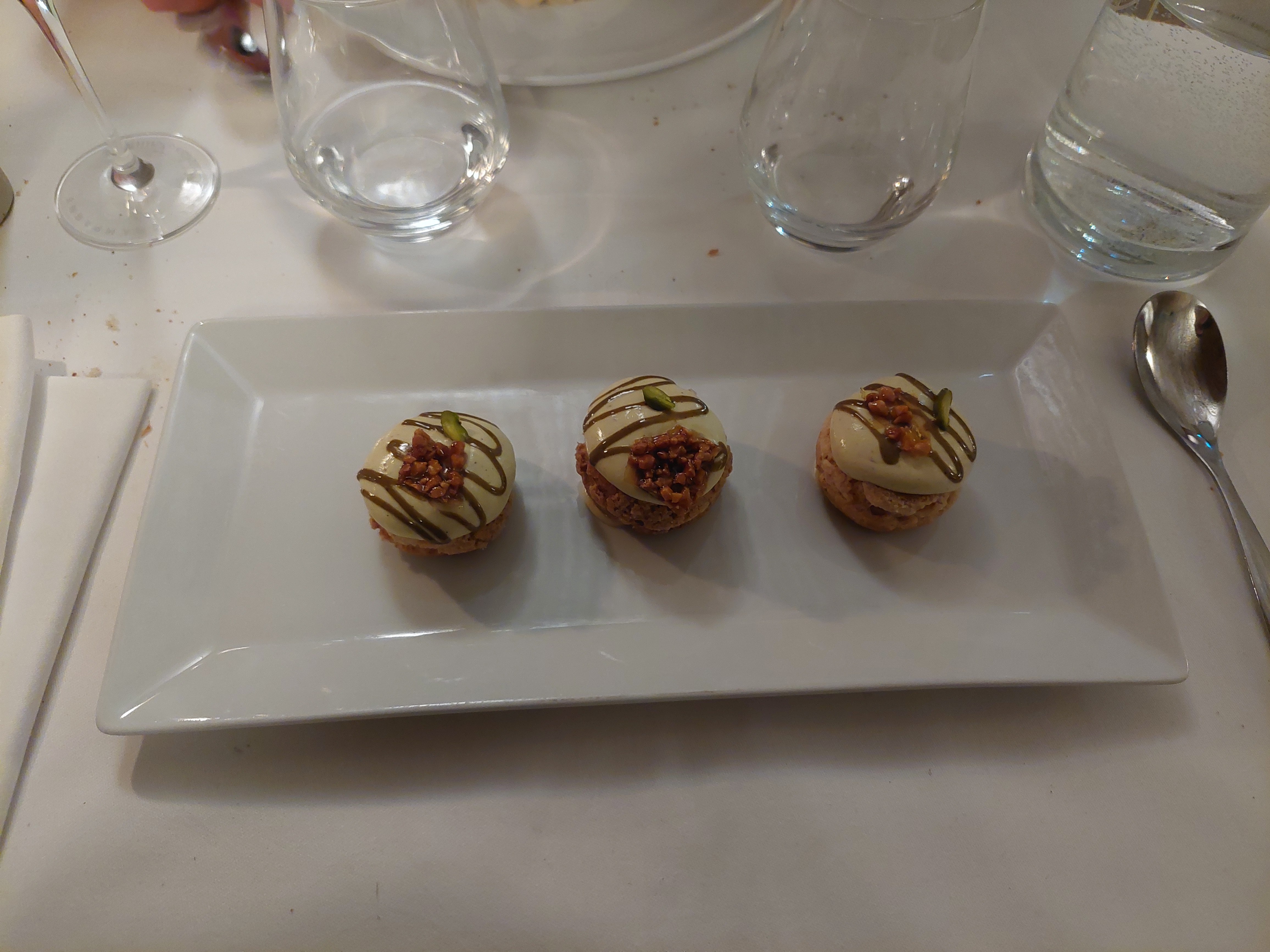 Personnel très gentil mais un peu débordé. On ne nous a pas proposé de vin pendant le repas alors que si j'ai bien compris il y a une cave impressionnante. La salle etait bruyante car l'acoustique est mauvaise. Concernant la nourriture, le riz du risotto craquait sous la dent, j'étais déçue, et le reste était plutot bon. Bref experience moyenne