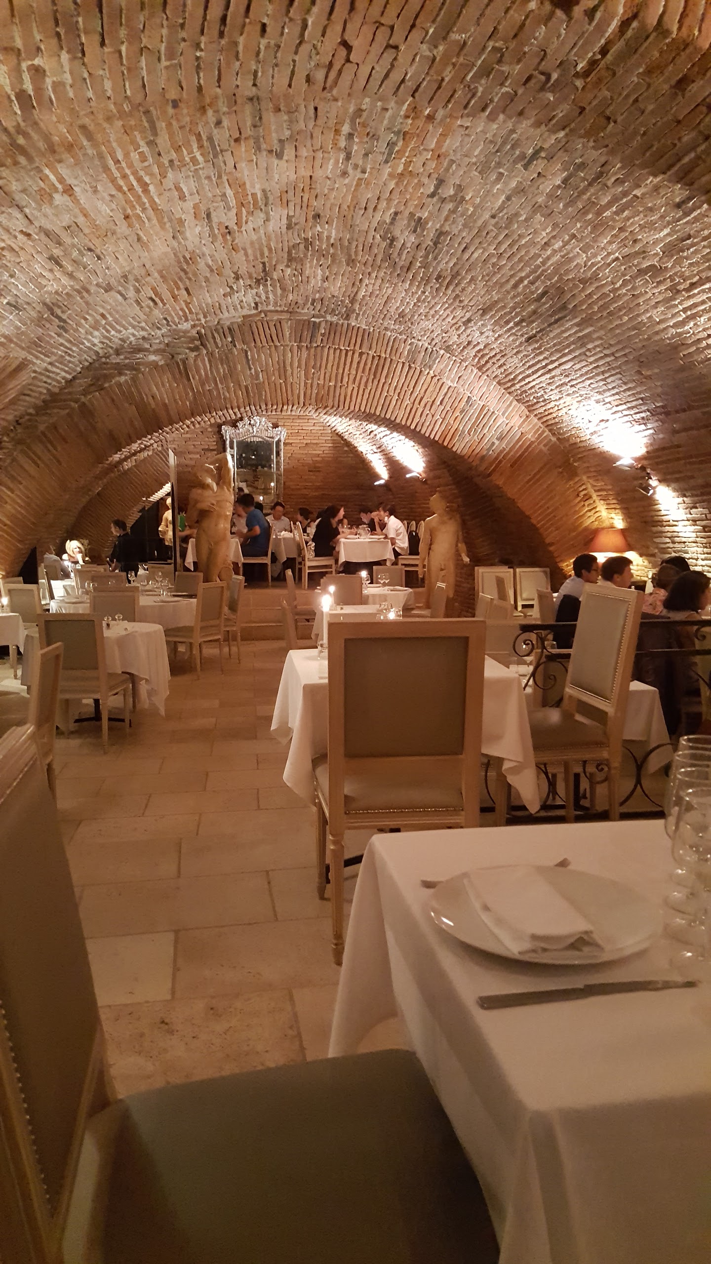 Cadre magnifique, dans une cave voûtée. Malheureusement, l'expérience n'est pas à la hauteur du standing qu'inspire cet établissement. Les plats sont bons mais sans plus, le rapport qualité-prix n'est pas au rdv. Deux plats (entrée et dessert) commandés ne correspondaient pas exactement à ce qui était écrit sur la carte. Par exemple, avec l'assiette de fromages, il était annoncé un chutney maison... qu'ils ne font plus. Je l'ai découvert à la réception de l'assiette. Pas de geste commercial, ni de proposition de changer de dessert. Nous sommes repartis déçus.