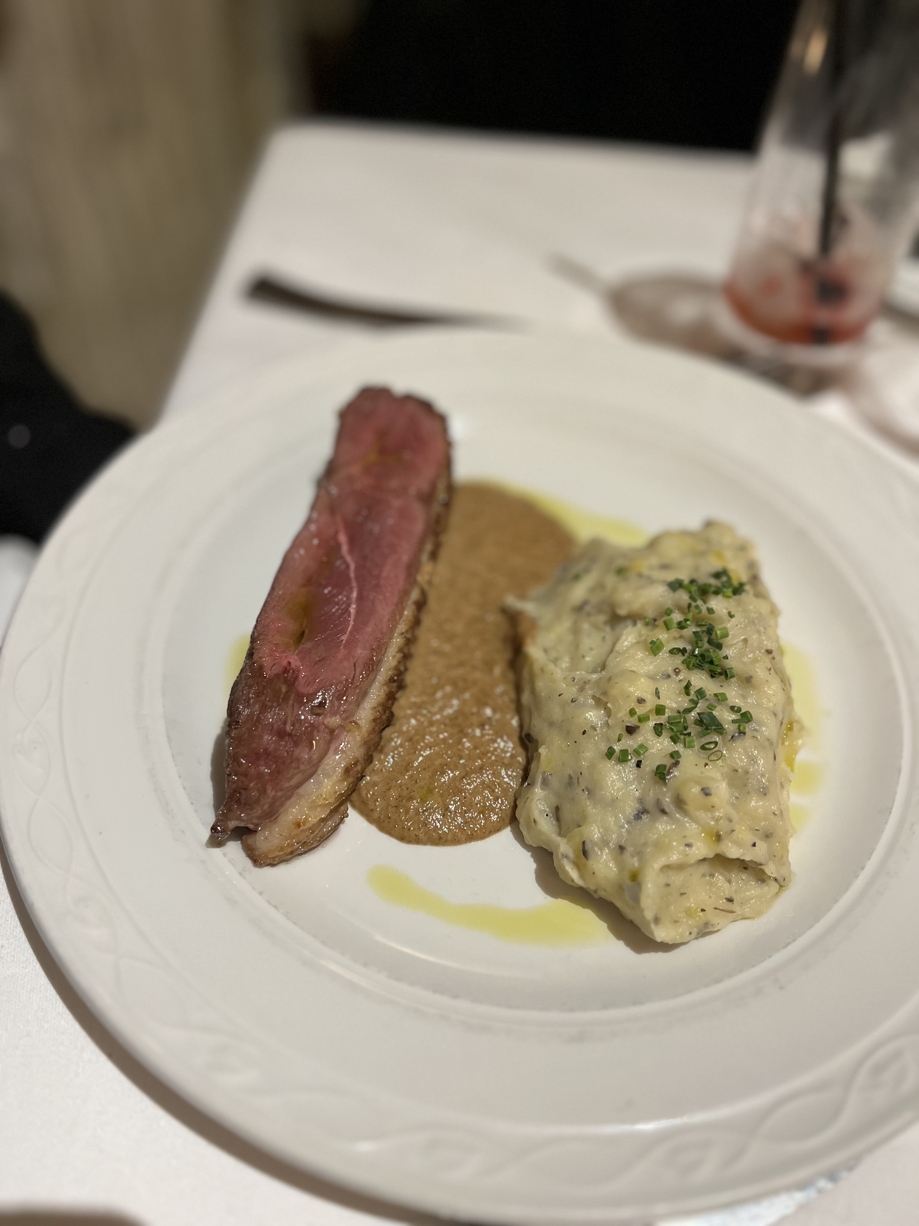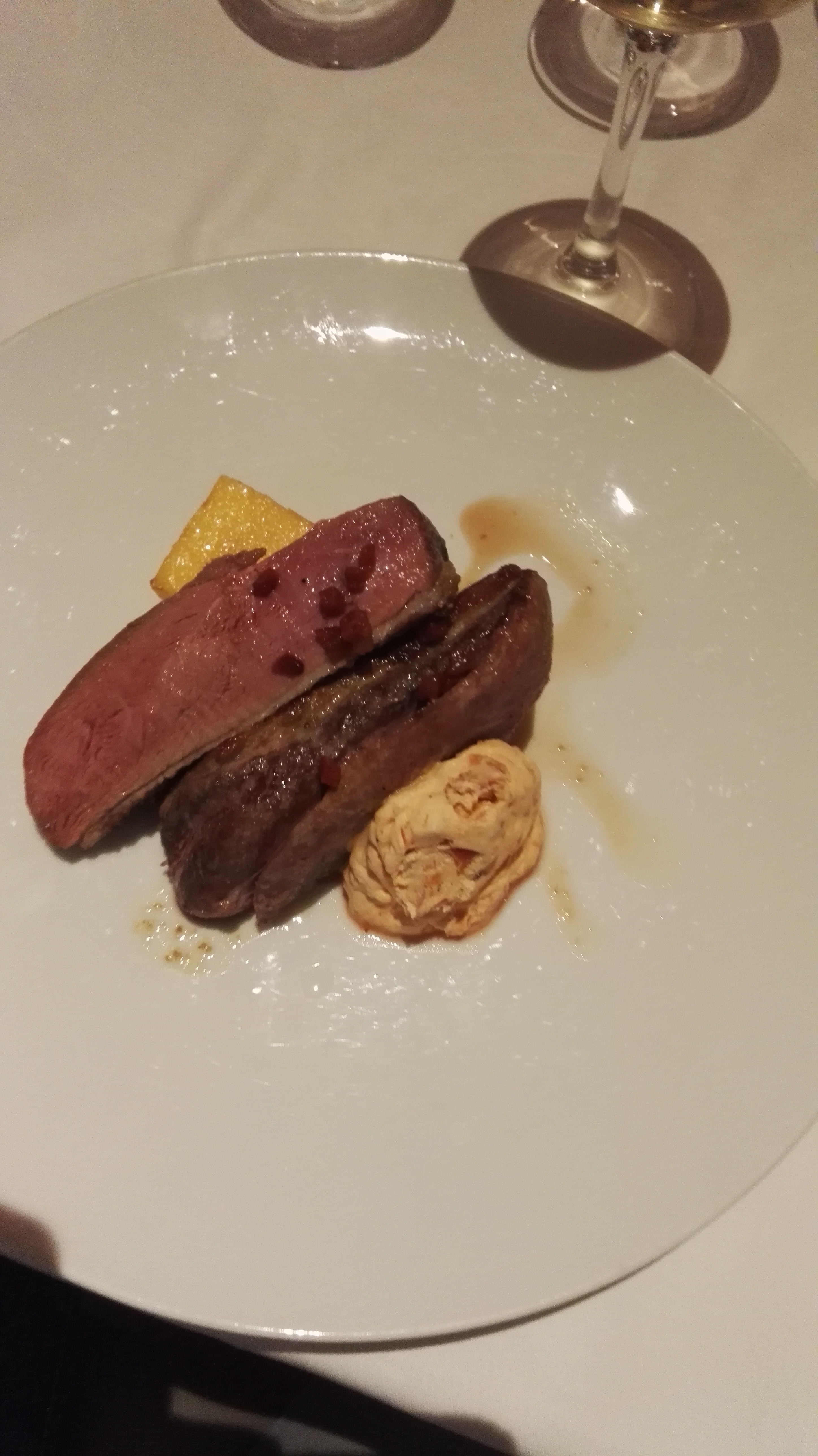 Ambiance feutrée, service et repas au top, excellent conseils du sommelier. Parfaite soirée !