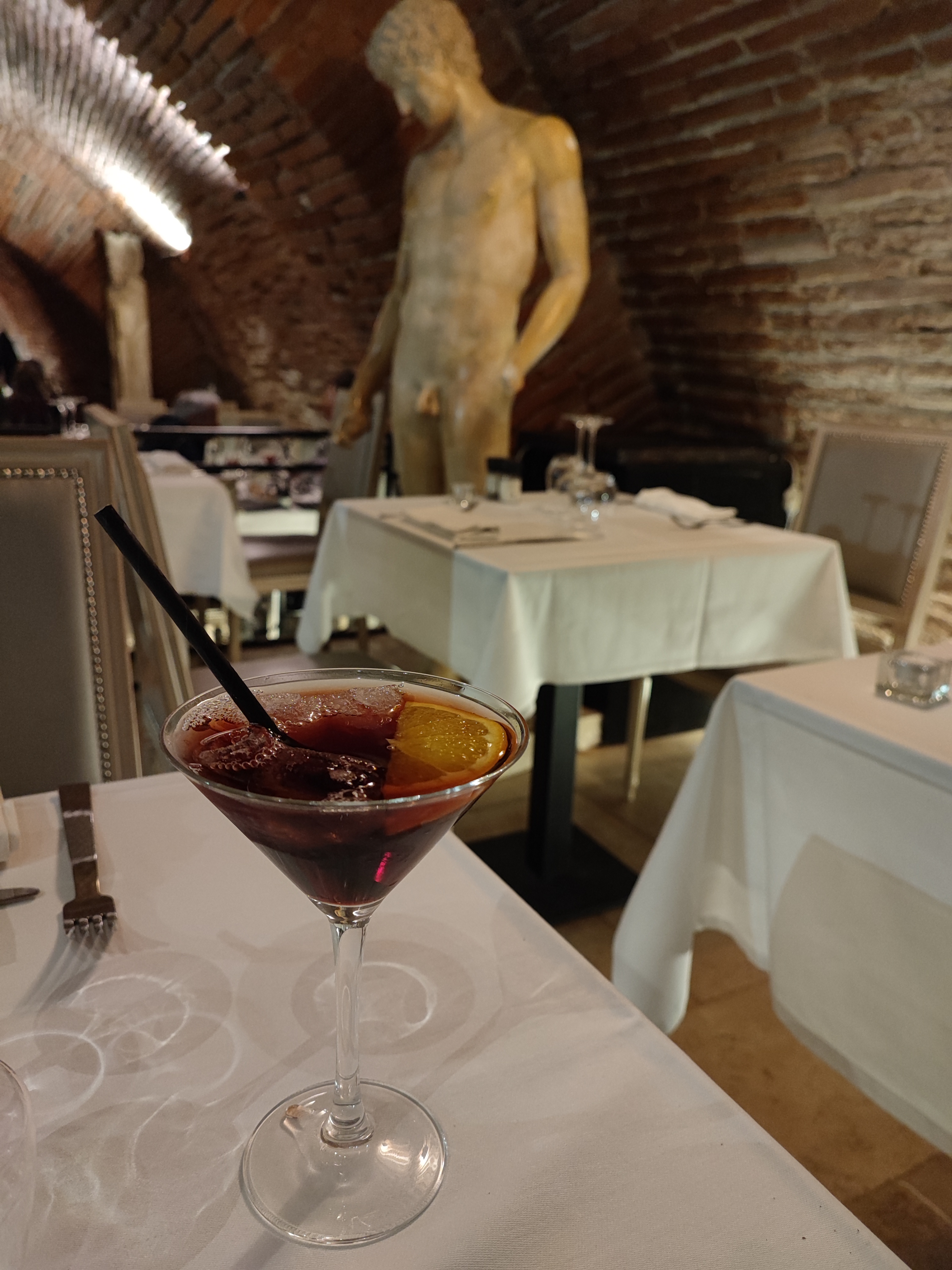 Restaurant conseillé par un ami: grosse surprise sur place car le décor est magnifique, belle ambiance créée littéralement dans les caves au millieu de statuts à l'allure authentique. Nous avons pris une majorité de plats à base de viande: Délicieux ! Finement préparés, des associations de goût aussi inattendus qu'apréciables. Le service est impeccable, rendu même agréable par un homme qui a su prendre part à nos choix ainsi qu'à l'ambiance pour rendre meilleur ce moment dans tous ces aspects.