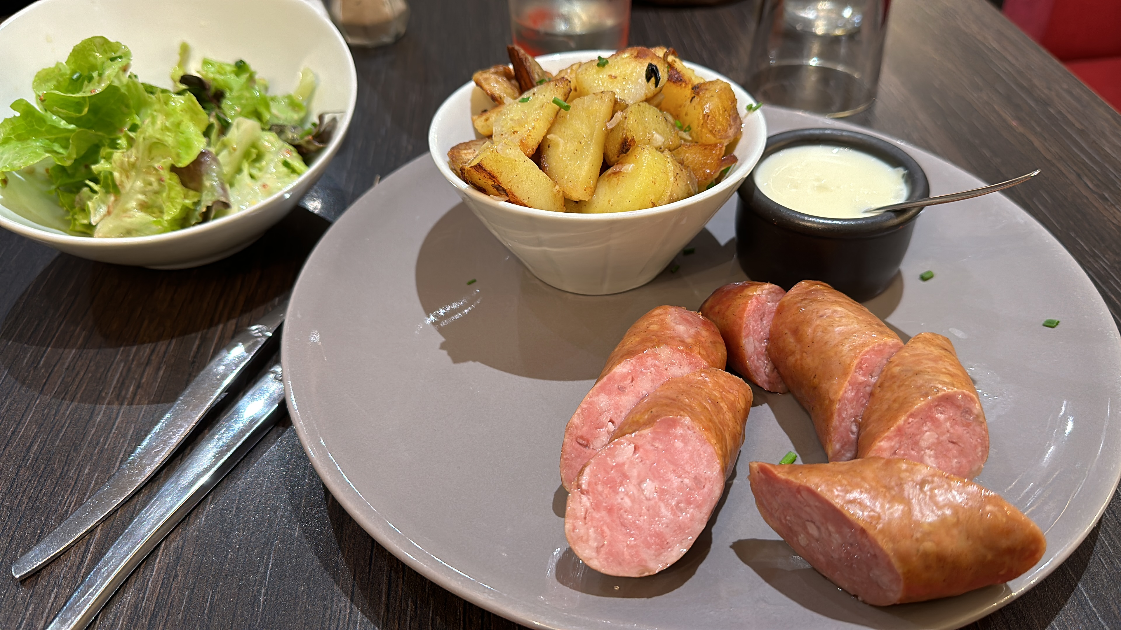 Nous avons attendu 30 minutes une assiette Fran-contoise .tres peu de salade ,la saussice dure et les pommes de terre un petit ramequin rapport qualité prix pas très bien