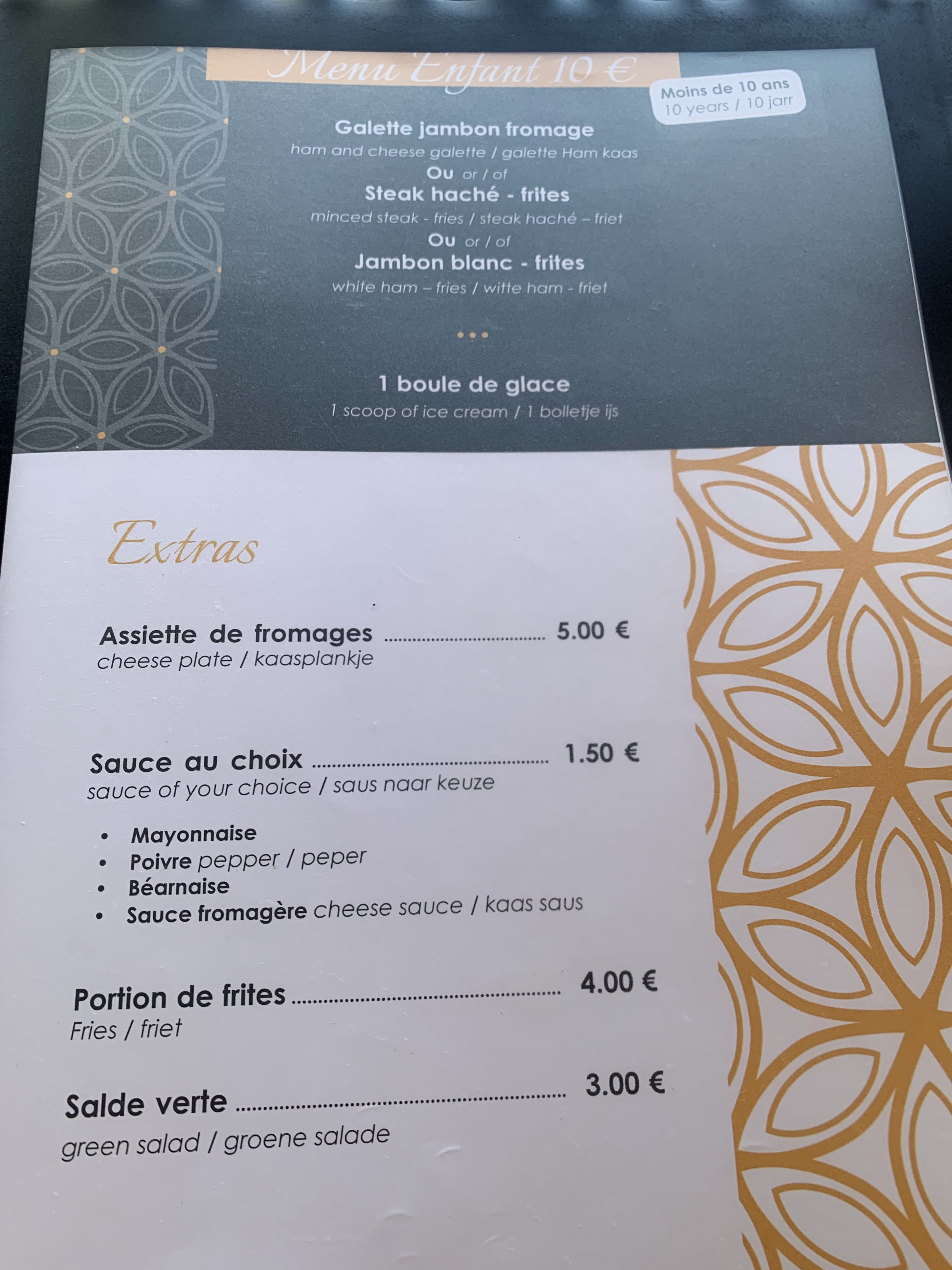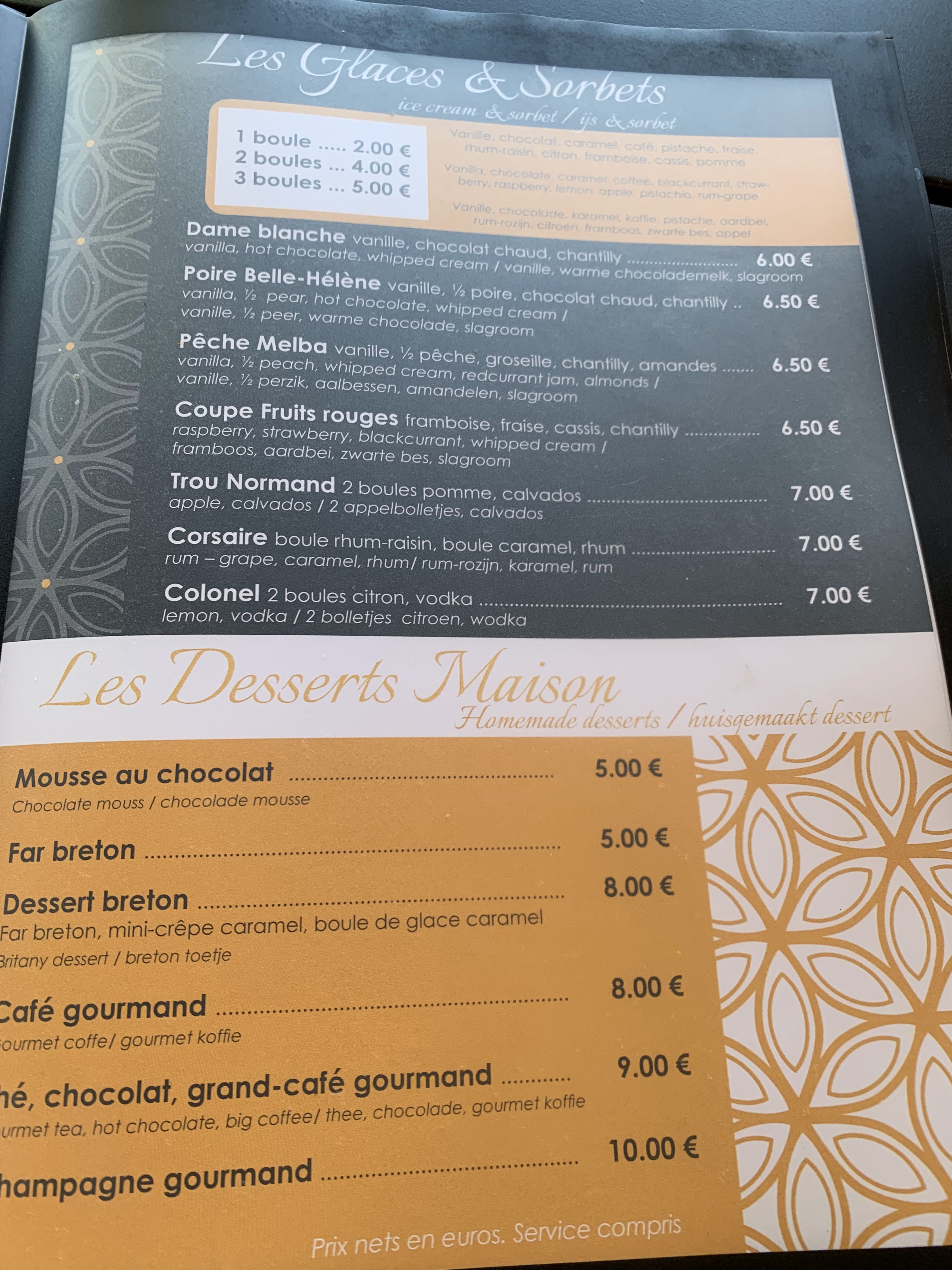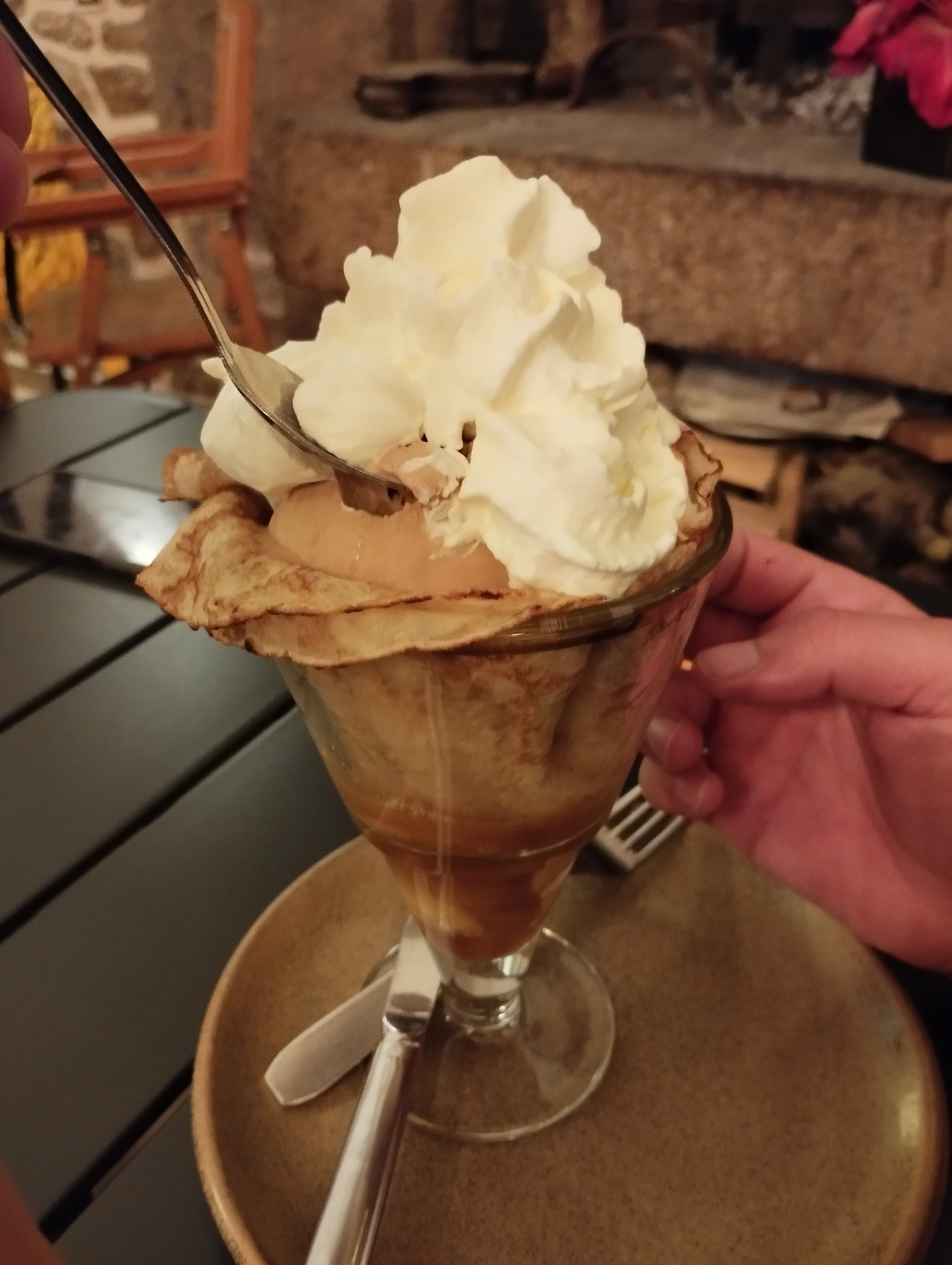 Délicieuses crêpes, galettes, moules frites et coupes glacées. Nous recommandons.