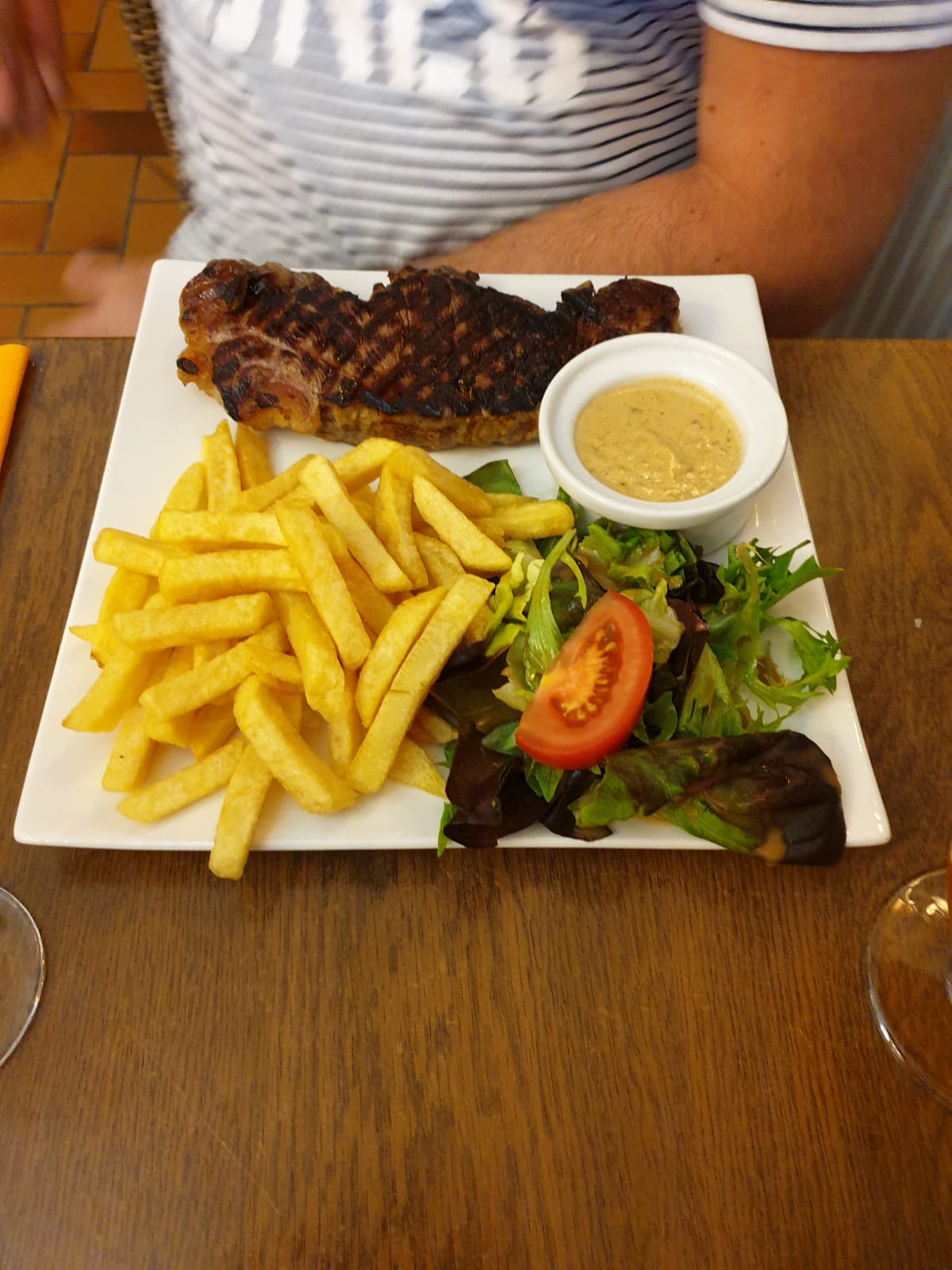 Nous avons eu un bon repas ici. La viande était savoureuse et tendre. Les frites étaient croustillantes. Le dessert fleur de Bretagne était une véritable explosion gustative. Et le vin... incroyable !!