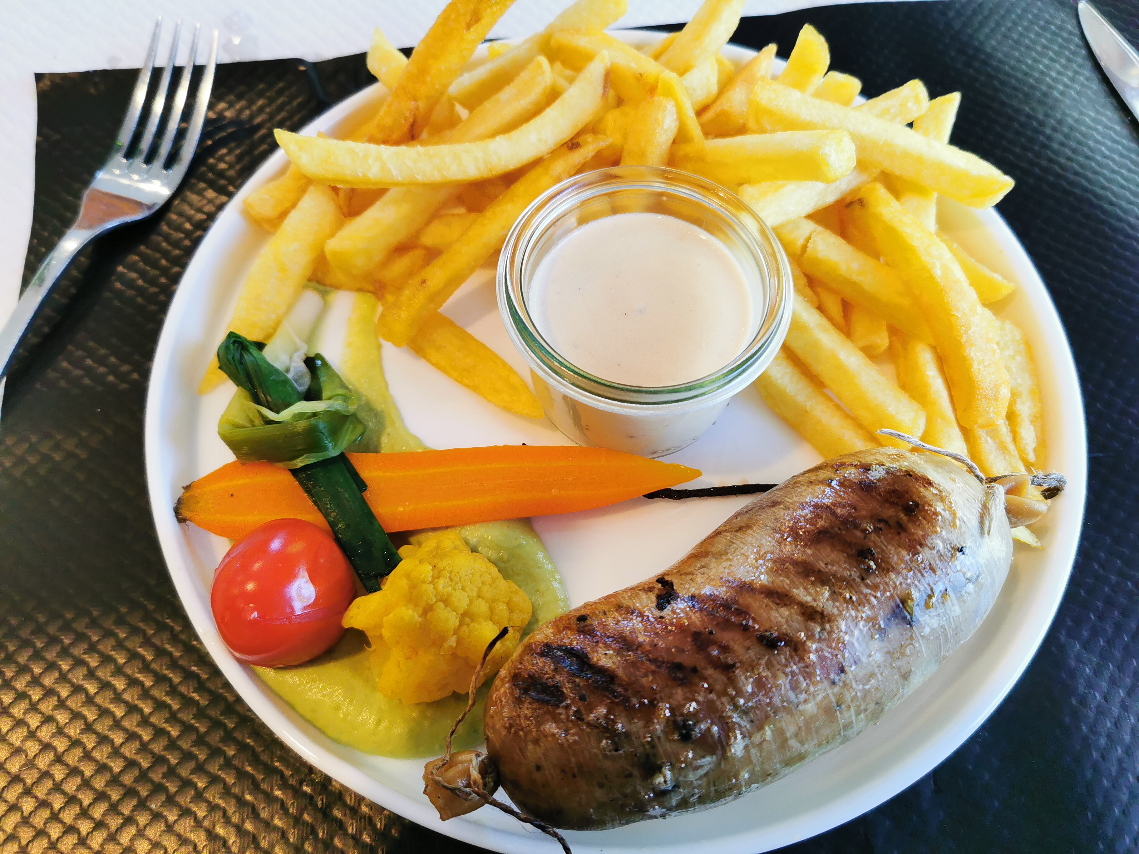 À éviter si vous avez faim. Menu du soir à 22€. J'ai commandé en entrée jambon melon : sur l'assiette 6 tranches de melon tellement fines qu'on voit à travers, une 'feuille' de jambon et 10cm2 de laitue. Le plat : voir photo : l'équivalent de 2 cuillères à soupe de purée, 160gr de poisson et une mini brochette de 2 tomates cerises. Seul le dessert était copieux. Cependant, il était impossible de découper la galette avec la cuillère à café fournie. J'ai dû moi-même me procurer un couteau et une fourchette sur la table voisine. Le repas enfant (10€) était bon et copieux. Cependant, impossible de demander du ketchup pour accompagner le steak haché. Et pour finir, le chien du restaurant qui crotte entre les tables et le serveur qui marche dedans puis l'étale...