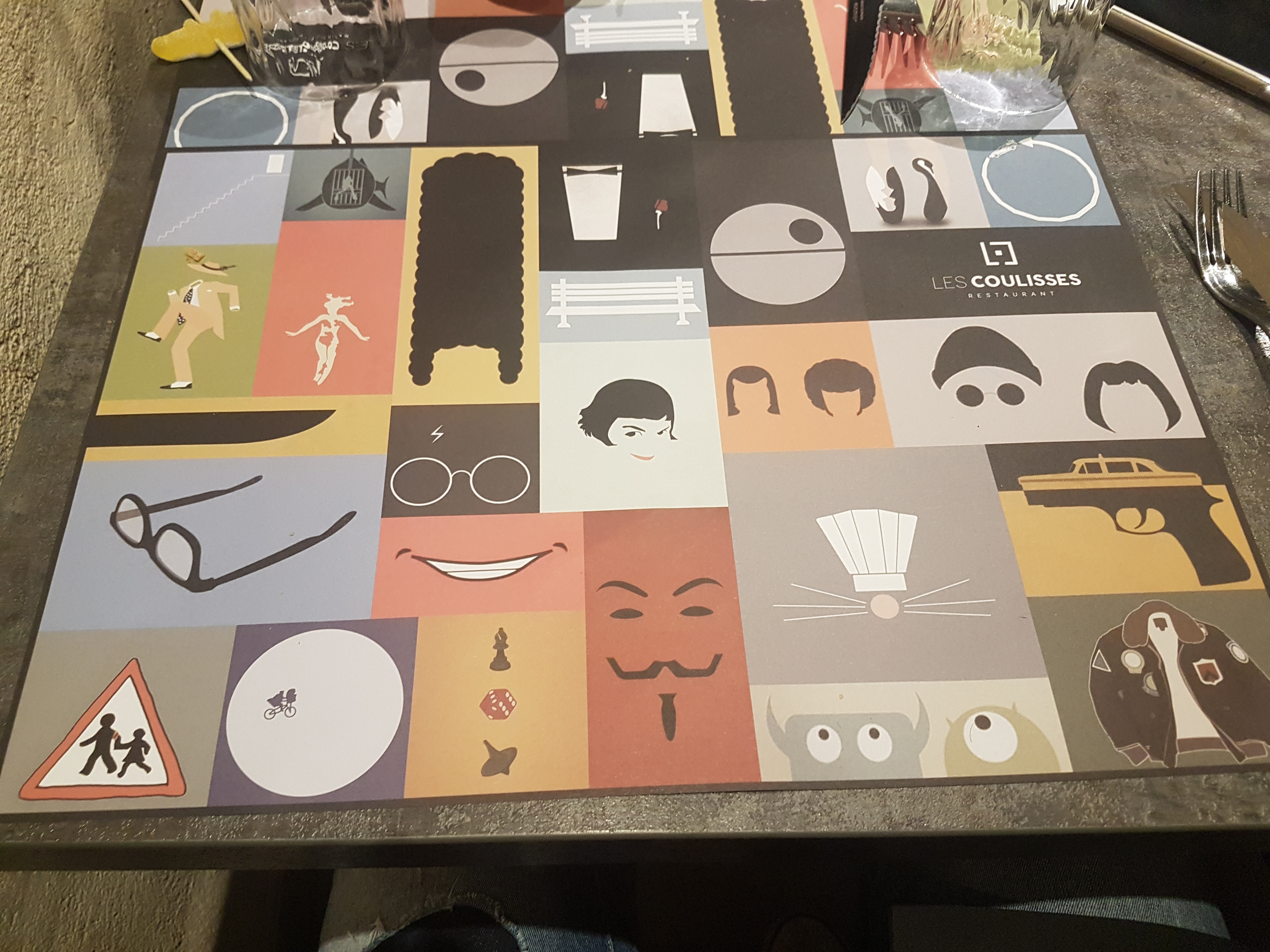 Restaurant très sympa par le cadre , les clins d'oeils cinématographique et le personnel . On mange bien , on mange frais , on mange maison donc véritablement content de tout cela . Le set de table est vraiment génial il me manque d'ailleurs 4 images ...... au cas oû quelqu'un peux m'aider !!! Les portions ne sont pas énormes mais qu'est ce que C est bon !!!!