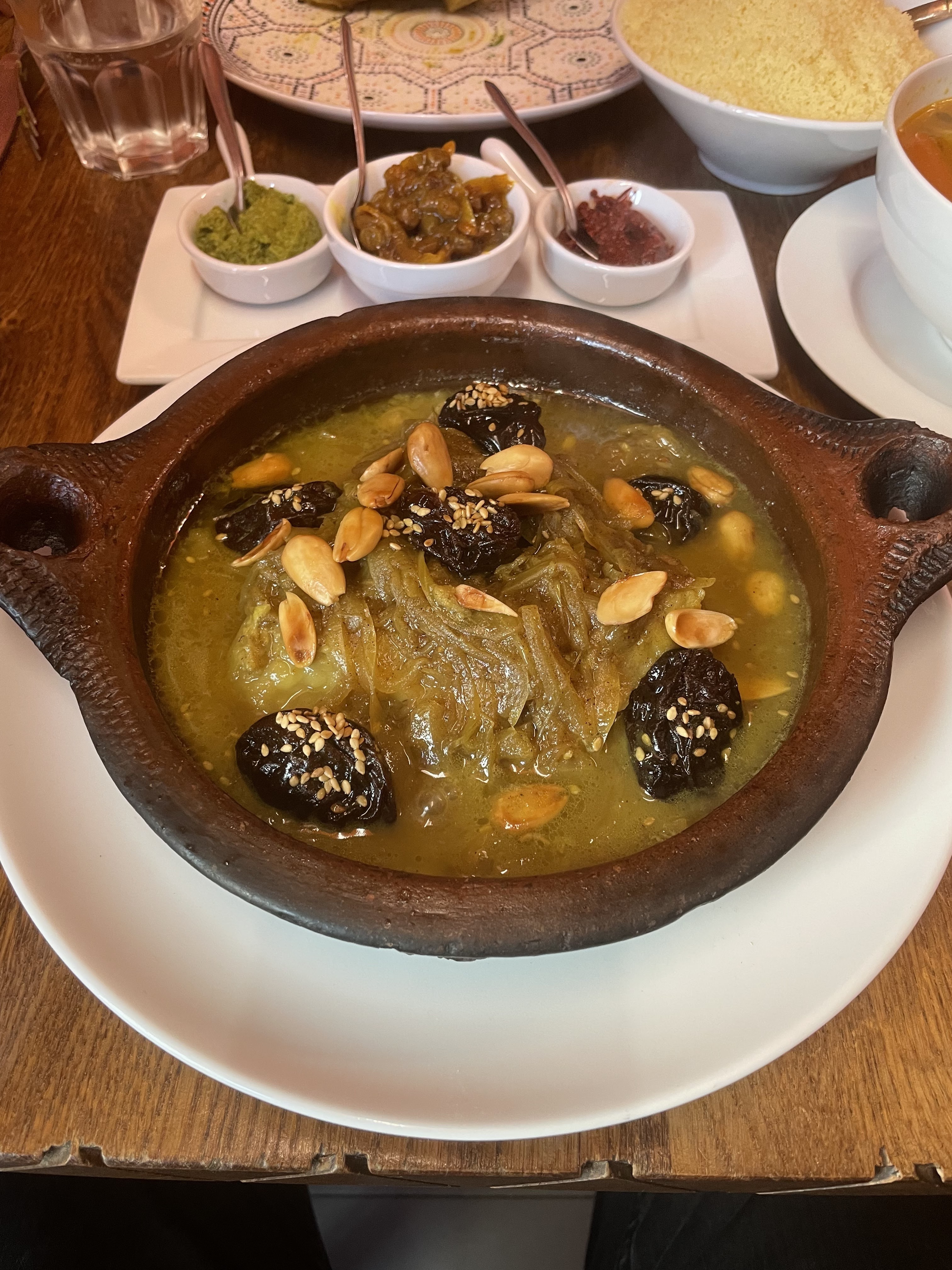 Tajine aux pruneaux de qualité et amandes remarquable servi par la patronne et qui a pensé (fait rare) a mettre une corbeille de pain chaud. Devient maintenant mon favori quand je cherche la qualité gustative et la qualité de service .