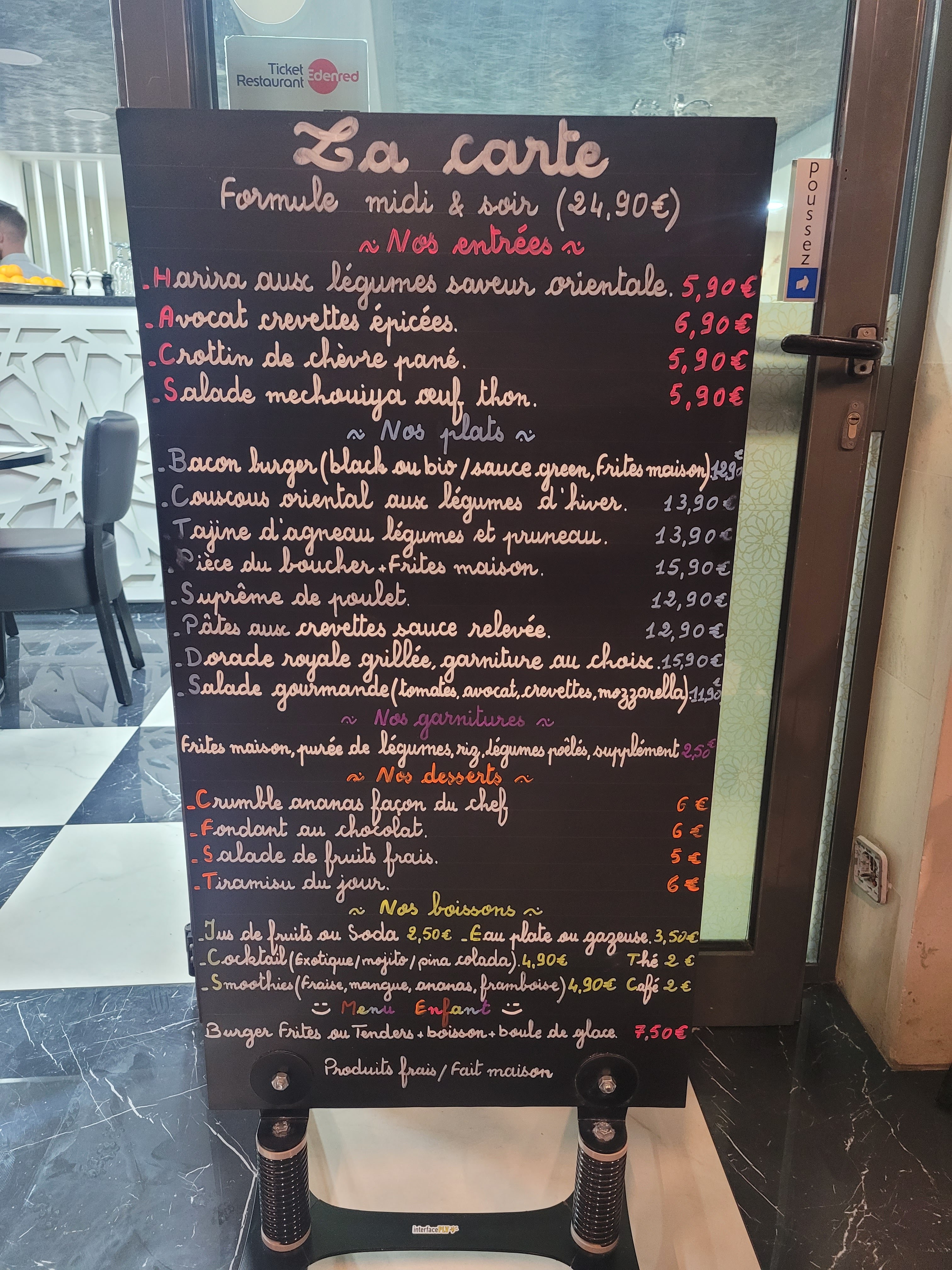 Horrible, j’y suis aller pour passer un bon moment entre copines j’ai commandé un couscous comment vous dire que ma viande sentait super fort et elle avait un arrière gout de périmé sans vous parler du burger le pain qui s’effritait, un poisson fade et des legumes passés bref FUYEZ !!!! Ne mettez pas 1€ chez eux. D’ailleurs je ne comprend pas pourquoi il est encore ouvert, il devrait être FERMER et Signaler!!