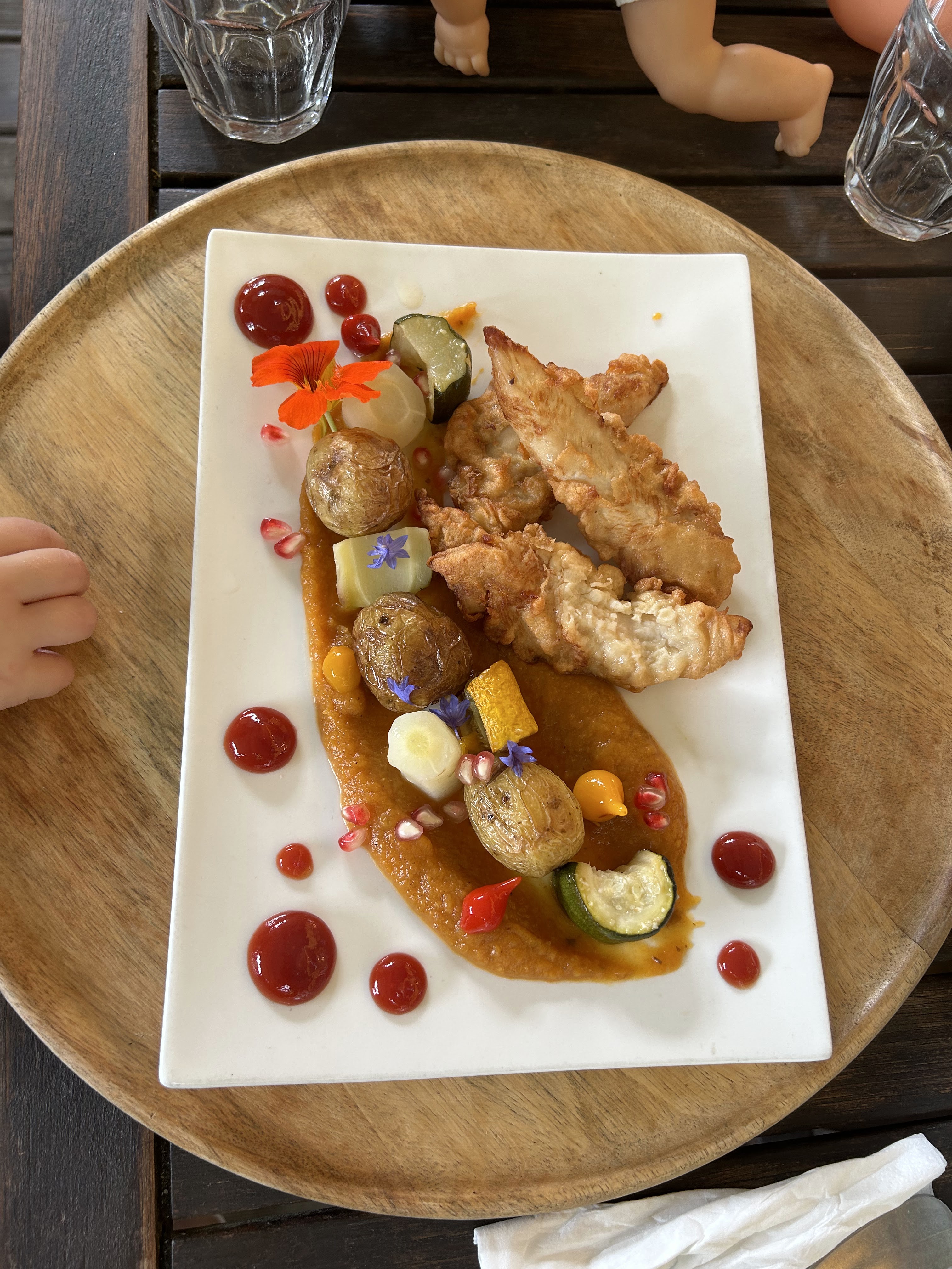 Délicieux repas en terrasse avec un menu veggie : tarte à l´ortie et aubergine farcie. Nuggets fait maison pour les enfants.