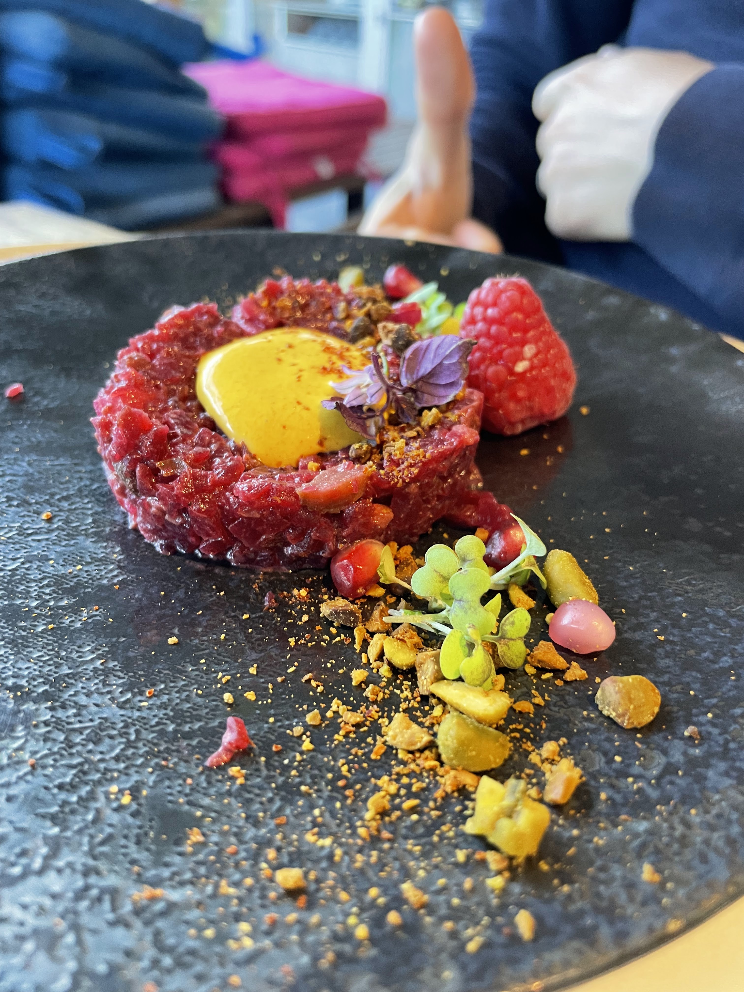 La cuisine est très raffinée mais manque de gourmandise. J'ai bien aimé ce que j'ai mangé (tartare de betterave, risotto, panna cotta) sans toutefois trouver cela excellent. Le risotto mériterait à être un peu plus crémeux, et la panna cotta passion mériterait plus de passion (pas celle du chef, elle on l'a sens 😉 ). Un peu léger pour entrée/plat/dessert. Voilà, j'espère ces critiques constructives, car autrement nous avons passé un bon moment et bien mangé !