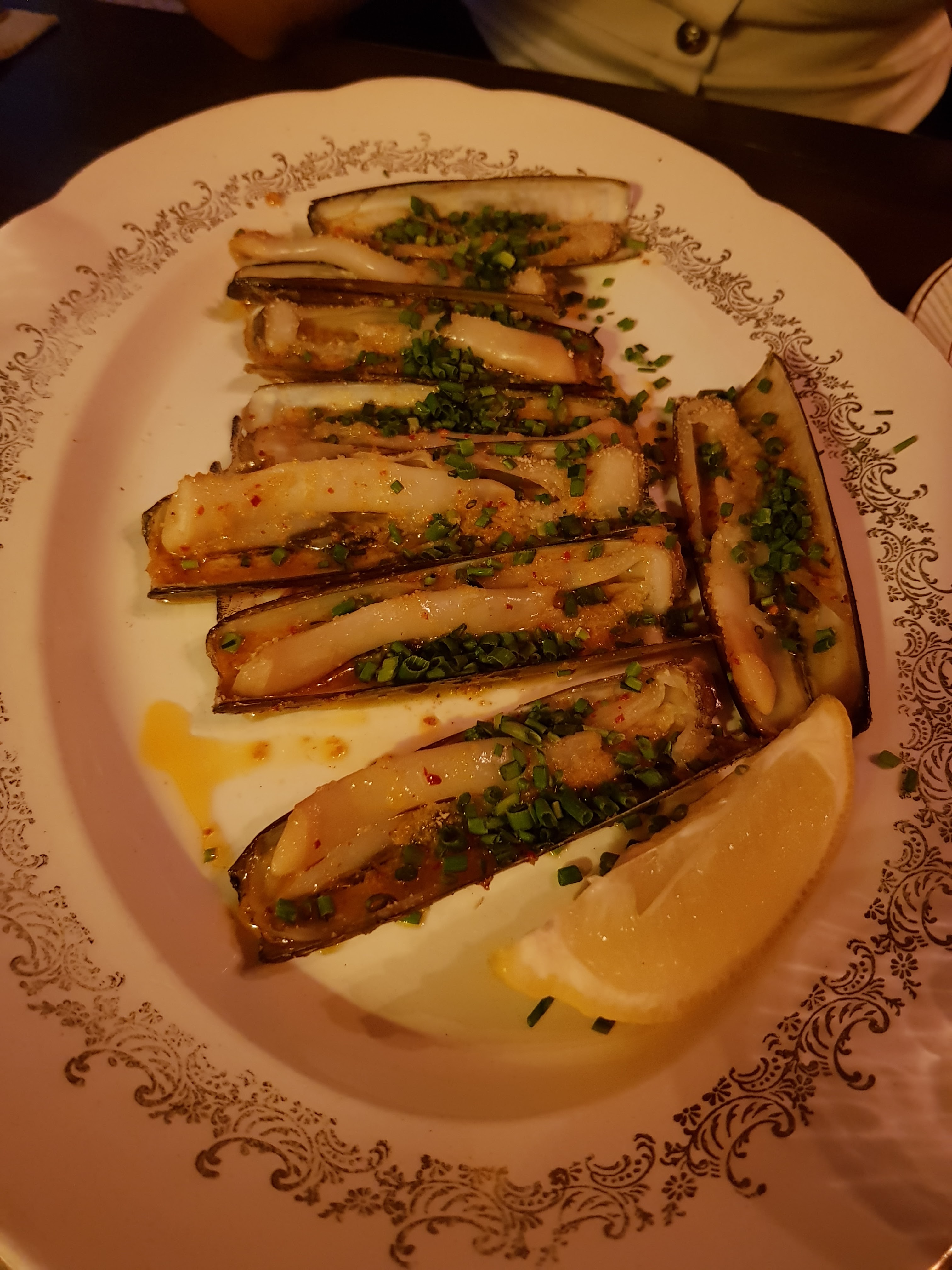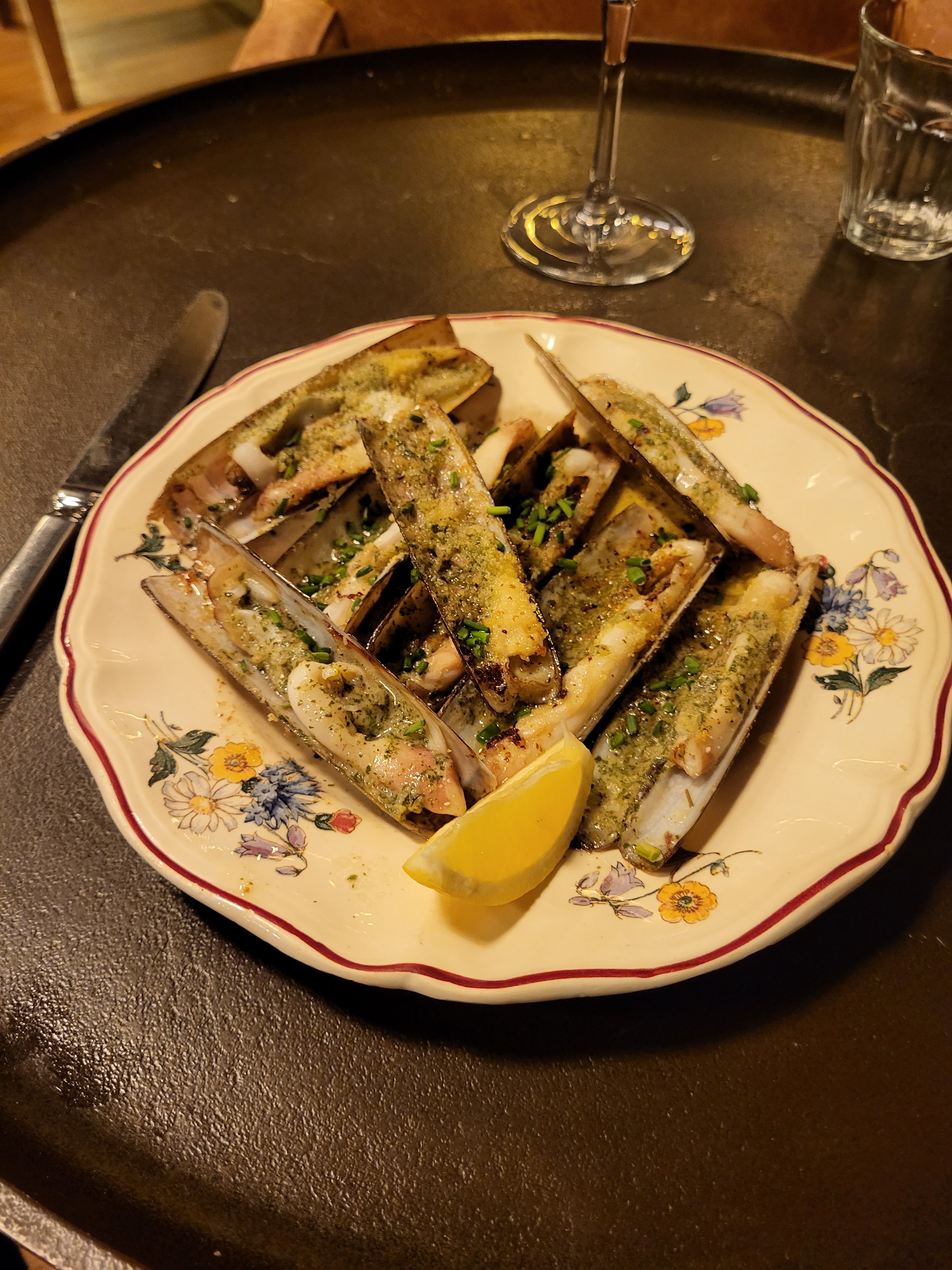 Plat choisi couteaux arrive tiède dommage (beurre cristallisé ) vin au verre commande servi à la fin du plat service très long =) manque de personnel ?