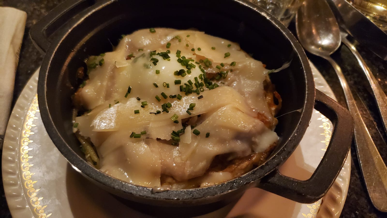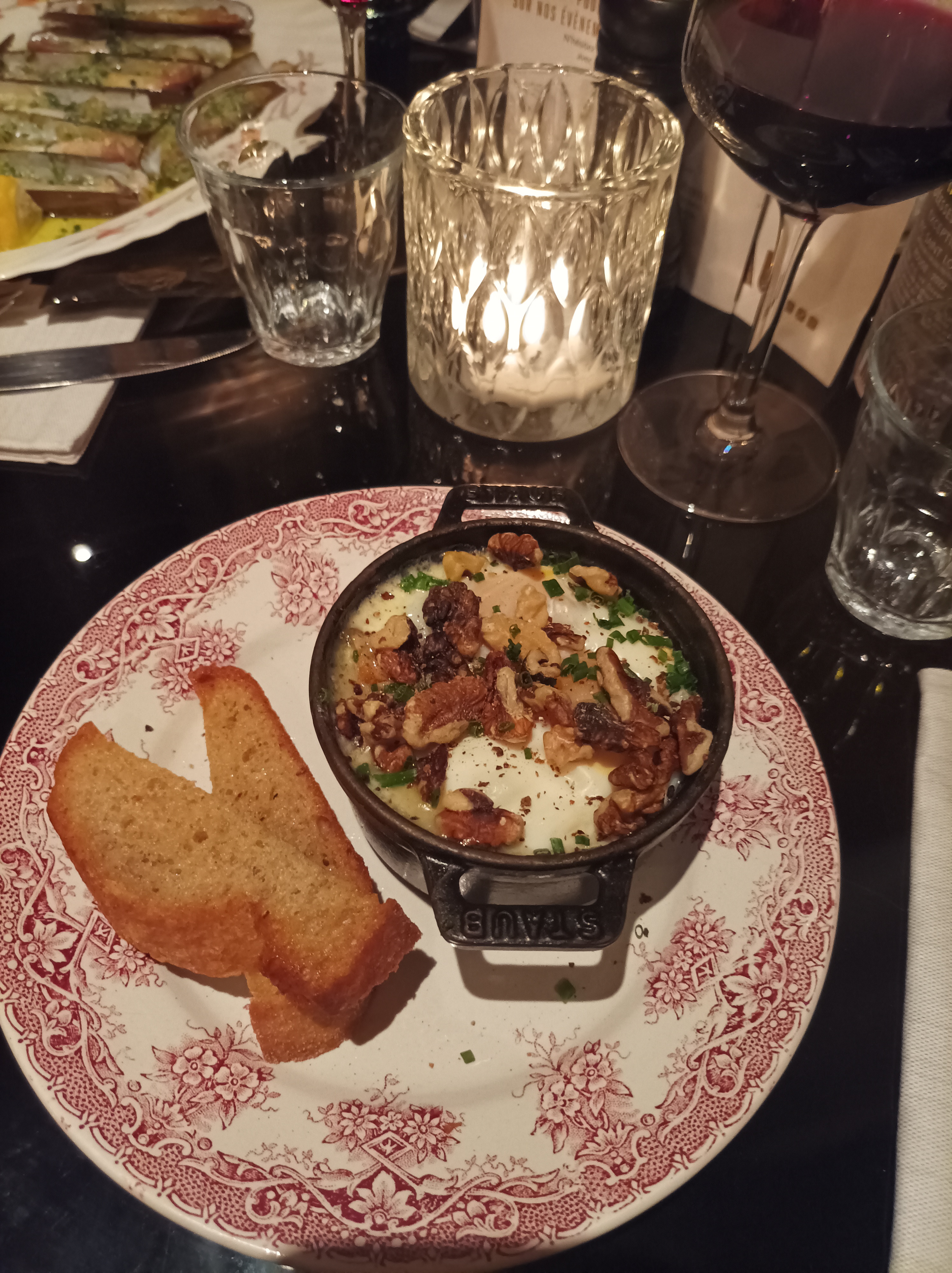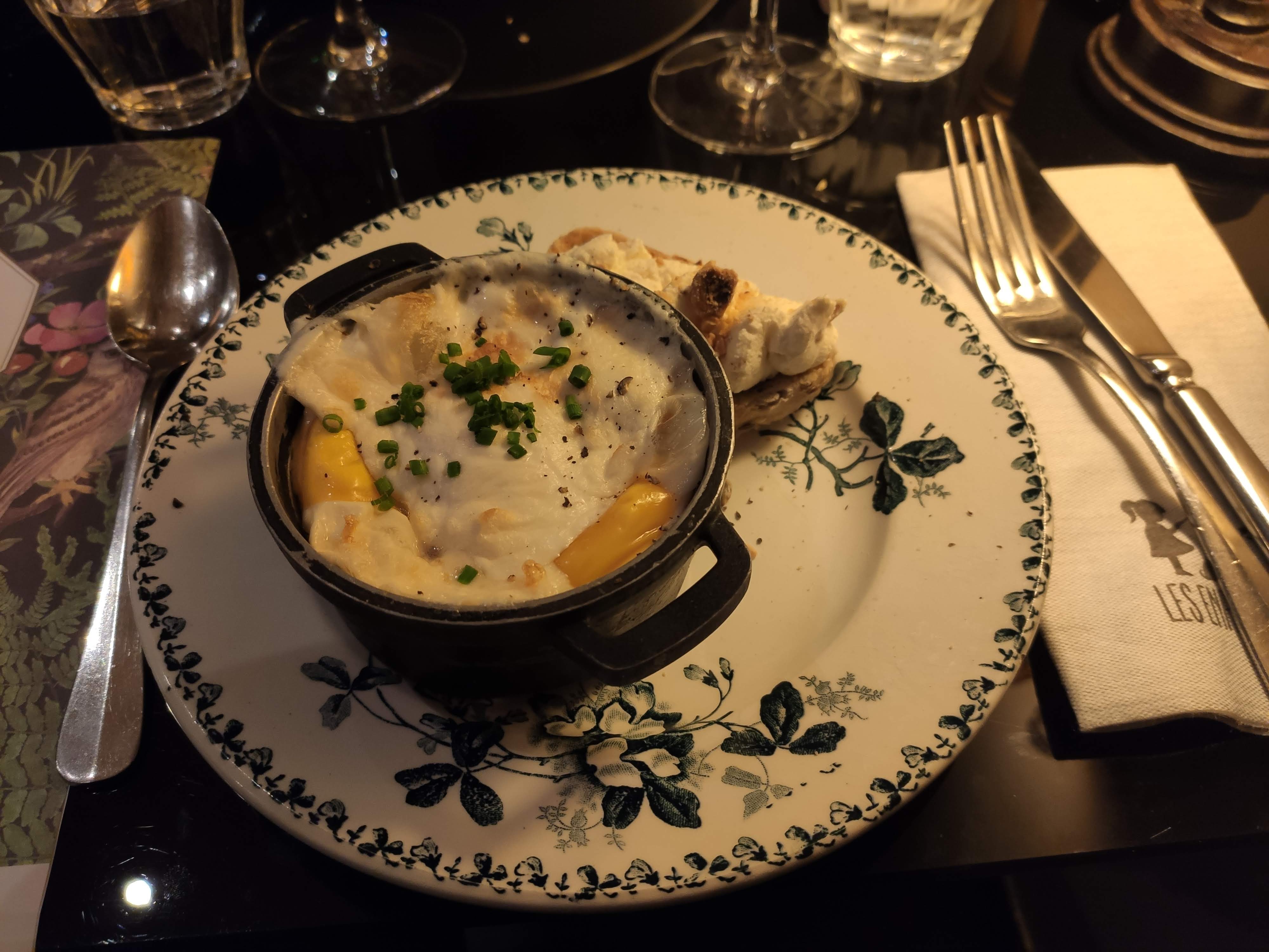 Très bel endroit, bonne ambiance, excellent service. Bizarrement, ils ont apporté notre vin pendant l'apéritif, avant le premier plat. L'escalope de veau était exagérée et la sauce à la crème fade, l'œuf coquette en entrée était très bien cuit bien qu'assez humide. Le cadre et les prix sont malheureusement plus ambitieux que la nourriture.