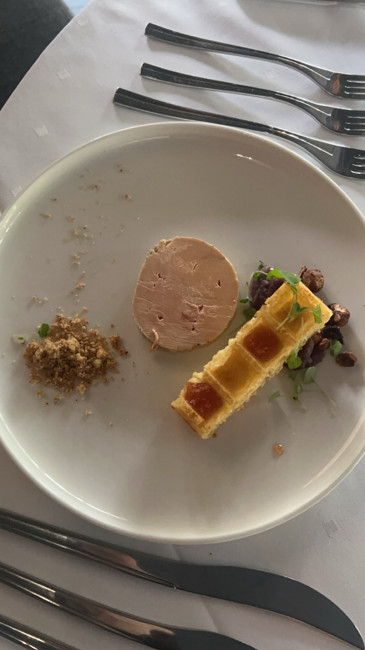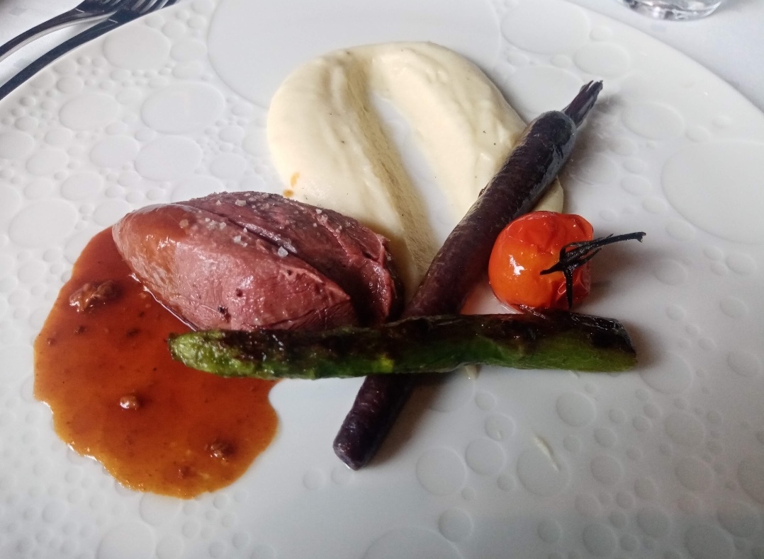 Repas succulent, savoureux et joliment présenté ; j'ai vraiment apprécié ce que l'on m'a servi. Une demande de plat végétarien a été faite au dernier moment et il a été proposé d'improviser un plat ce qui a été serviable et il aurait été excellent, j'en suis convaincu. À une période durant laquelle les impacts environnementaux sont de plus en plus forts et visibles, il aurait été préférable que le menu intègre déjà, au moins, une entrée et un plat végétarien pour donner l'opportunité au client d'allier raffinement en cuisine et respect de l'environnement. Mettre en avant ce type de cuisine moins impactante sur les ressources en eau et le changement climatique, notamment, a une grande importance et il y a clairement la créativité et le savoir-faire en cuisine pour répondre à ce type d'enjeu de manière raffinée.