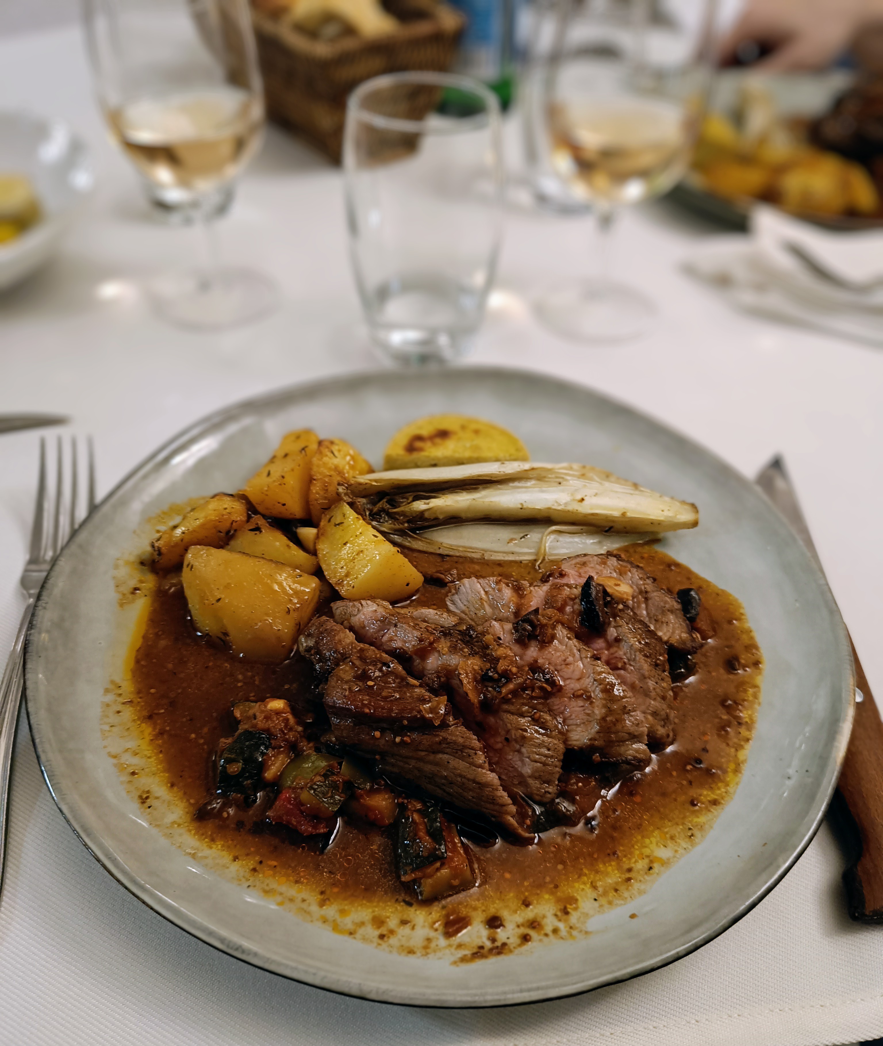 Le vin était délicieux. La nourriture était très bien préparée. Les pommes de terre étaient probablement l'une des meilleures choses que j'ai jamais mangées. Je veux connaître leur secret. Le service était solide. Aucune plainte. Les prix sont raisonnables compte tenu de la région. J'ai adoré l'emplacement dans la mesure où il est légèrement hors des sentiers battus. Les seuls reproches mineurs sont que le poisson était trop cuit et que la salade était extrêmement grasse. Ils avaient aussi des coupes de champagne vraiment cool que je n'avais jamais vues auparavant.